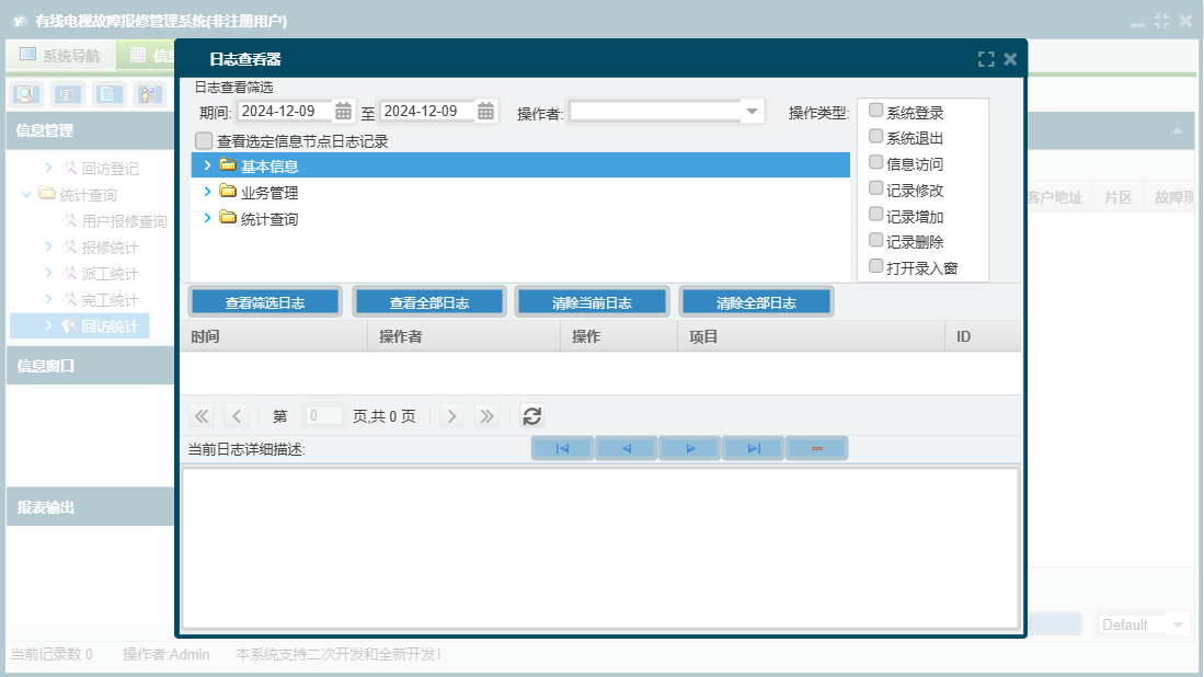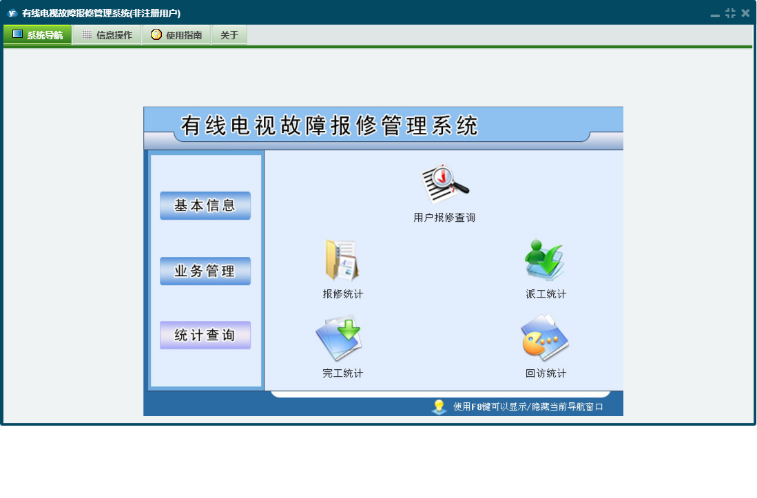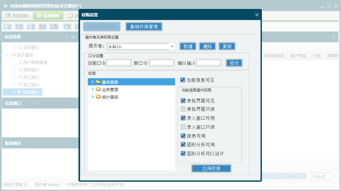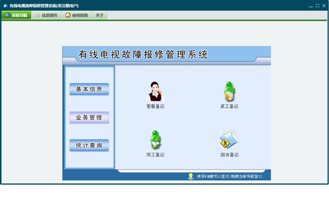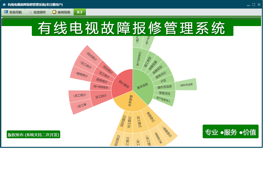 有线电视故障报修管理系统包含以下功能:客服登记、日志、关于、客户信息登记、操作员信息、派工登记、权限设置、完工登记、基本信息、统计查询、回访登记、业务管理等
