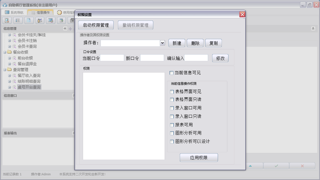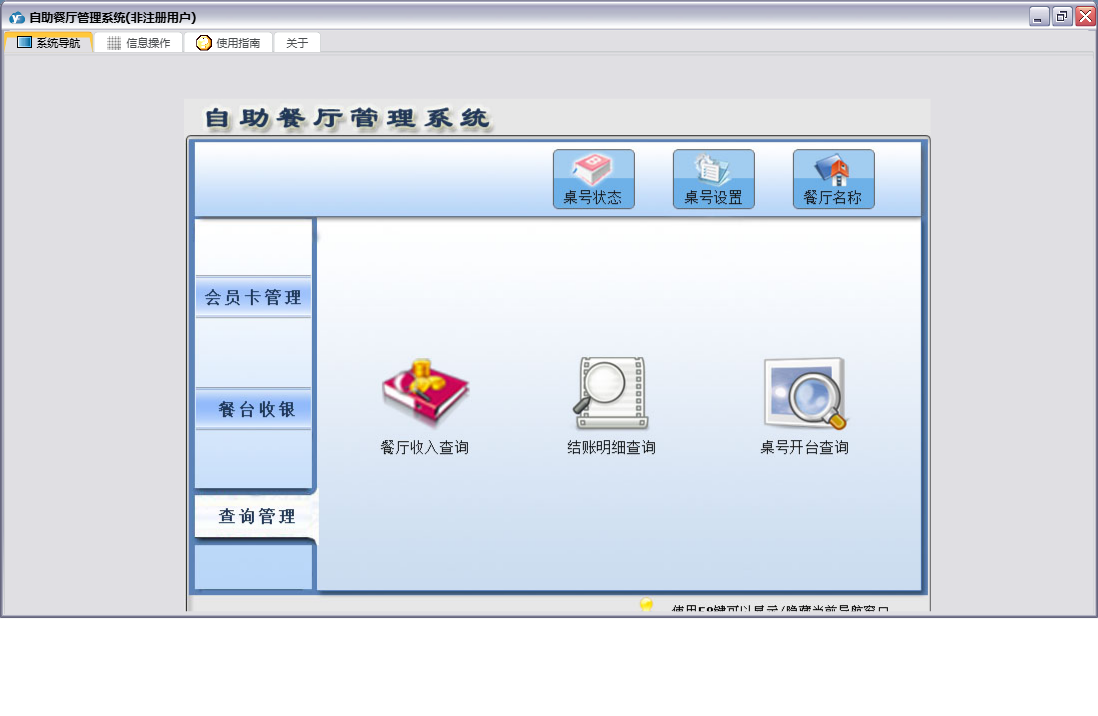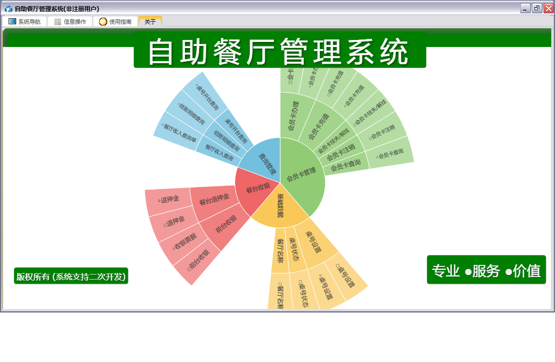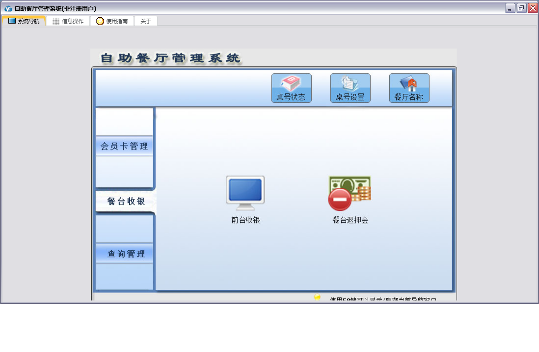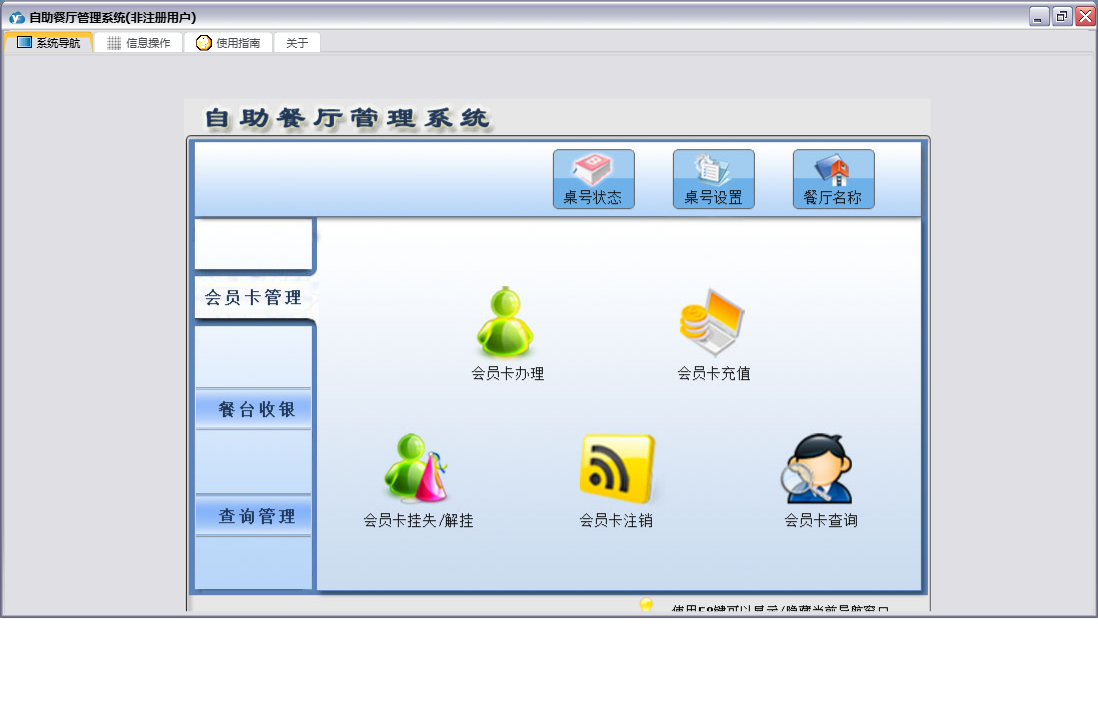 自助餐厅管理系统包含以下功能:会员卡注销、会员卡办理、餐厅名称、桌号设置、前台收银、日志、餐台收银、关于、权限设置、桌号状态、会员卡管理、餐台退押金、会员卡挂失、查询管理、会员卡充值等