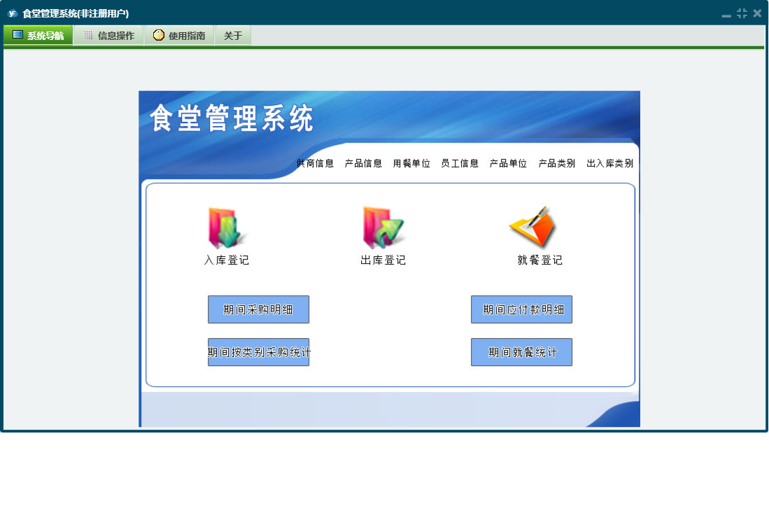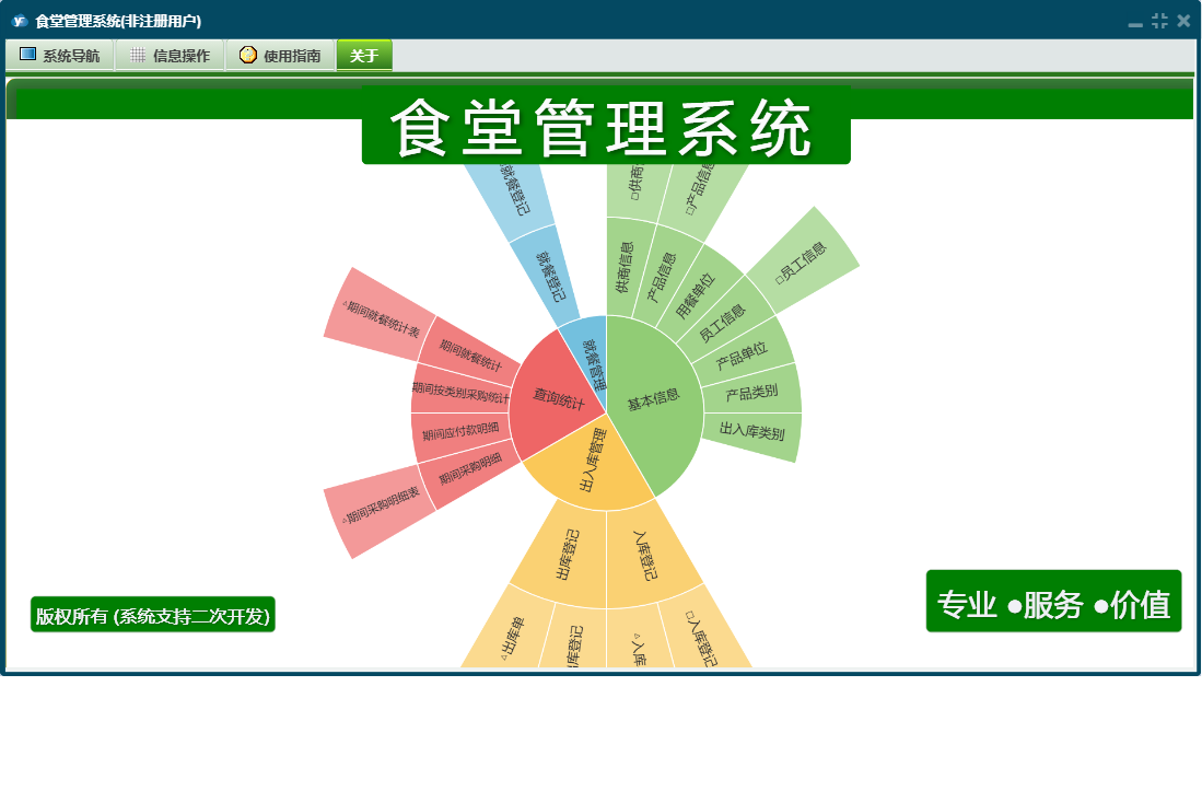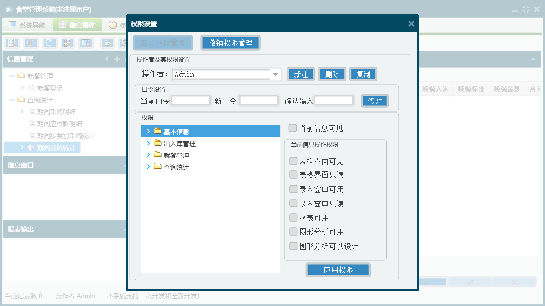食堂管理系统包含以下功能:关于、权限设置、面板、日志等