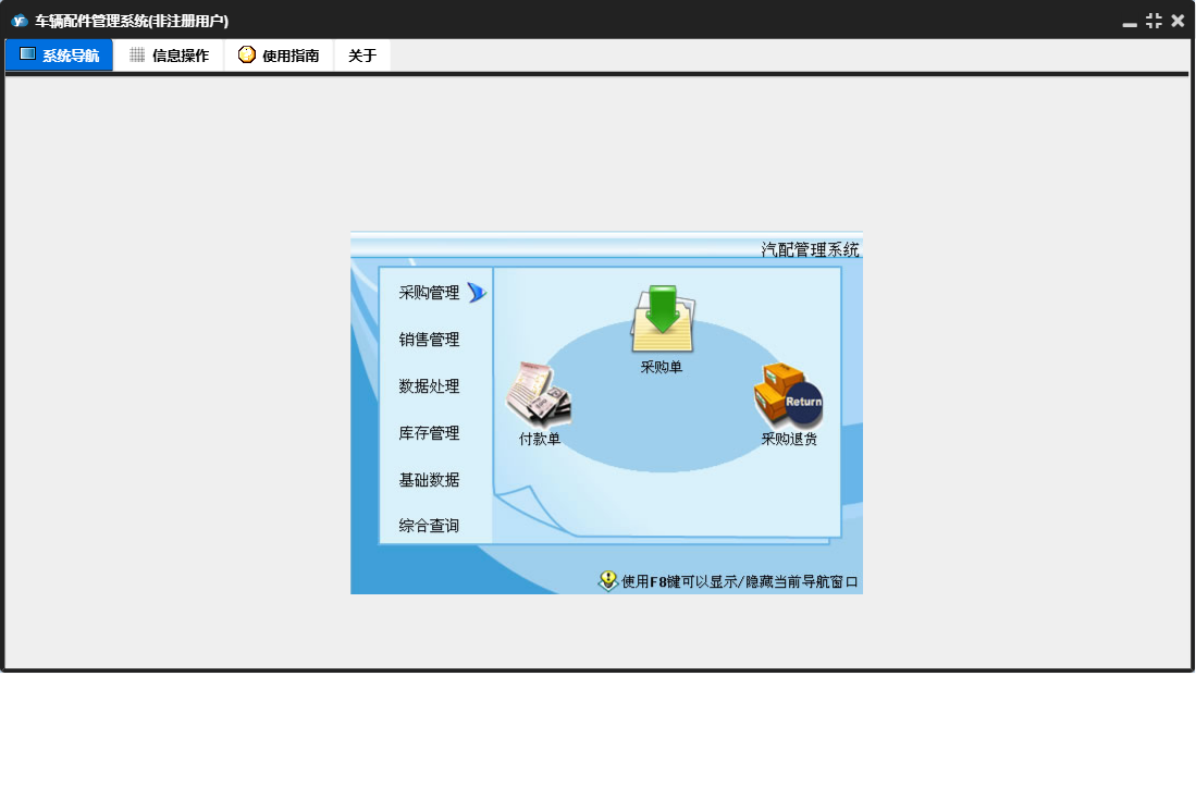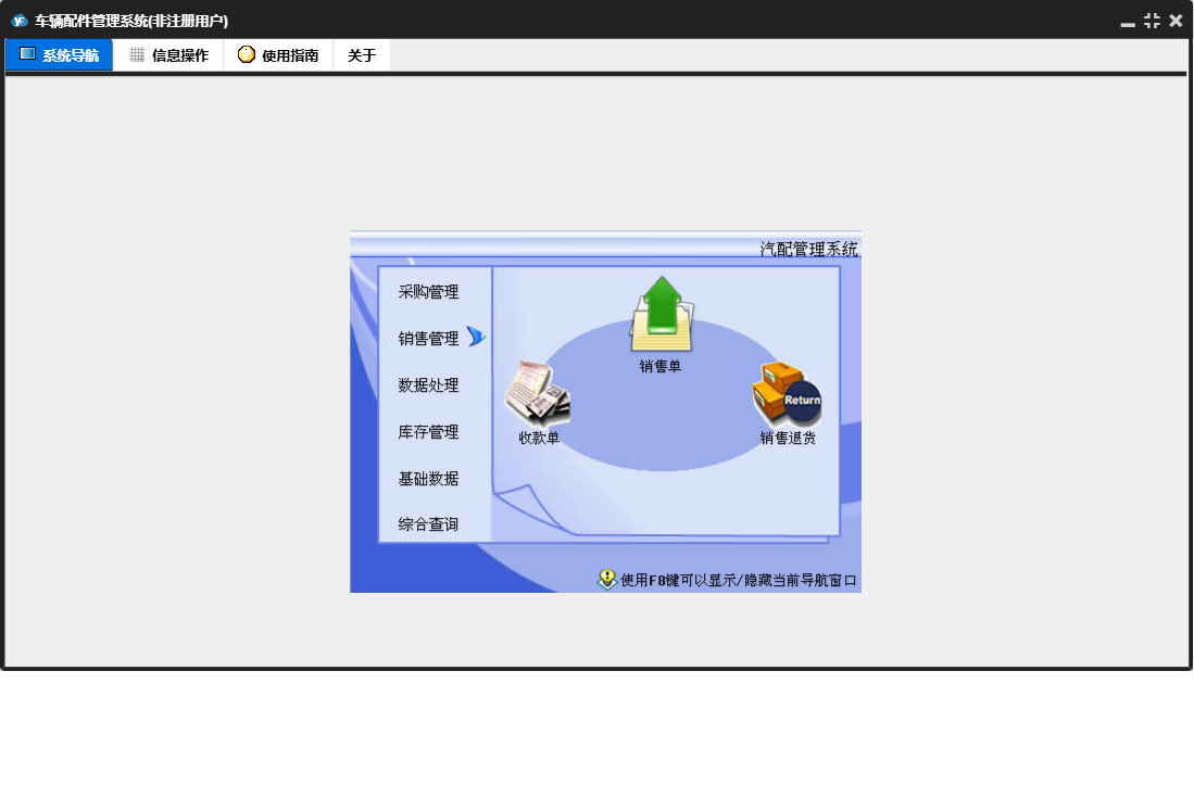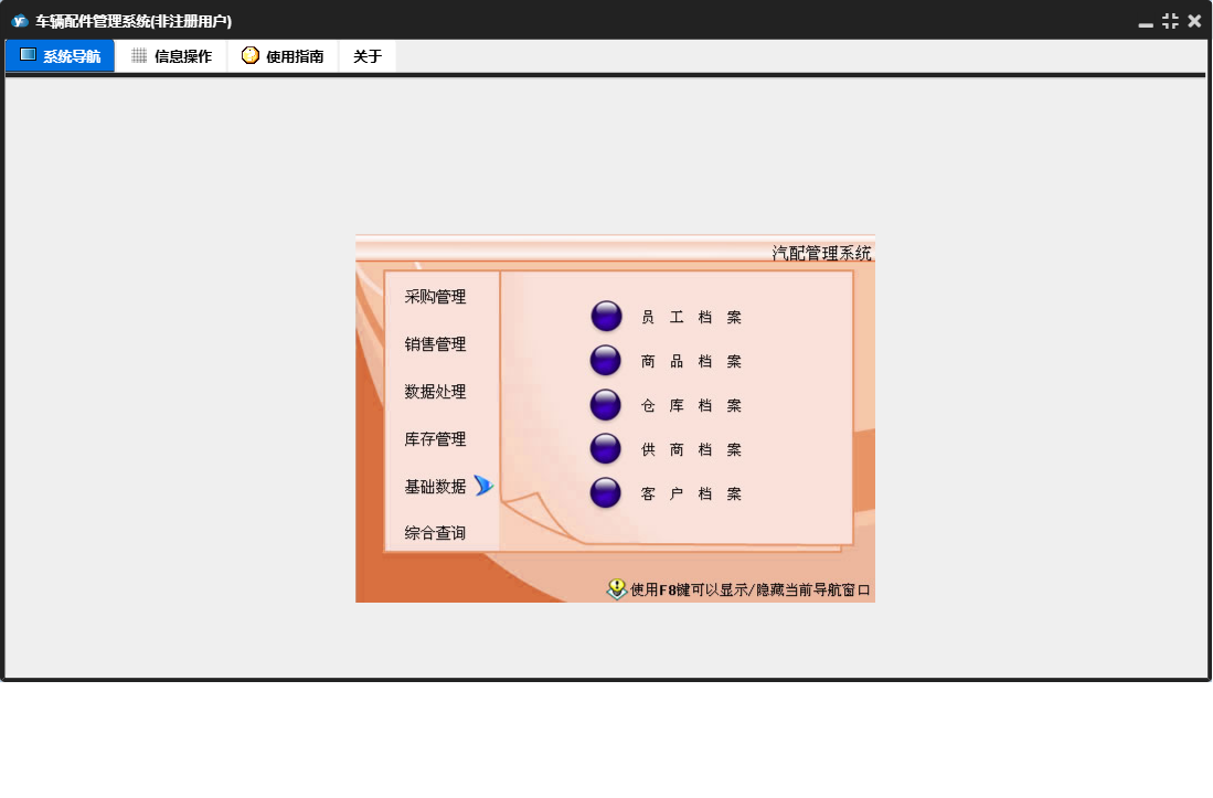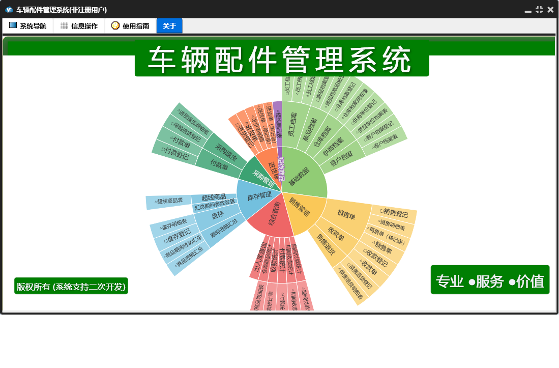 车辆配件管理系统包含以下功能:销售管理、付款单、进货单、综合查询、销售单、基础数据、商品档案、数据处理、收款单、销售退货、供商档案、权限设置、盘存、客户档案、采购退货、仓库档案、库存管理、关于、员工档案、日志、采购管理等