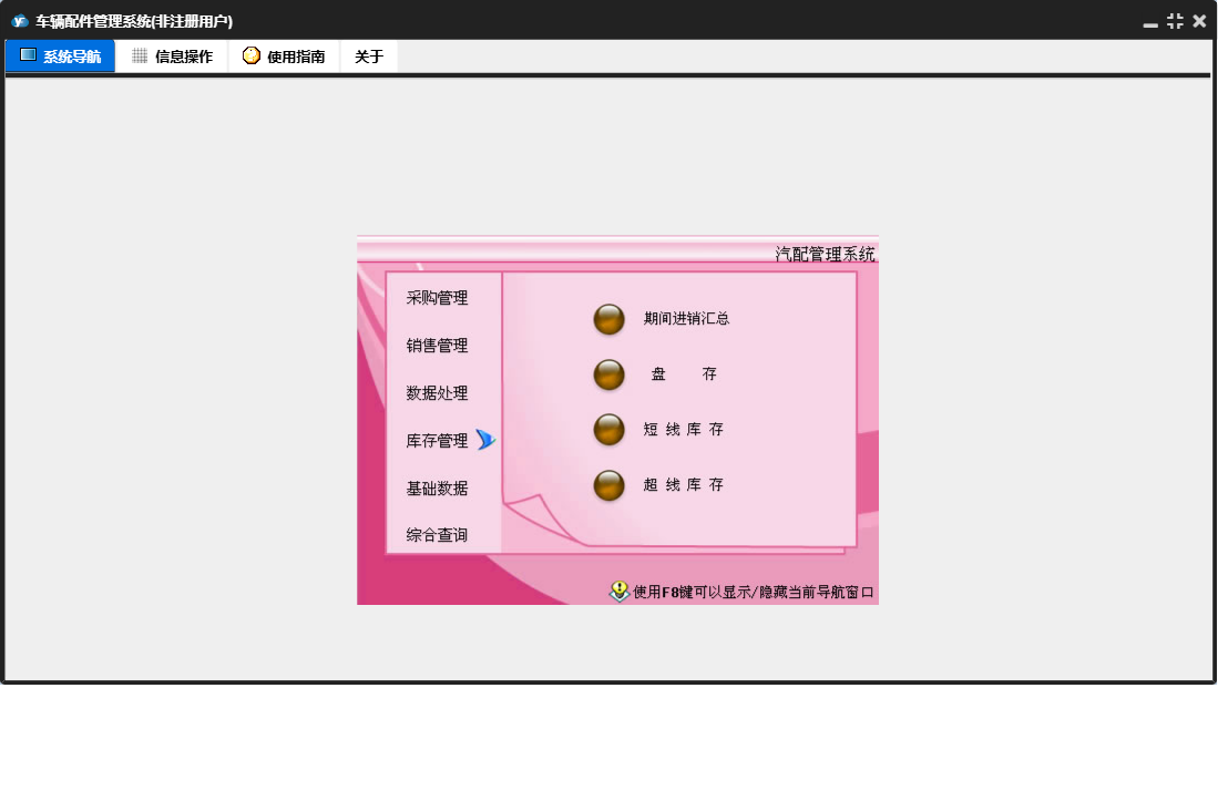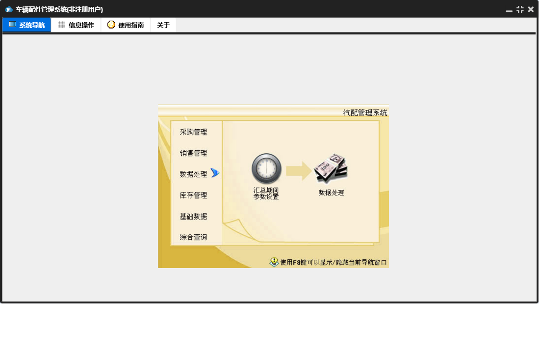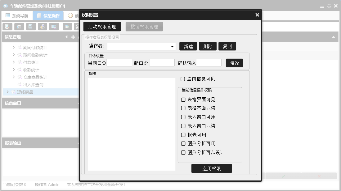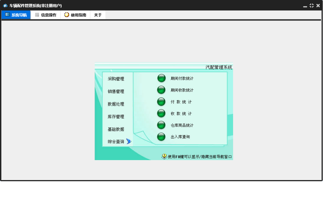 车辆配件管理系统包含以下功能:销售管理、付款单、进货单、综合查询、销售单、基础数据、商品档案、数据处理、收款单、销售退货、供商档案、权限设置、盘存、客户档案、采购退货、仓库档案、库存管理、关于、员工档案、日志、采购管理等