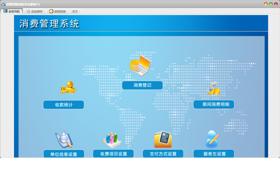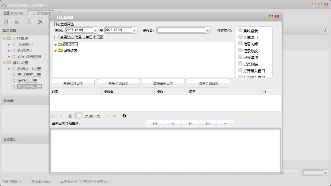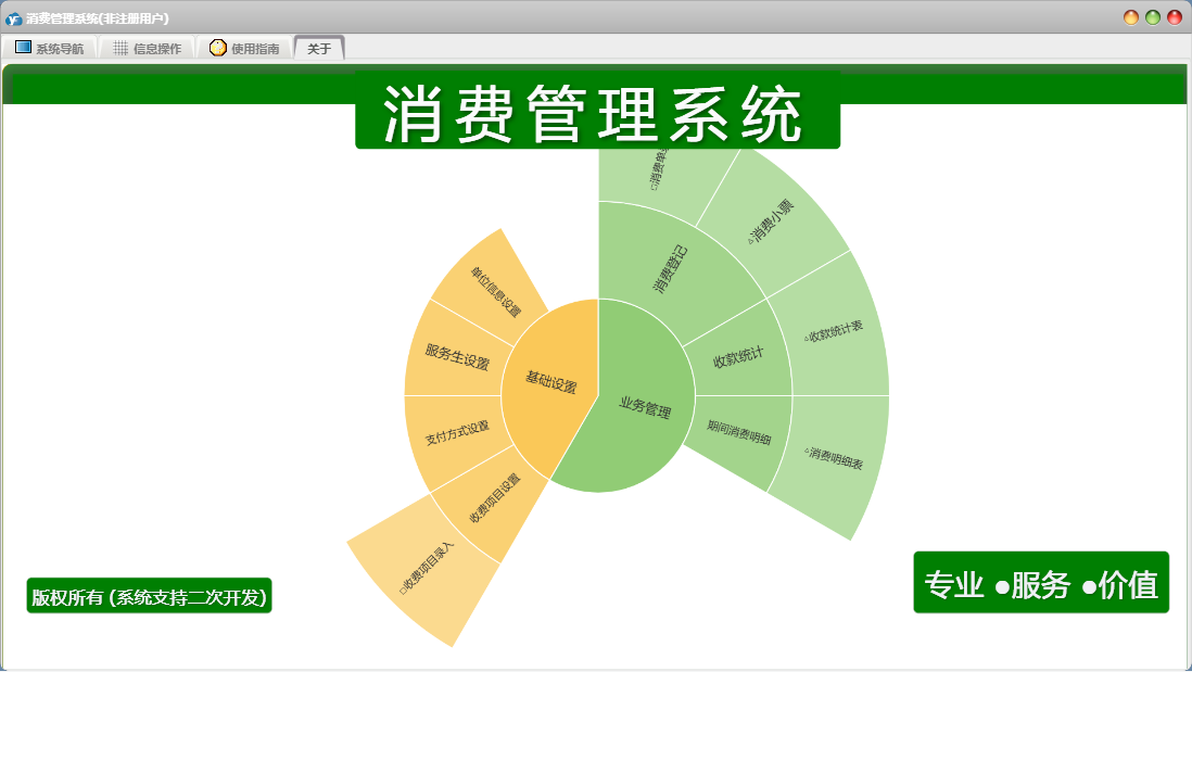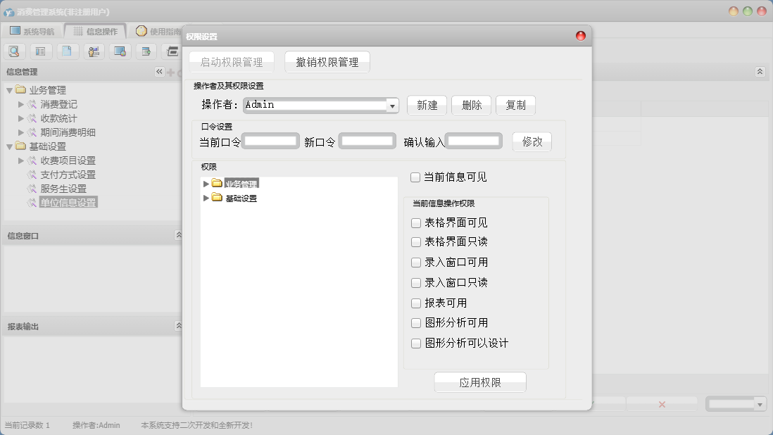 消费管理系统包含以下功能:11、收费项目设置、日志、关于、权限设置、消费登记等