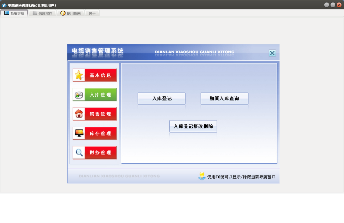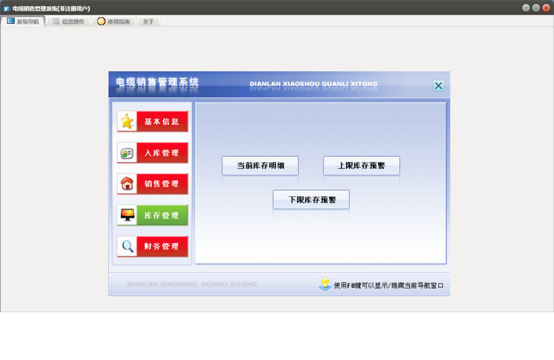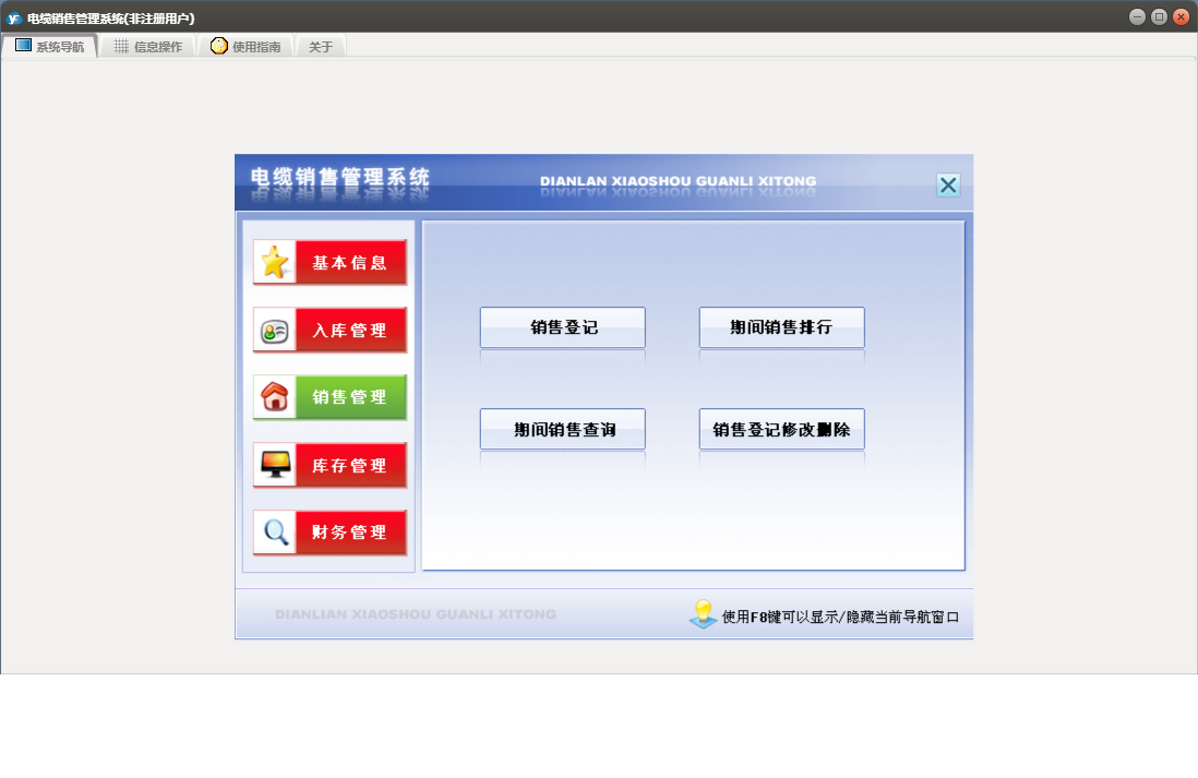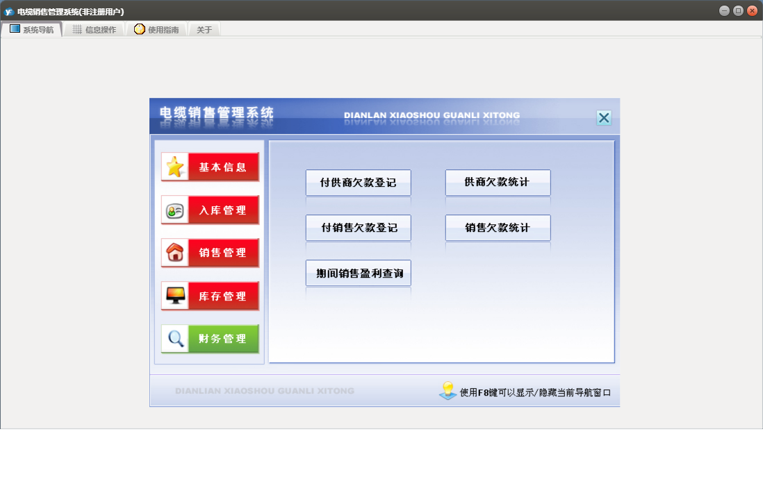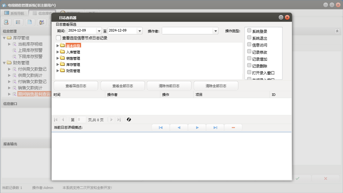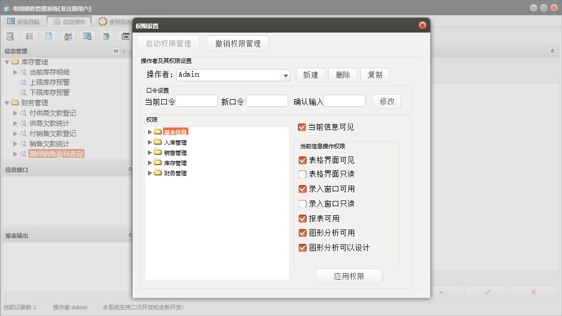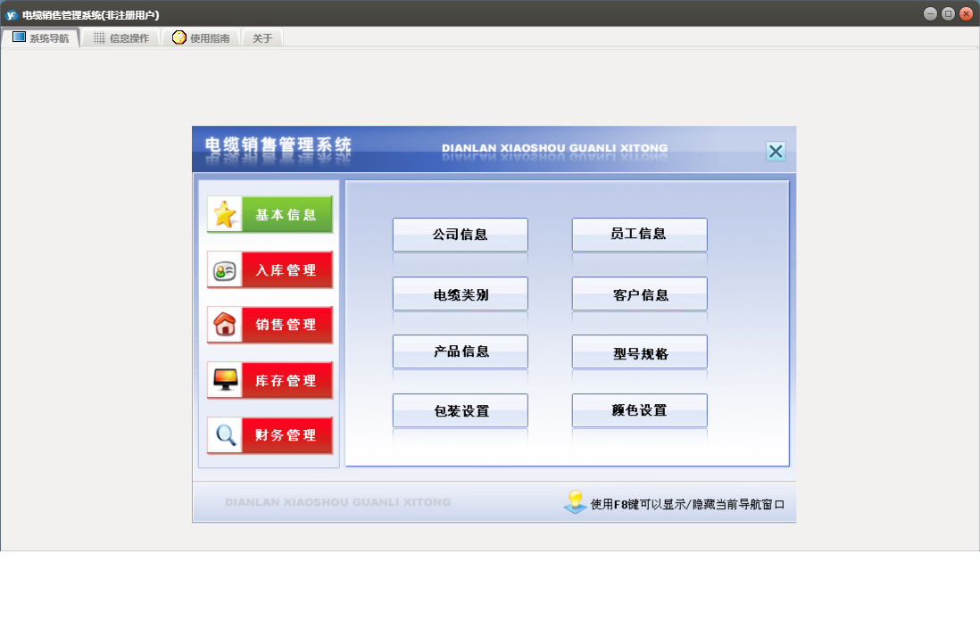 电缆销售管理系统包含以下功能:电缆类别、销售管理、产品信息、财务管理、付供商欠款登记、入库登记修改删除、入库登记、公司信息、权限设置、库存管理、型号规格、关于、销售登记、基本信息、客户信息、销售登记修改删除、付销售欠款登记、入库管理、员工信息、日志等