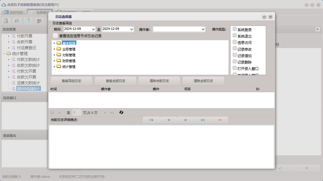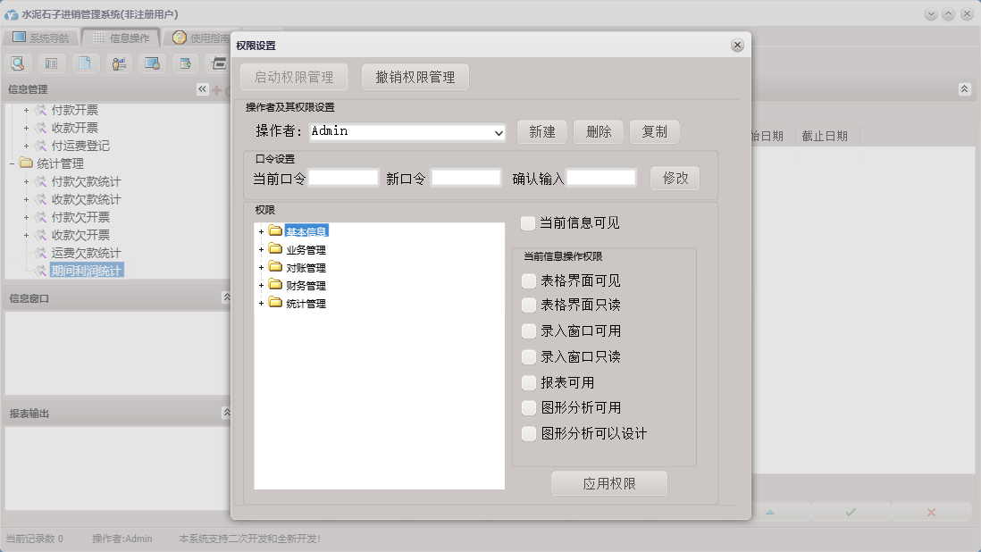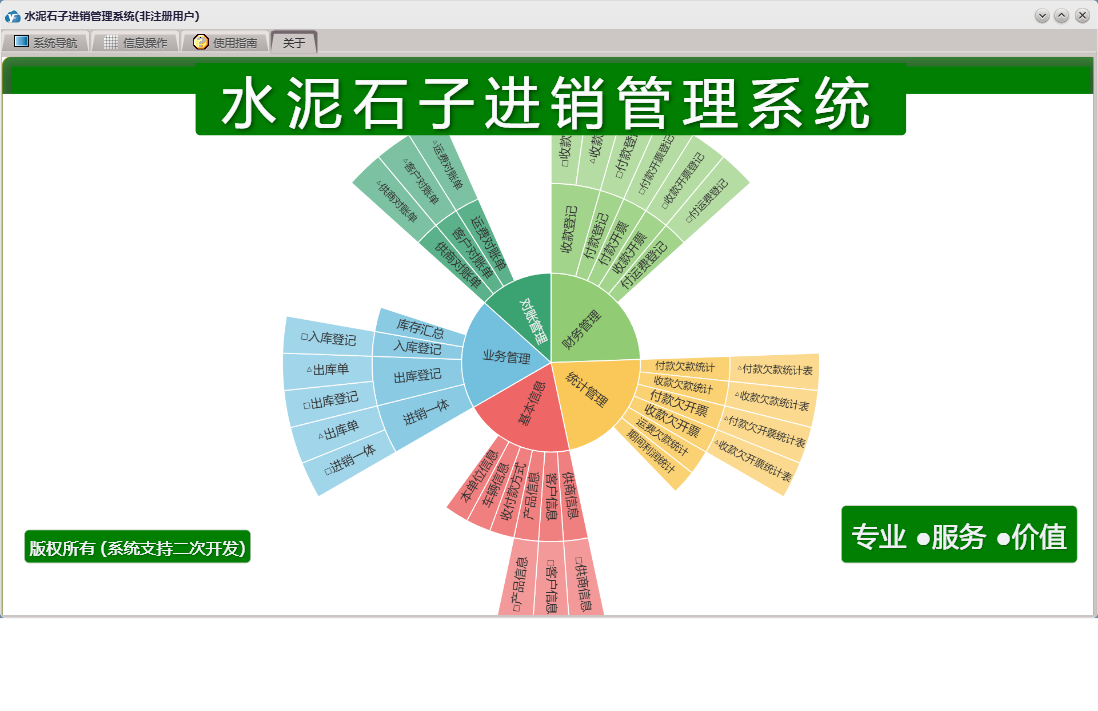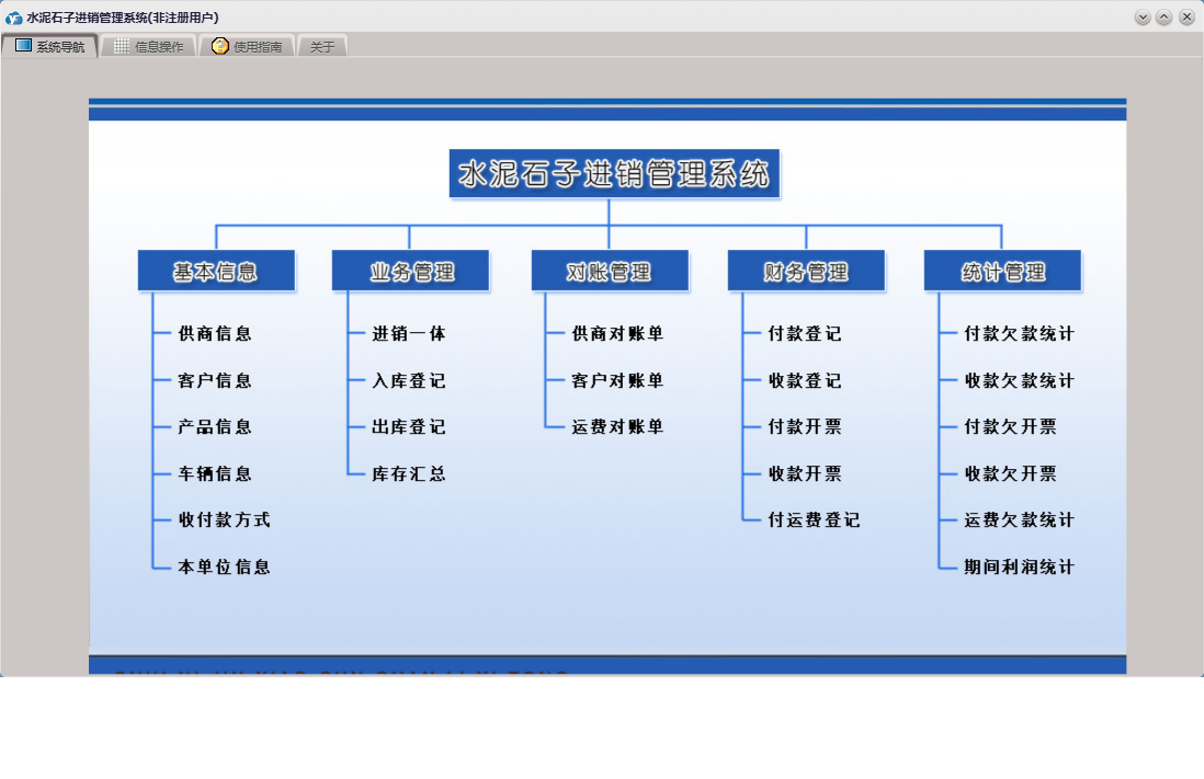 水泥石子进销管理系统包含以下功能:面板、入库登记、供商信息、付款登记、出库登记、付款开票、收款开票、日志、关于、进销一体、权限设置、产品信息、客户信息、收款登记、付运费登记等