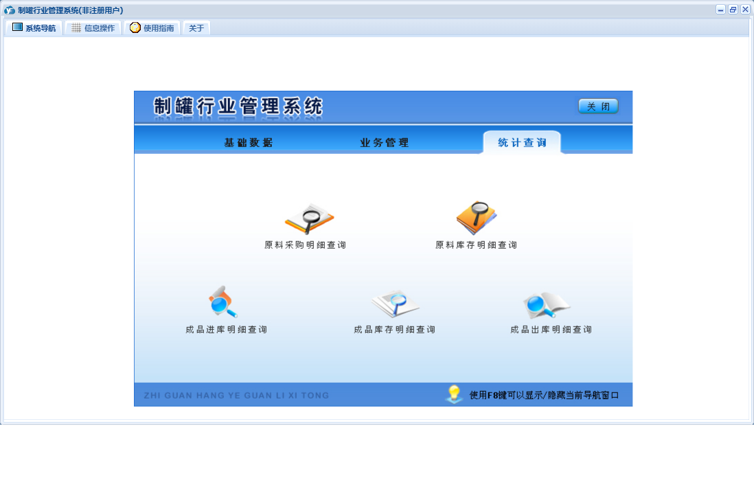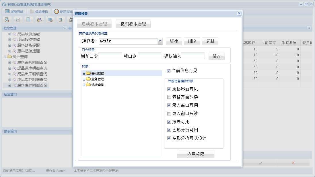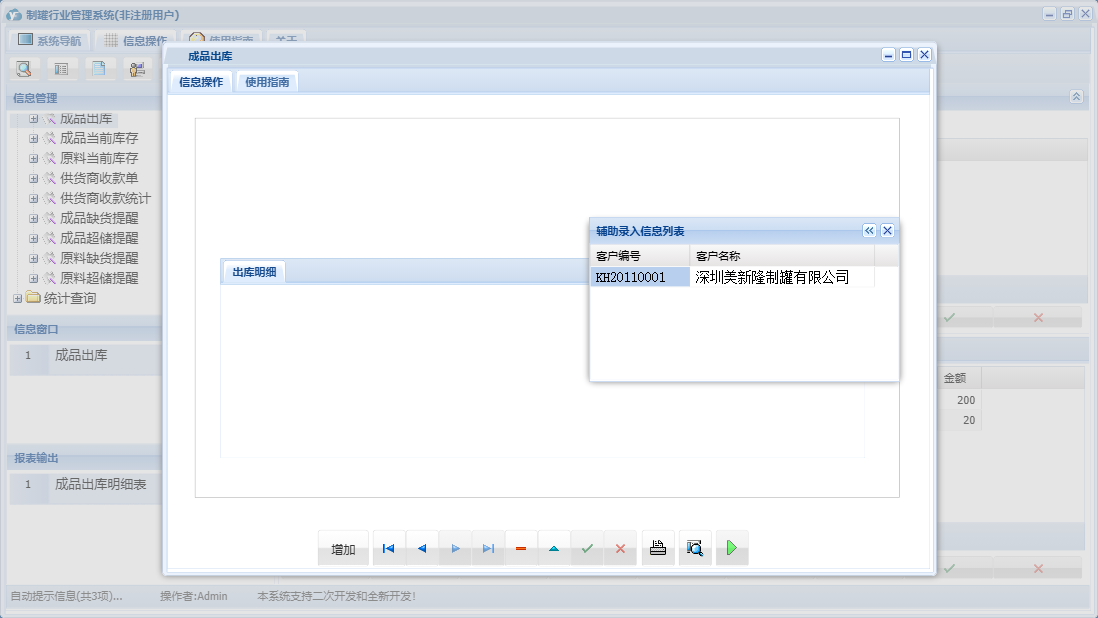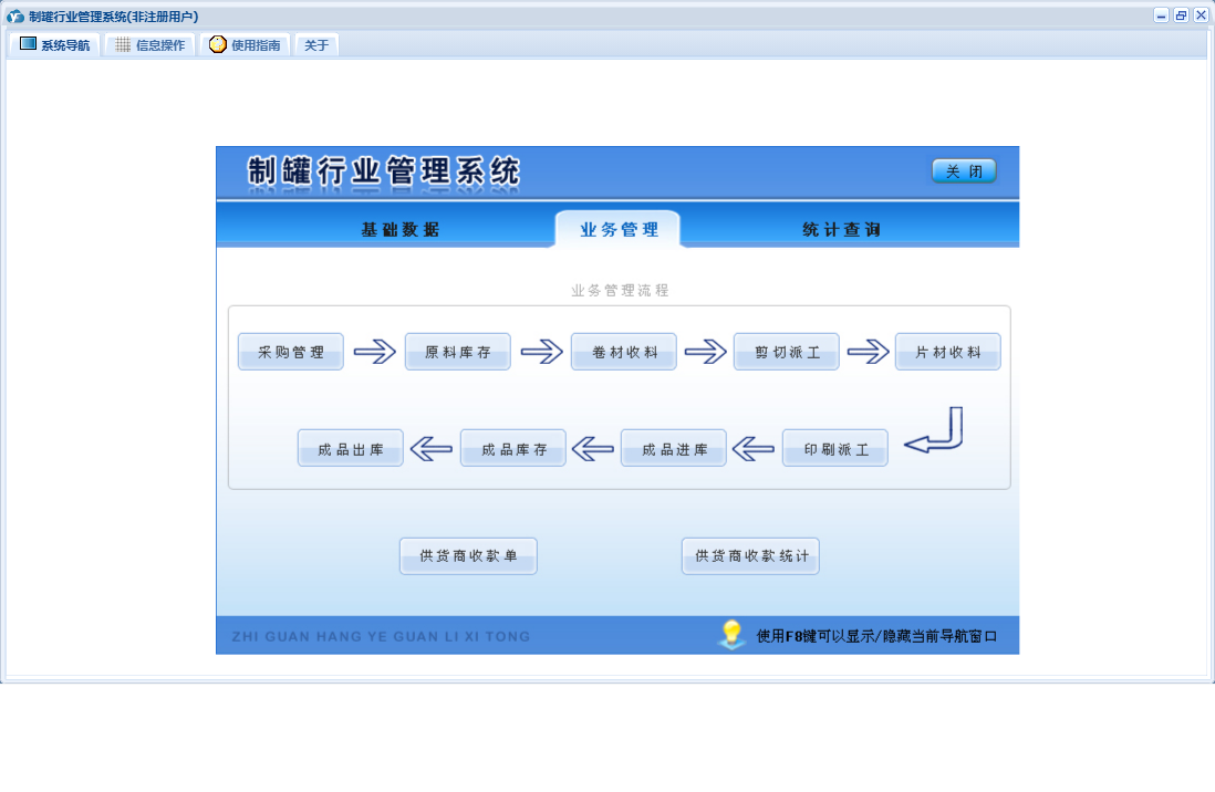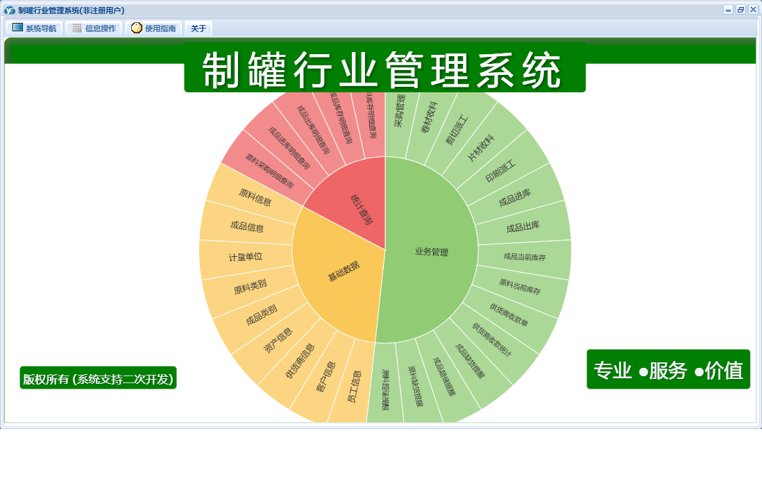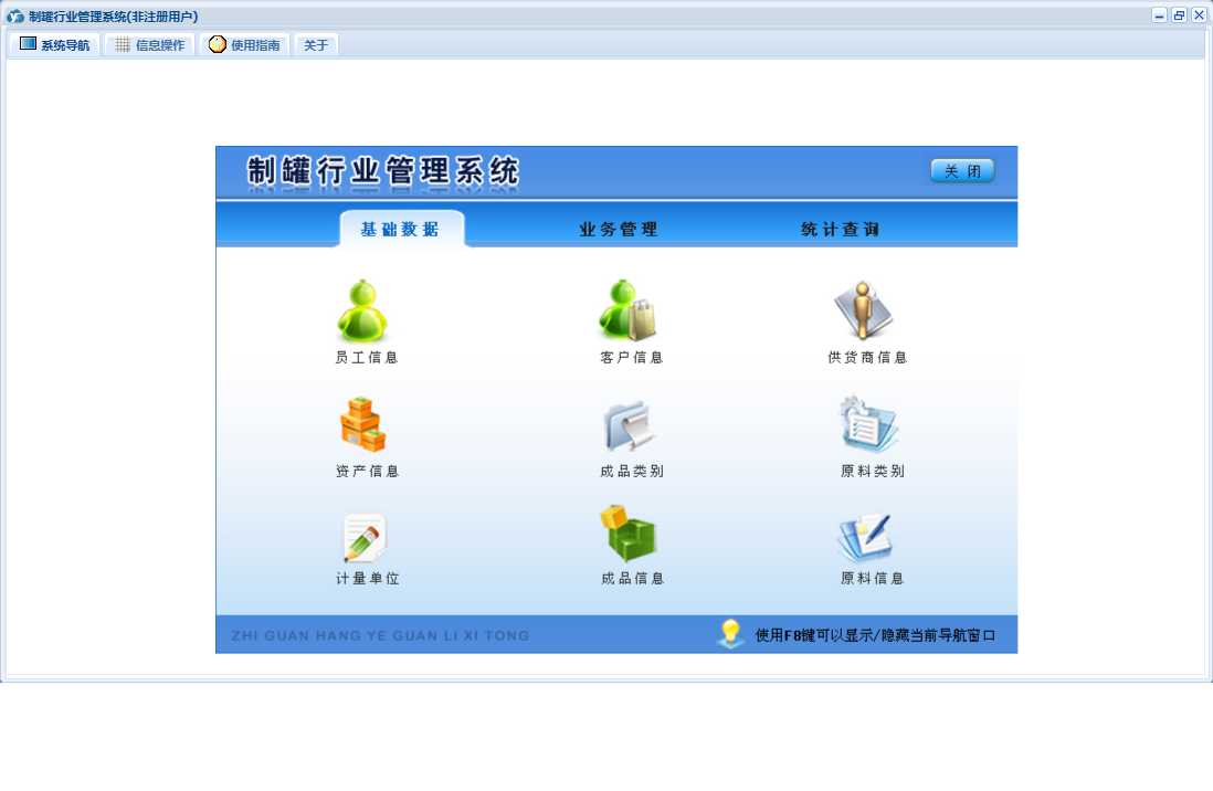 制罐行业管理系统包含以下功能:成品类别、成品进库、成品信息、基础数据、资产信息、印刷派工、统计查询、权限设置、片材收料、原料类别、原料信息、卷材收料、关于、客户信息、业务管理、成品出库、员工信息、供货商收款单、供货商信息、日志、采购管理、剪切派工、计量单位等
