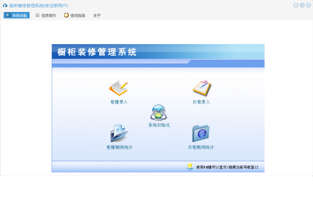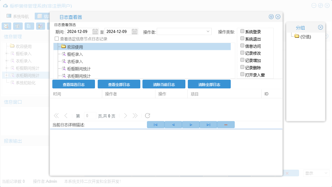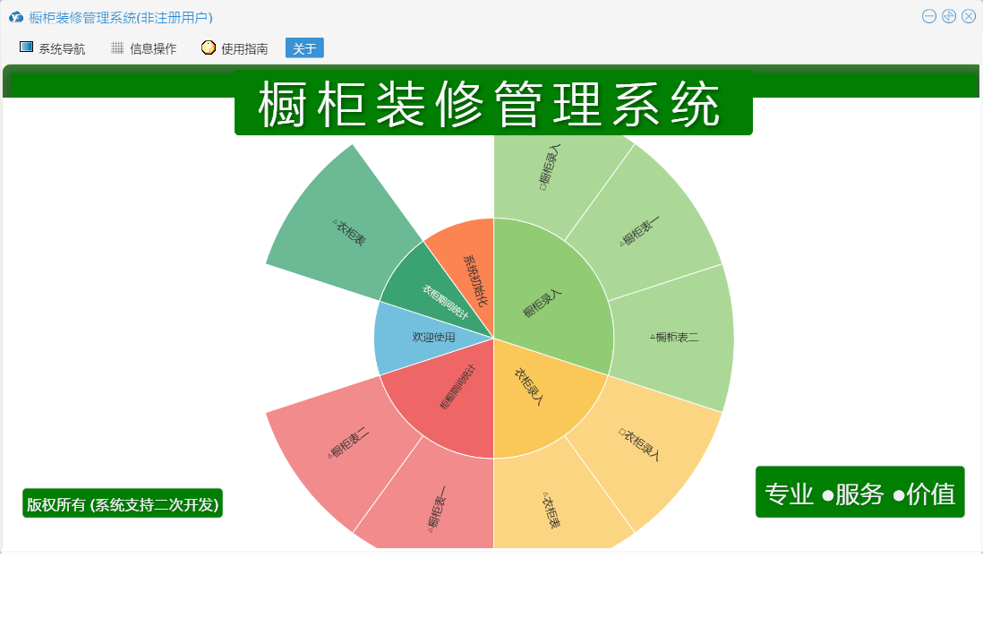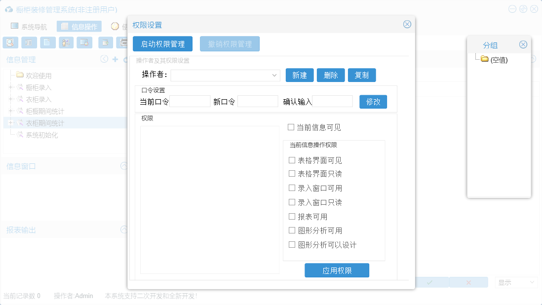 橱柜装修管理系统包含以下功能:面板、橱柜录入、衣柜录入、日志、关于、权限设置等