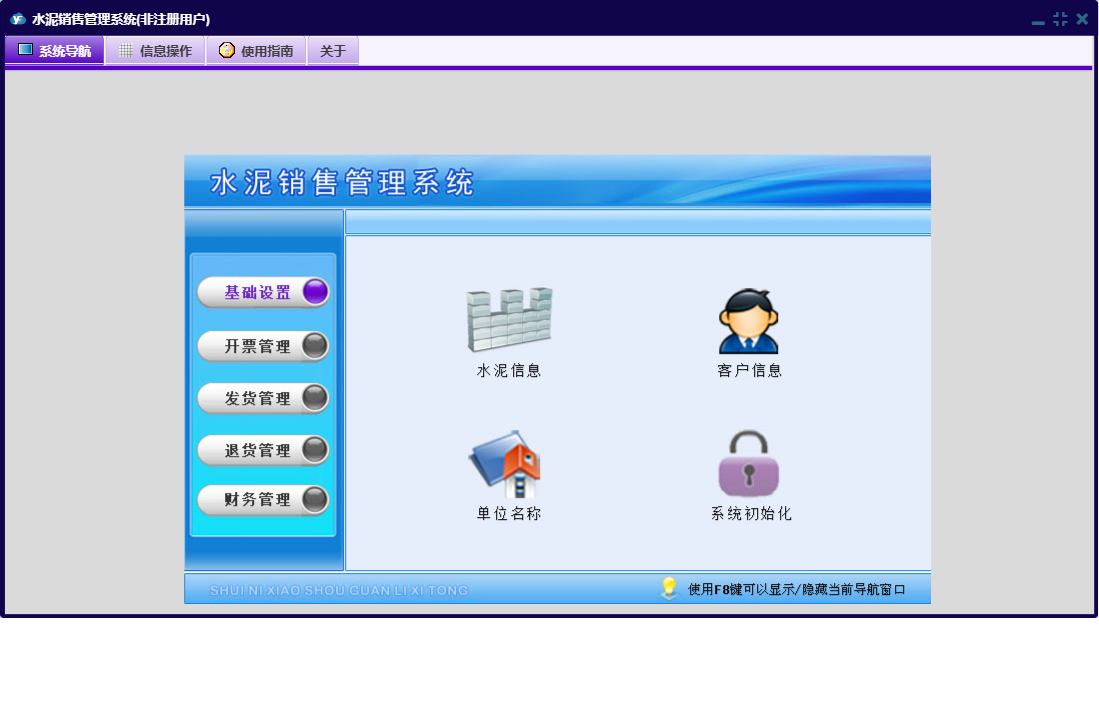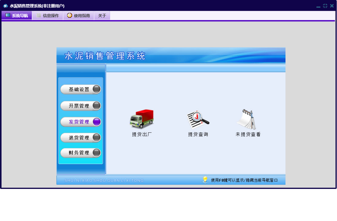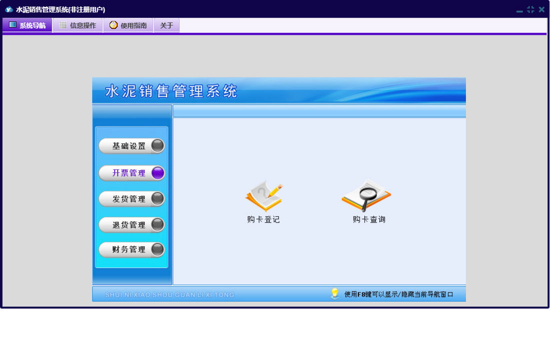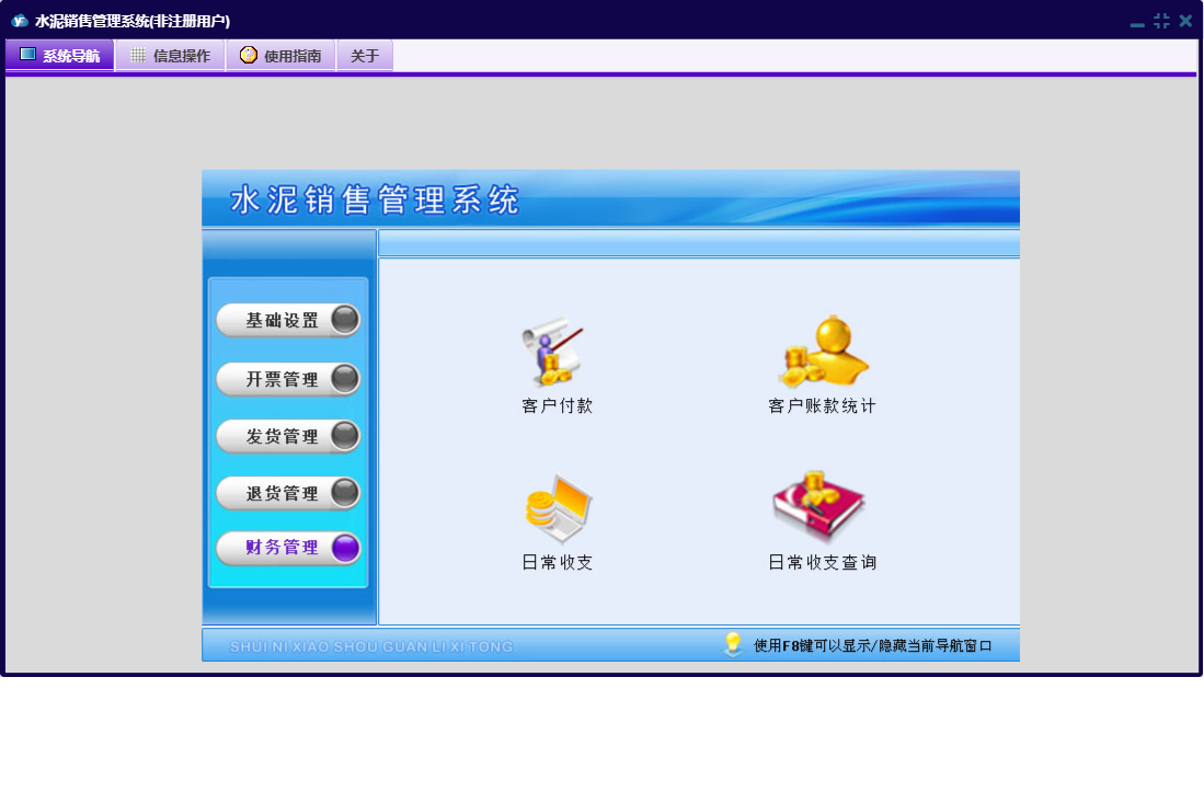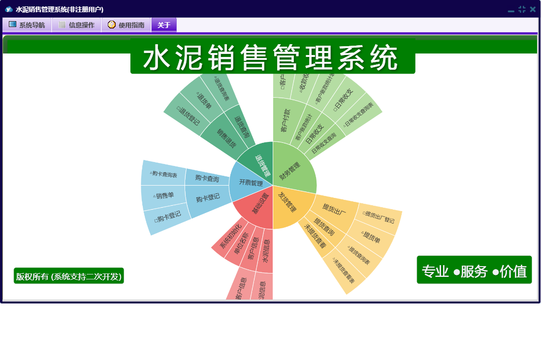 水泥销售管理系统包含以下功能:基础设置、财务管理、客户付款、购卡登记、开票管理、退货管理、日常收支、销售退货、日志、关于、权限设置、水泥信息、客户信息、发货管理、提货出厂等