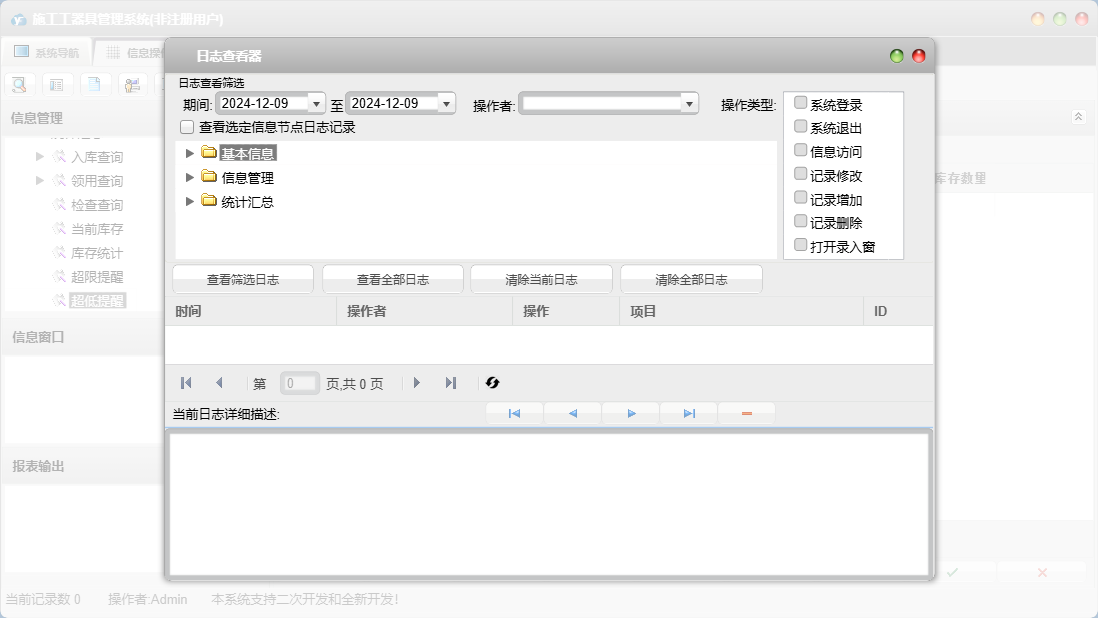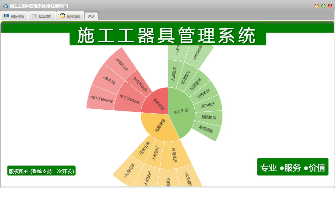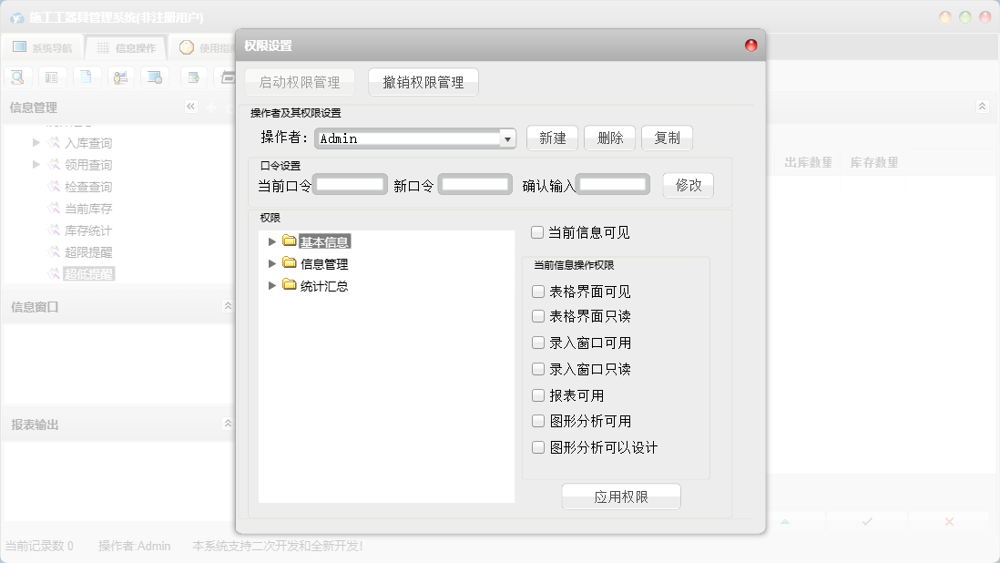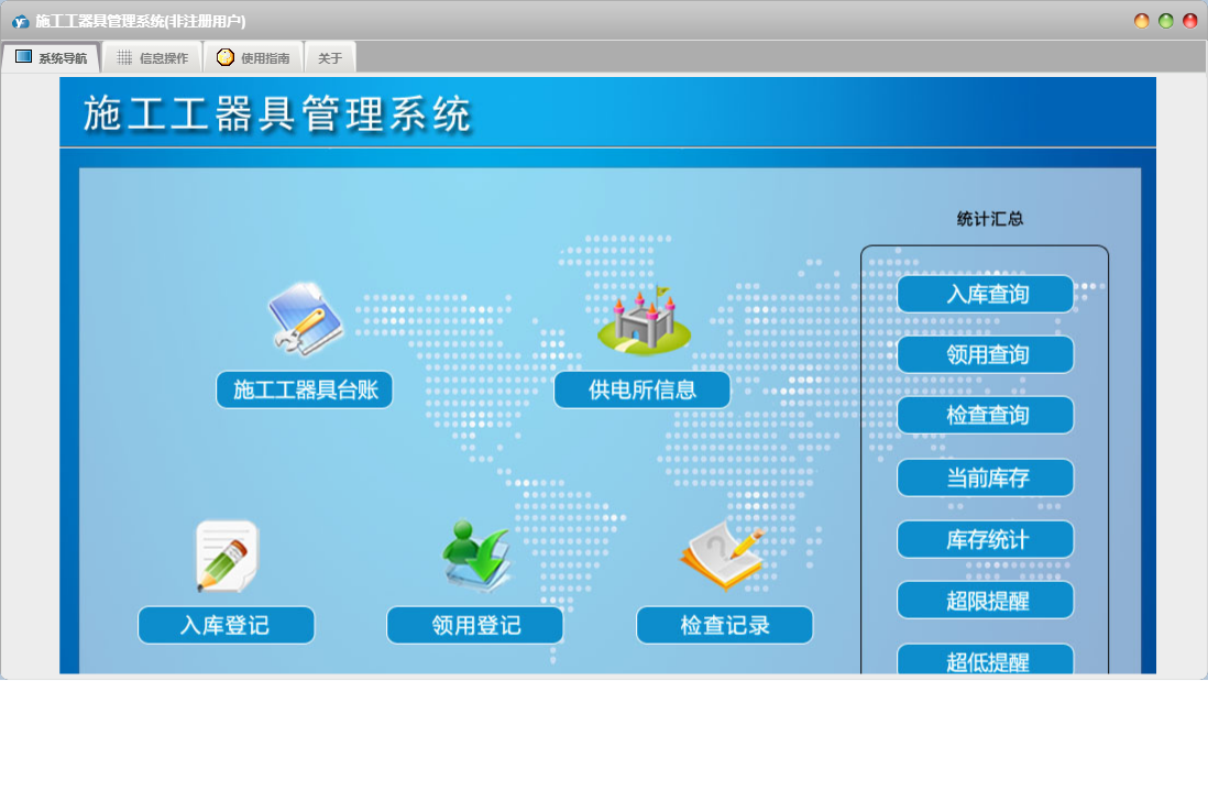 施工工器具管理系统包含以下功能:领用登记、施工工器具台账、供电所信息、检查记录、入库登记、基本设置、日志、关于、权限设置等