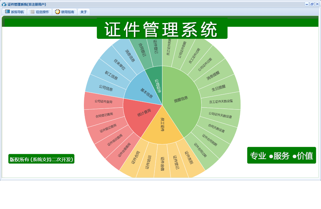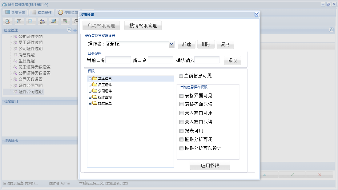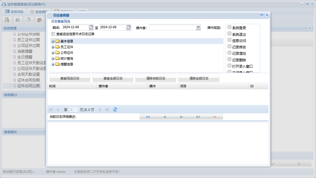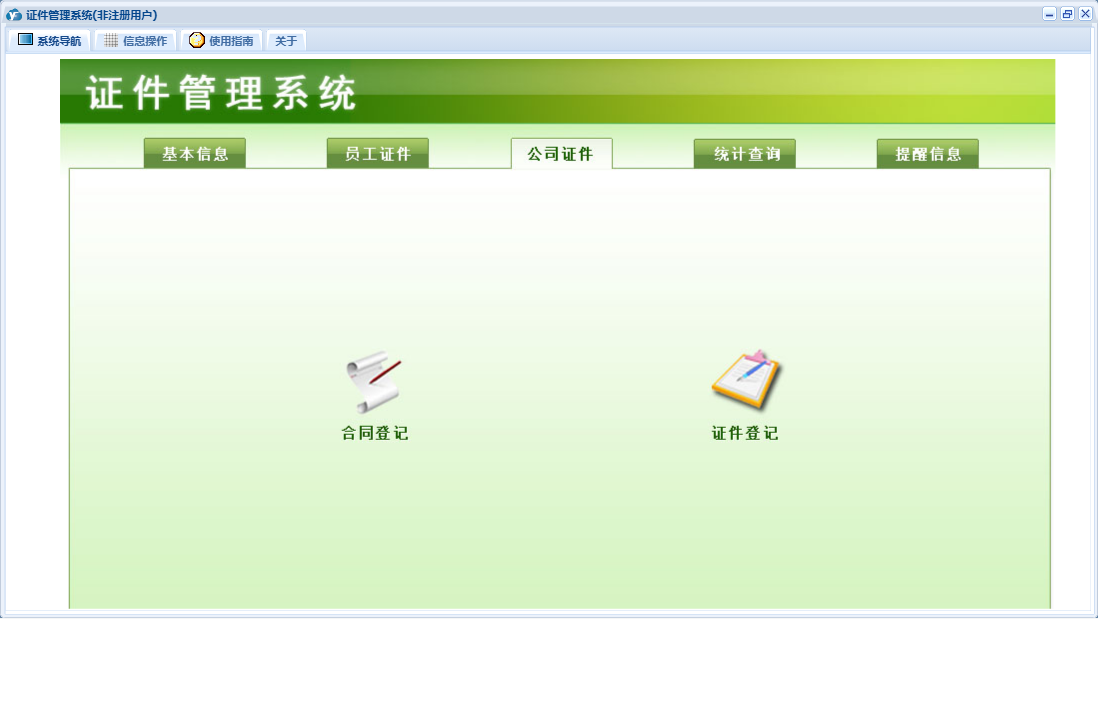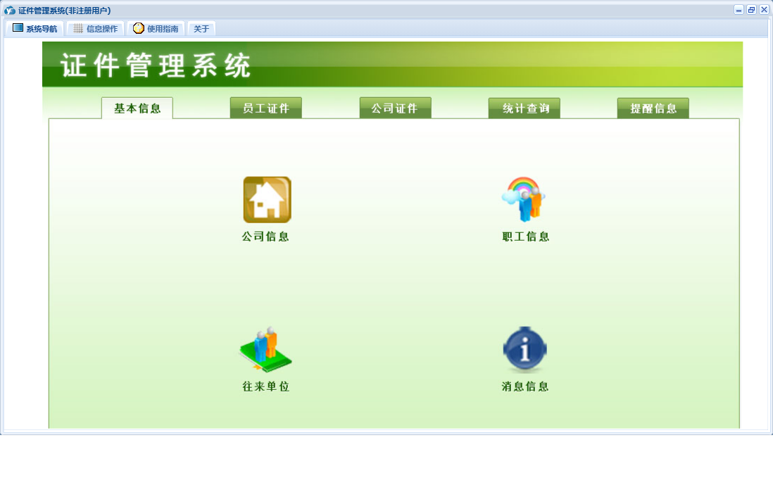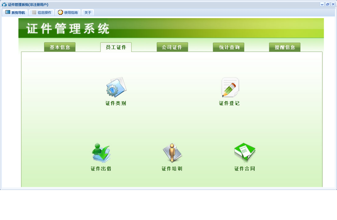证件管理系统包含以下功能:职工信息、往来单位、证件合同、证件登记、证件出借、公司证件、证件类别、公司信息、员工证件、日志、关于、合同登记、基本信息、权限设置、统计查询、提醒信息、证件培训、消息信息等