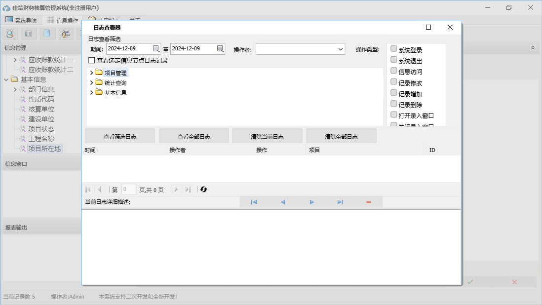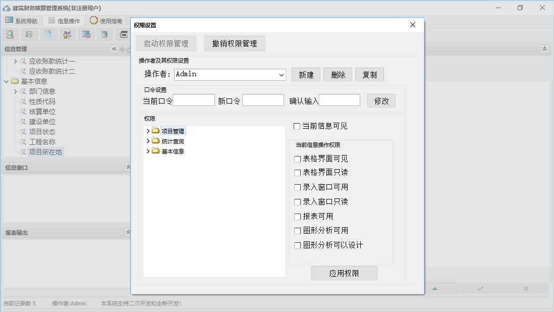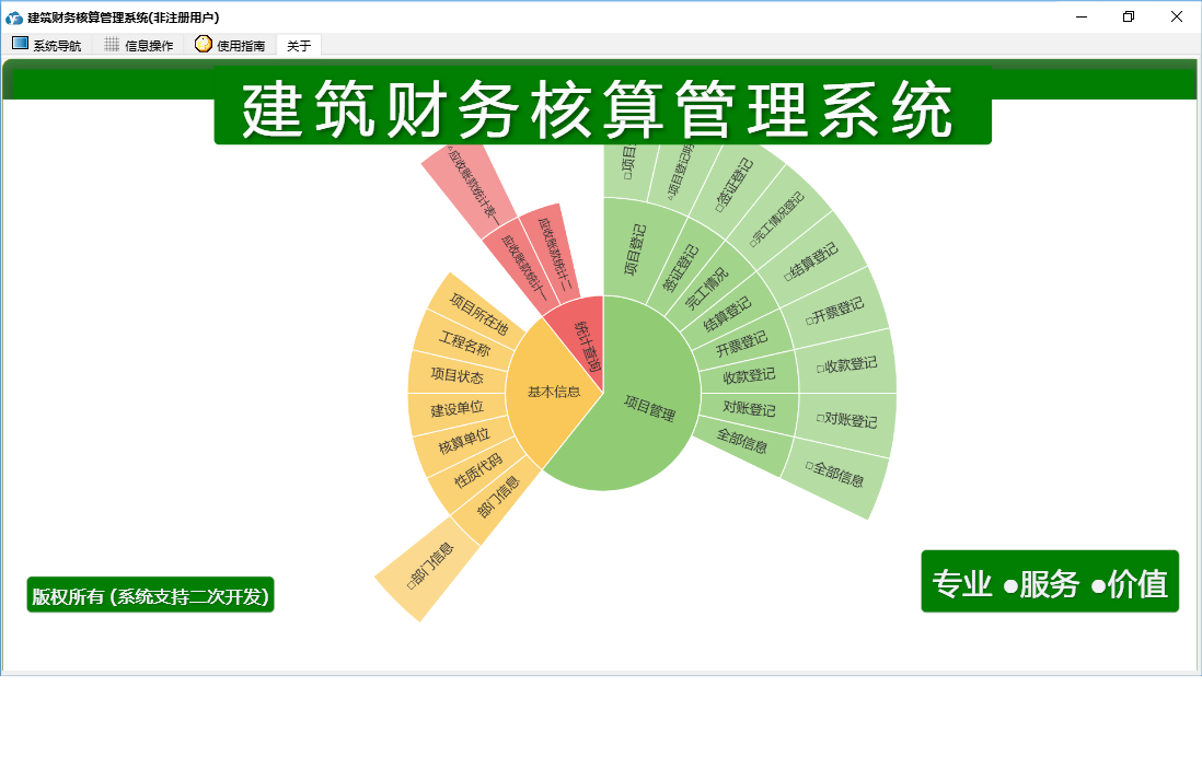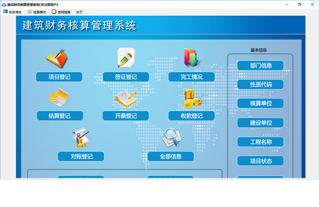 建筑财务核算管理系统包含以下功能:全部信息、面板、项目登记、对账登记、完工情况、签证登记、收款登记、开票登记、日志、关于、权限设置、部门信息、结算登记等