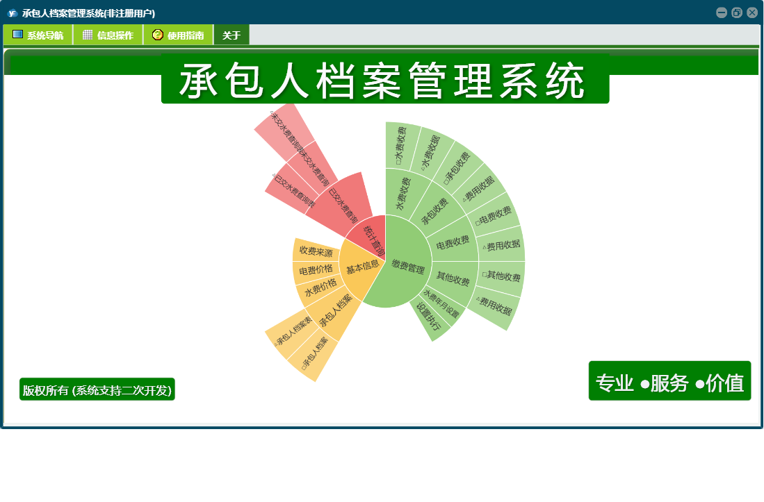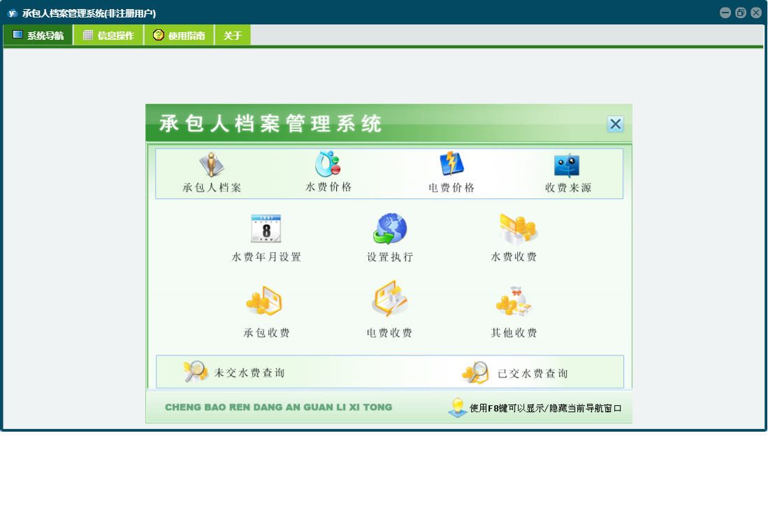 承包人档案管理系统包含以下功能:电费收费、日志、关于、水费收费、其他收费、权限设置、承包人档案、承包收费、主面板等