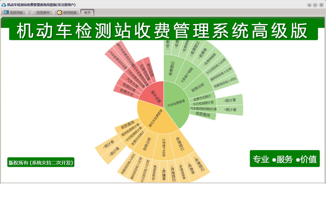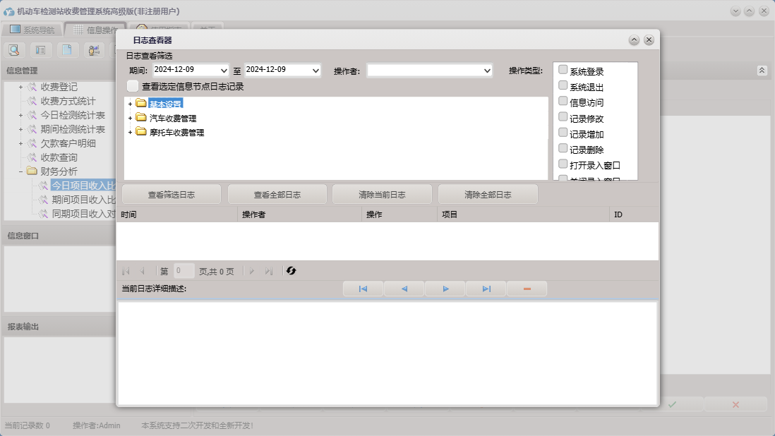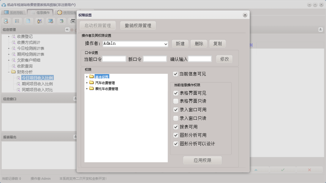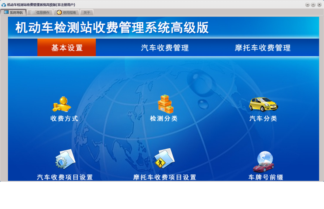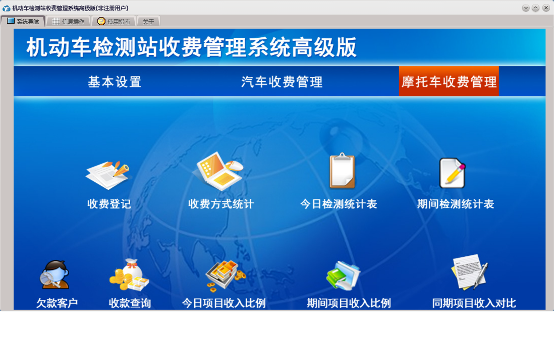 机动车检测站收费管理系统高级版包含以下功能:摩托车收费项目设置、基本设置、日志、摩托车、汽车收费、关于、权限设置、汽车收费项目设置、欠款客户明细、收费登记等