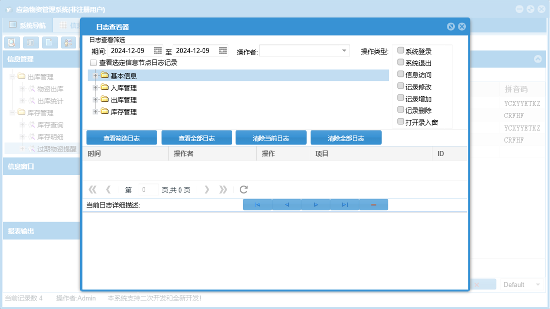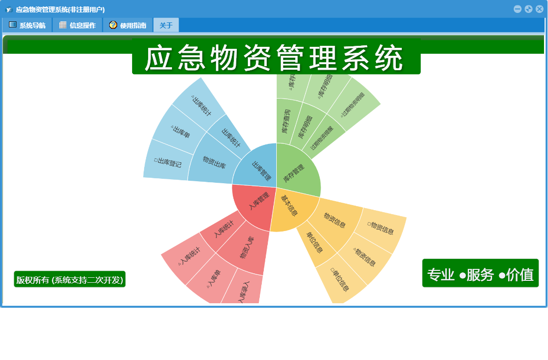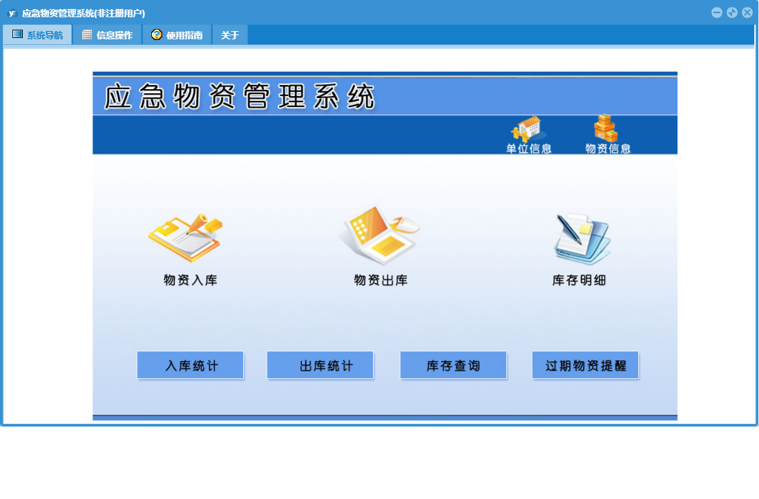 应急物资管理系统包含以下功能:物资信息、单位信息、面板、日志、物资入库、关于、权限设置、物资出库等