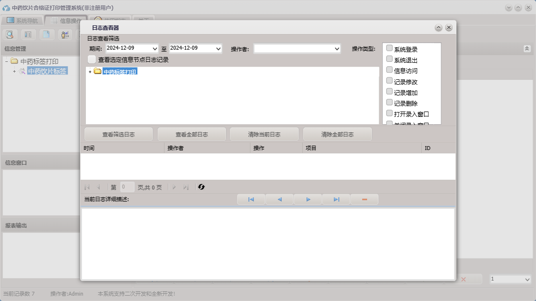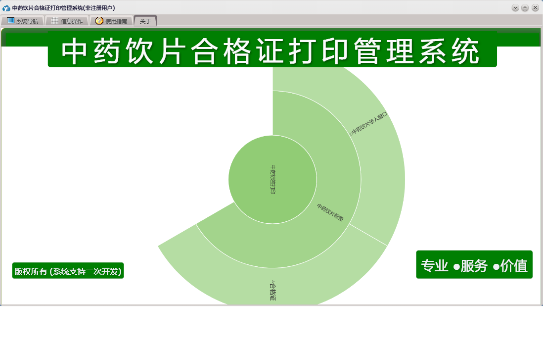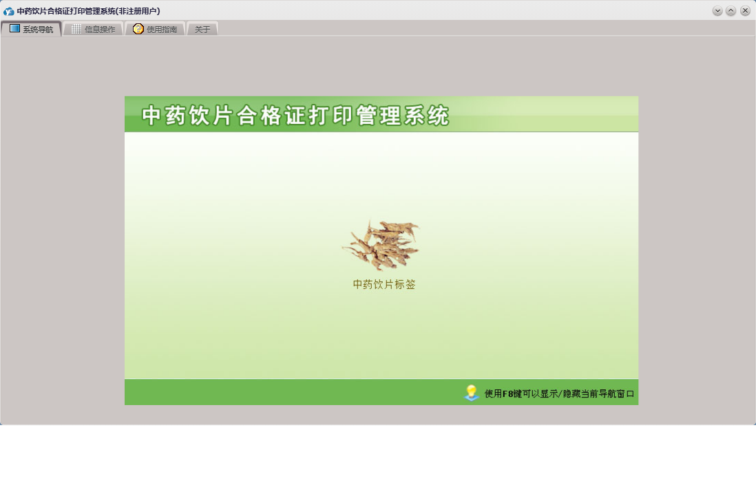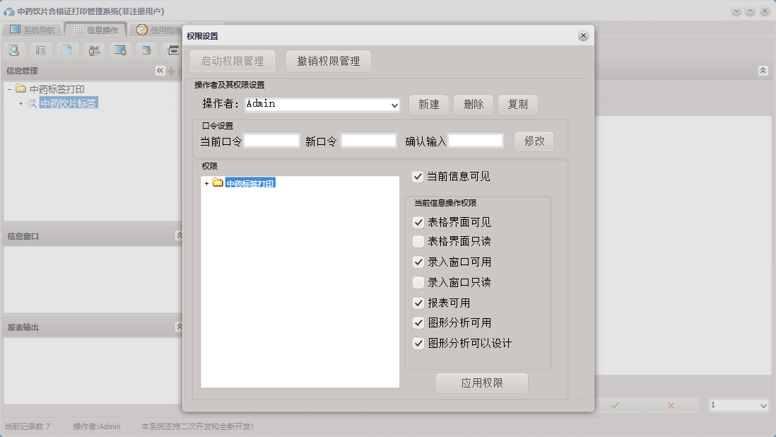 中药饮片合格证打印管理系统包含以下功能:饮片标签、日志、中药饮片标签、关于、权限设置等