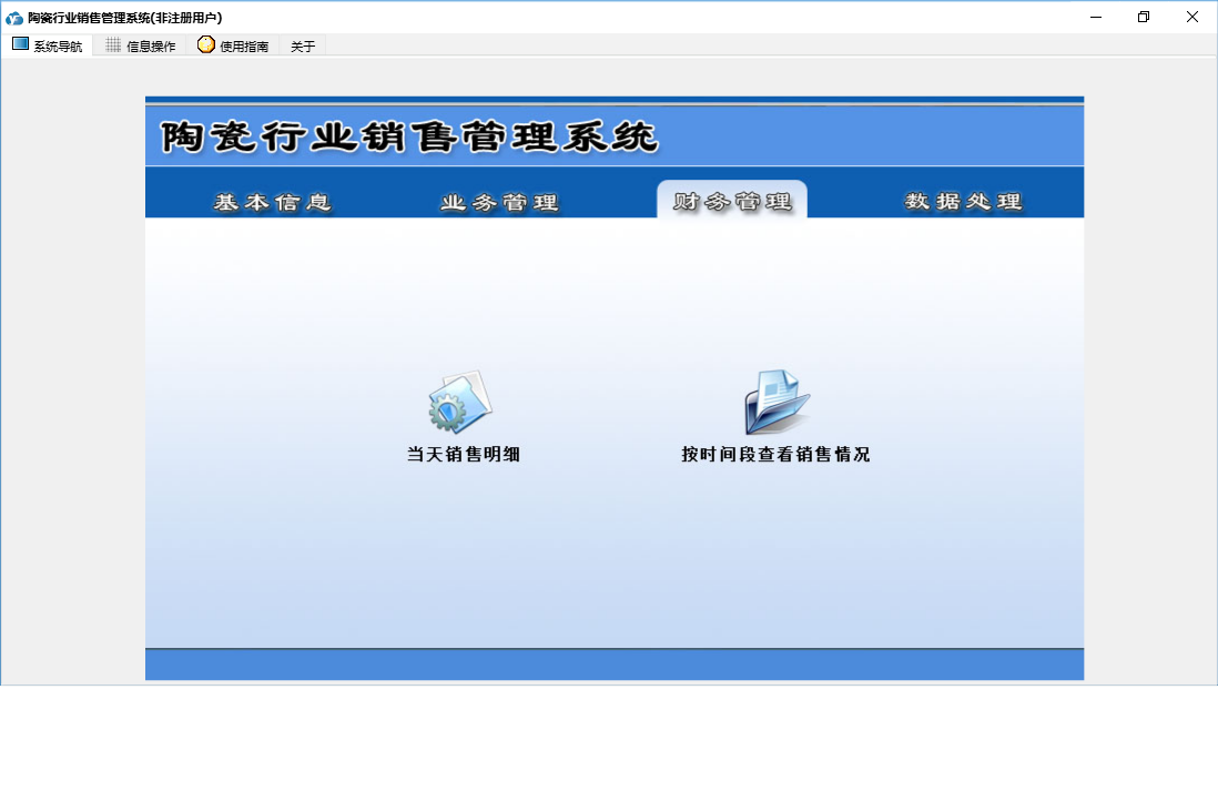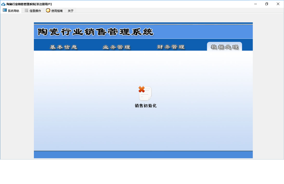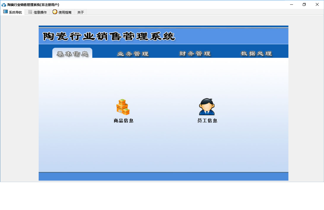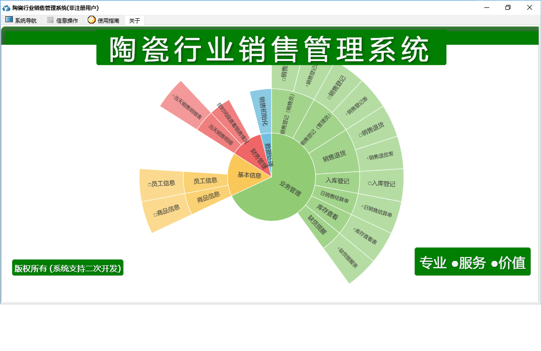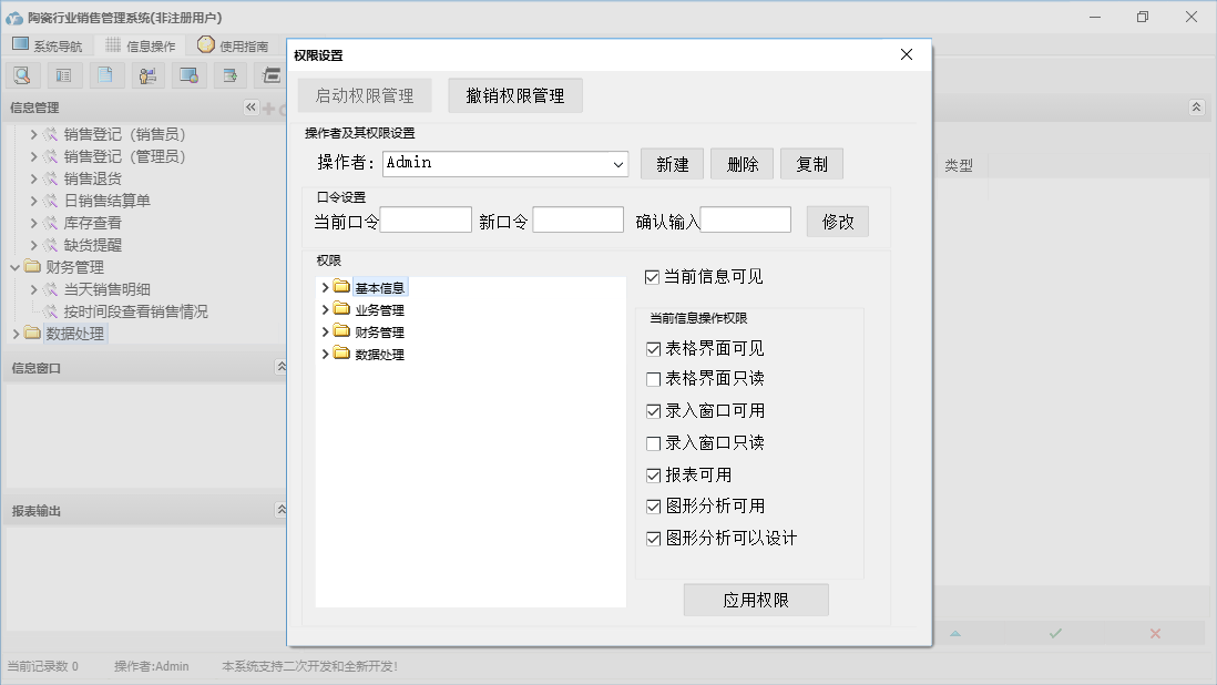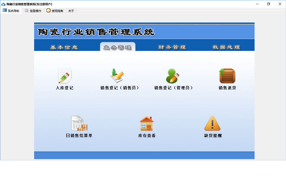 陶瓷行业销售管理系统包含以下功能:销售登记(管理员)、销售登记(销售员)、数据处理、入库登记、商品信息、员工信息、销售退货、日志、关于、权限设置、基本信息、财务管理、业务管理等