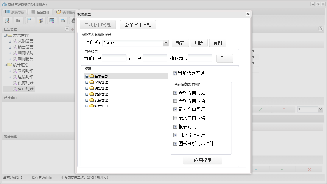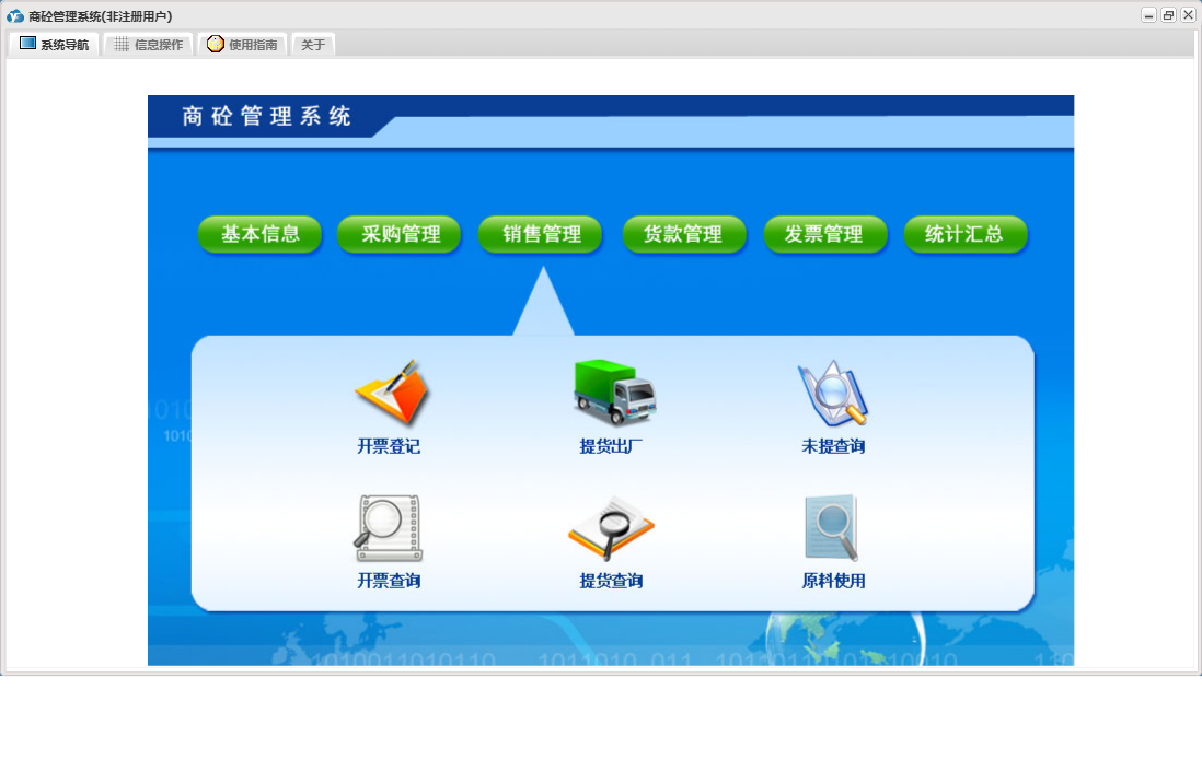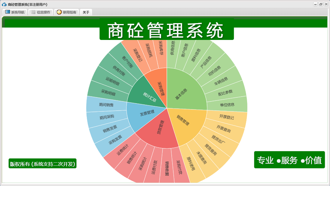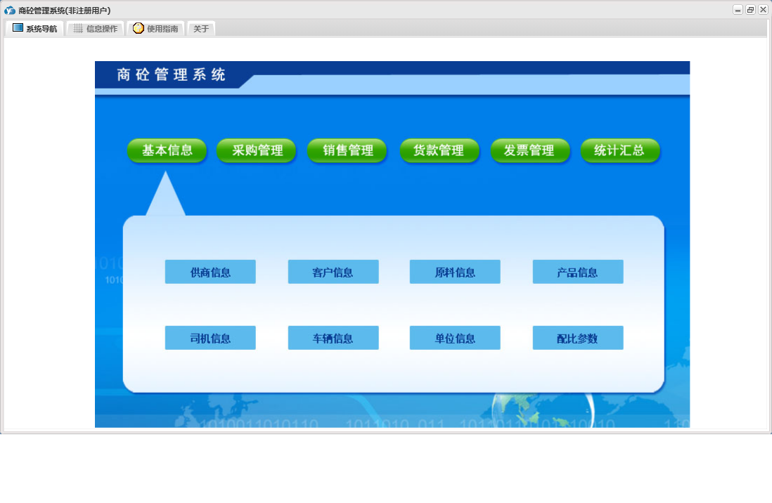 商砼管理系统包含以下功能:发票管理、销售管理、日志、采购管理、货款管理、关于、基本信息、权限设置、统计汇总等