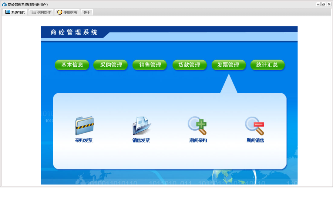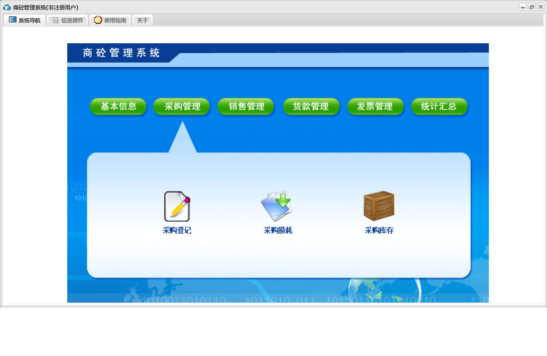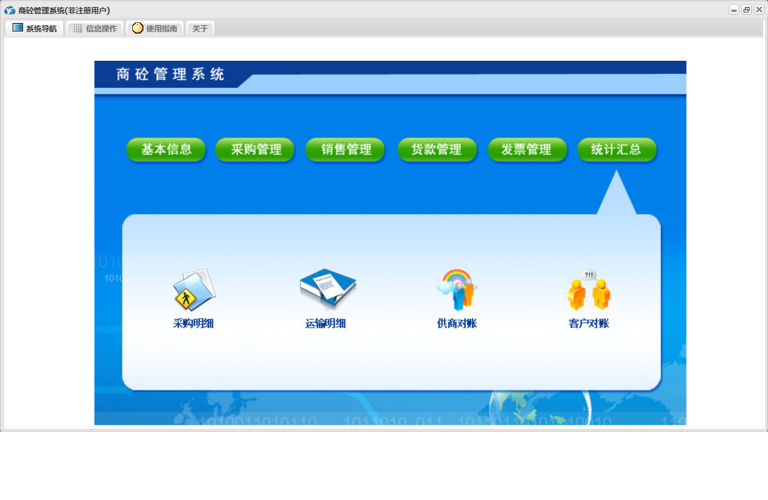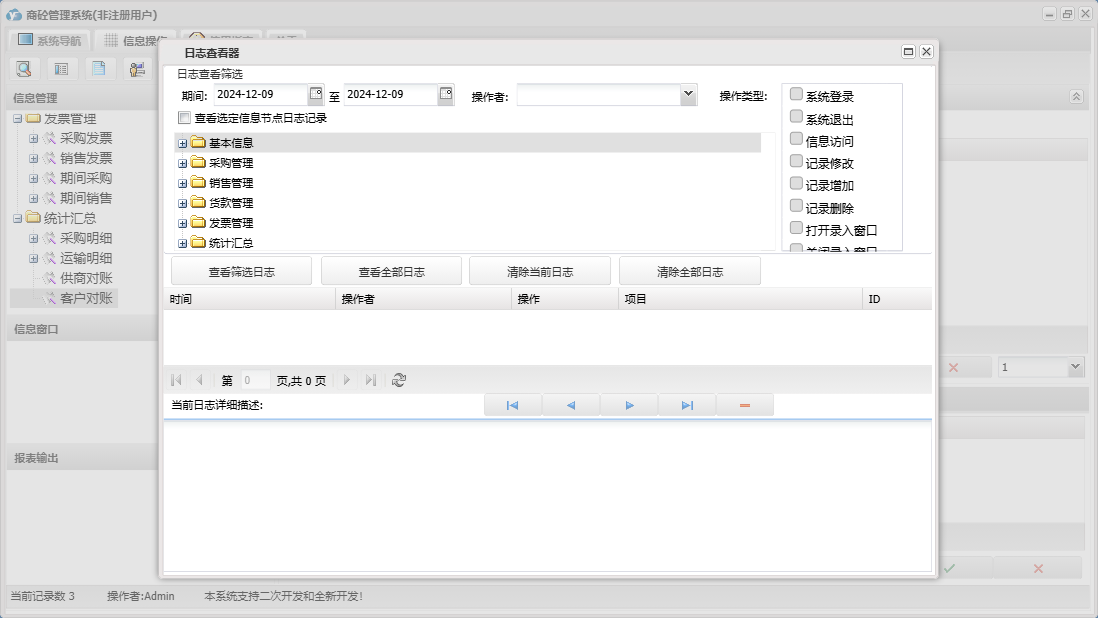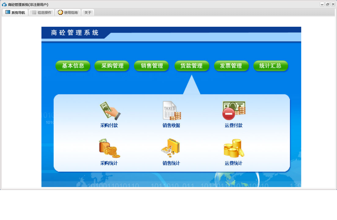 商砼管理系统包含以下功能:发票管理、销售管理、日志、采购管理、货款管理、关于、基本信息、权限设置、统计汇总等