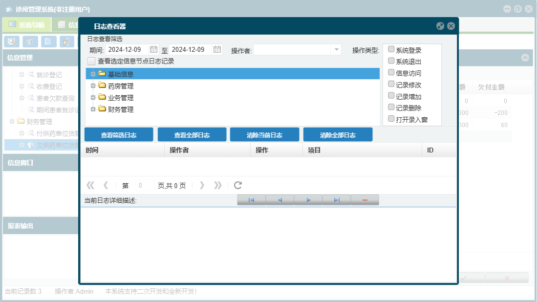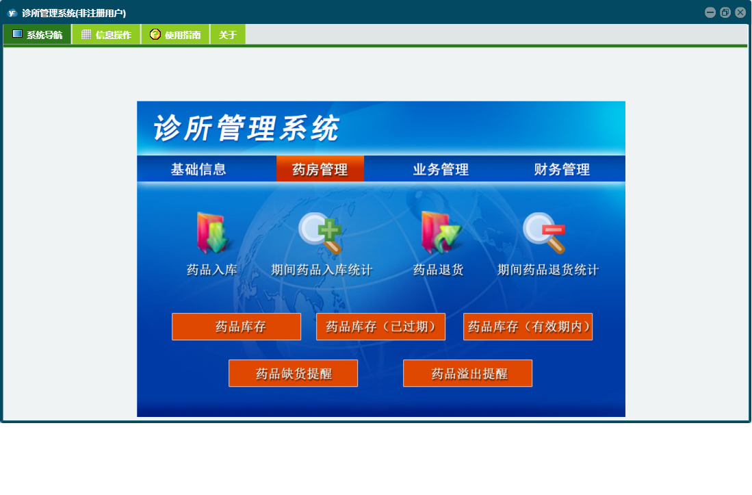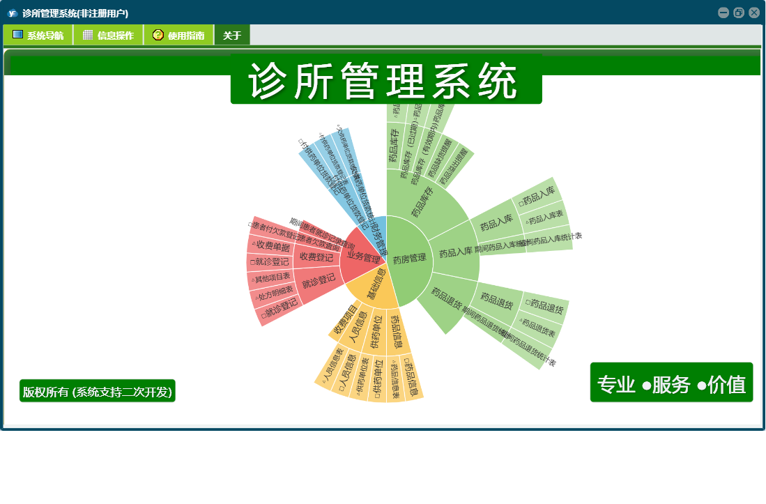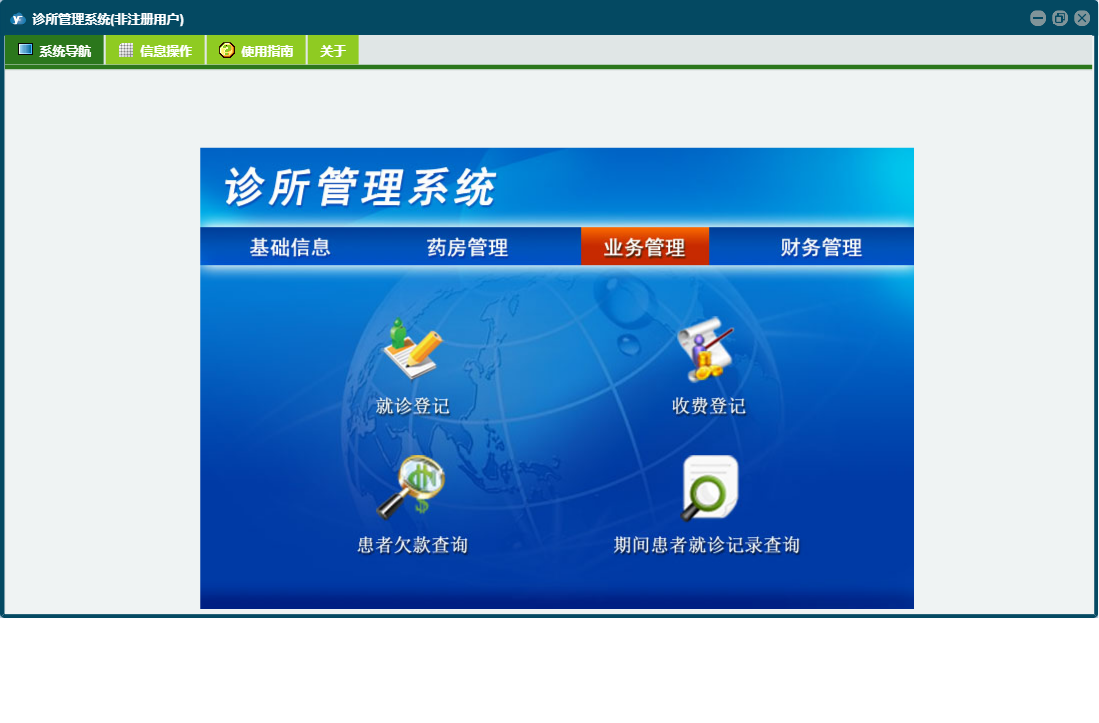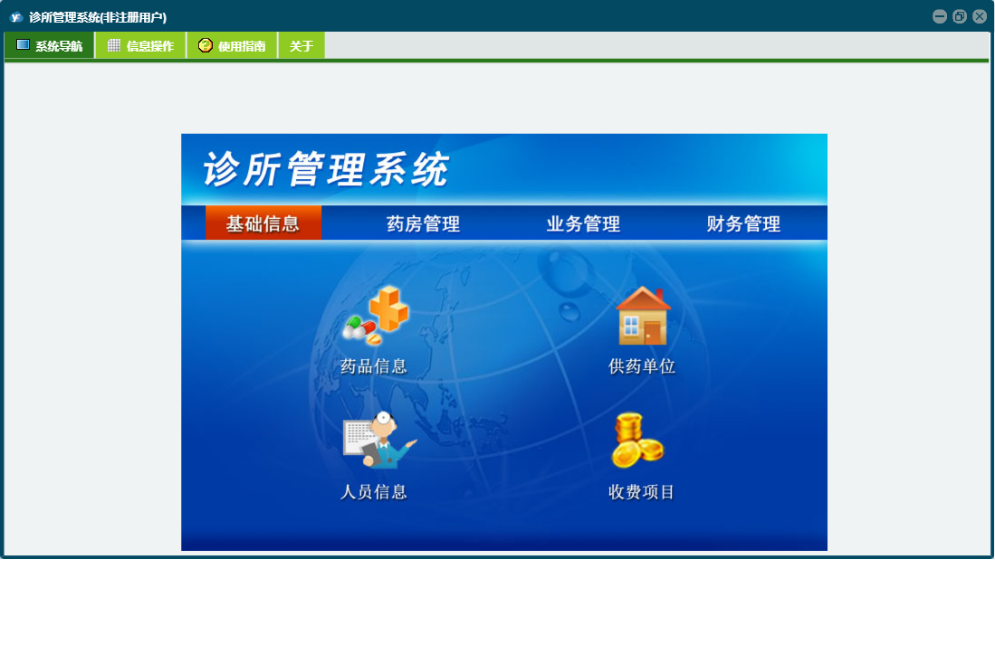 诊所管理系统包含以下功能:供药单位、基础信息、财务管理、药品信息、付供药单位货款登记、药品退货、药品入库、就诊登记、日志、患者欠款查询、关于、权限设置、药房管理、收费登记、业务管理、人员信息等