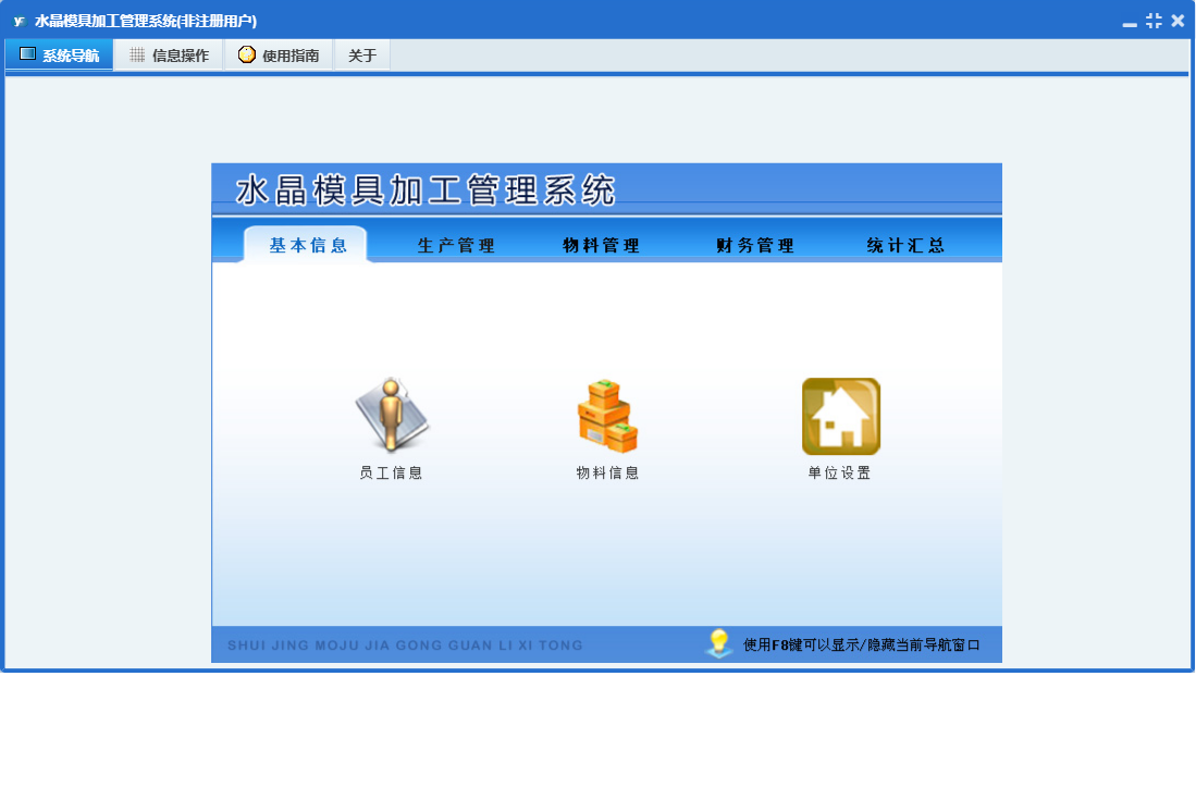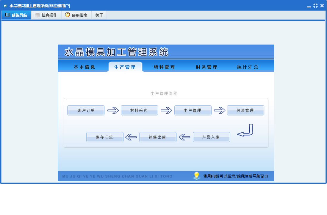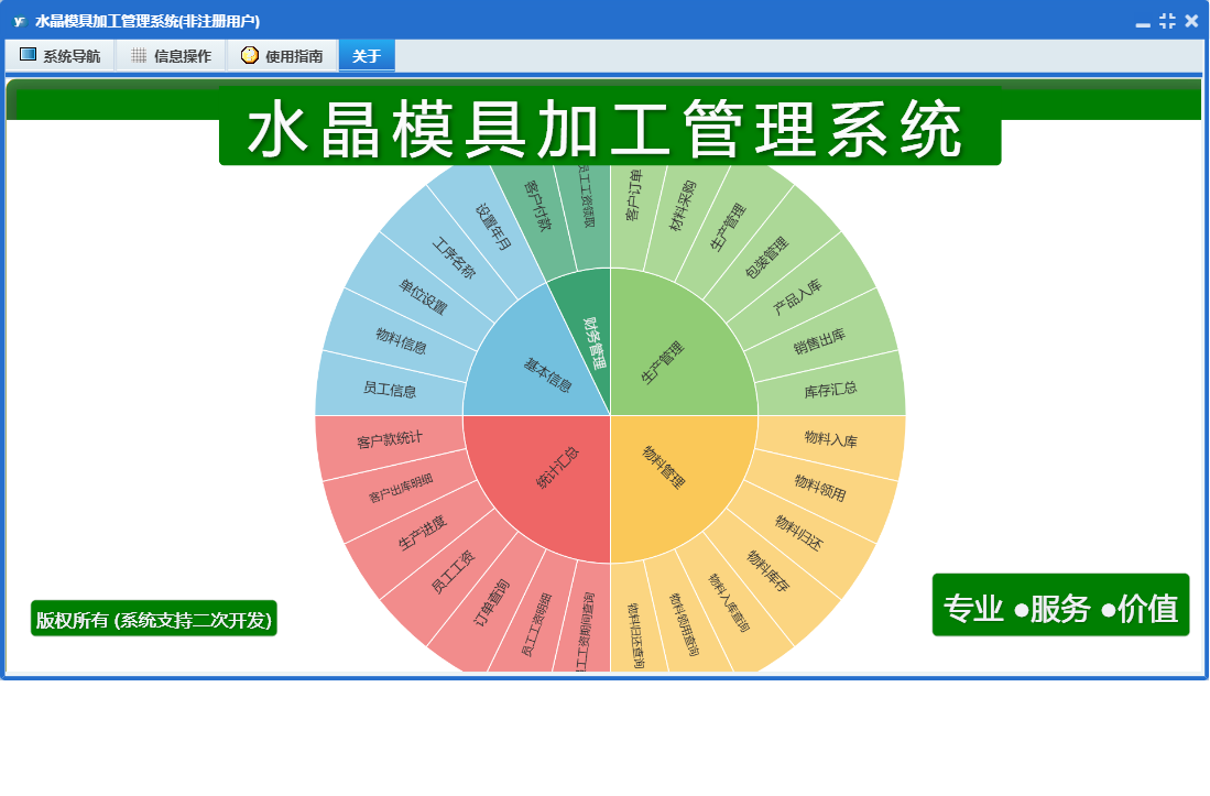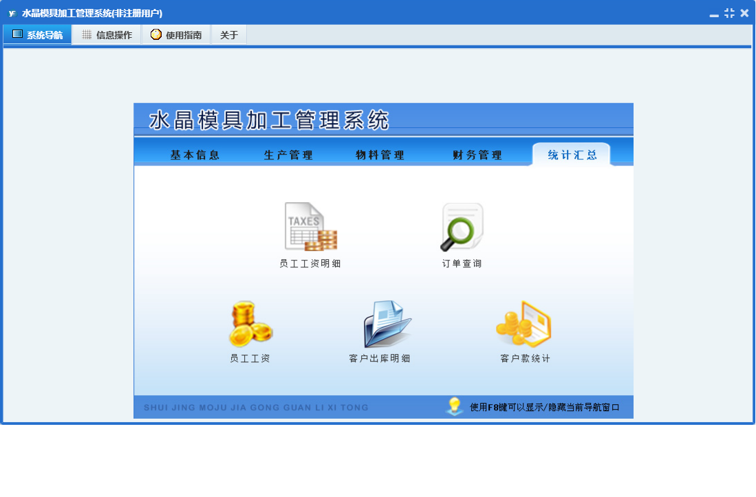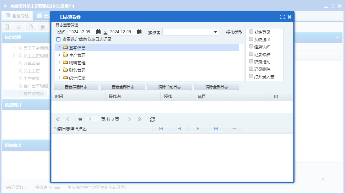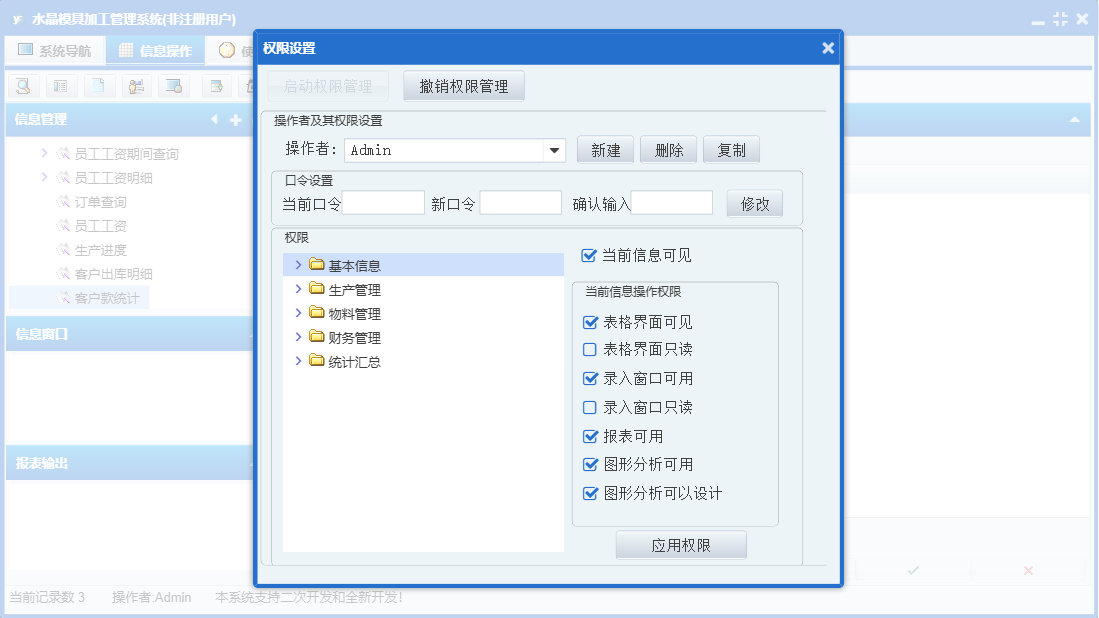 水晶模具加工管理系统包含以下功能:物料信息、物料入库、统计汇总、财务管理、员工工资领取、权限设置、销售出库、工序名称、物料归还、包装管理、关于、基本信息、物料管理、物料领用、客户付款、员工信息、产品入库、材料采购、客户订单、日志、生产管理等