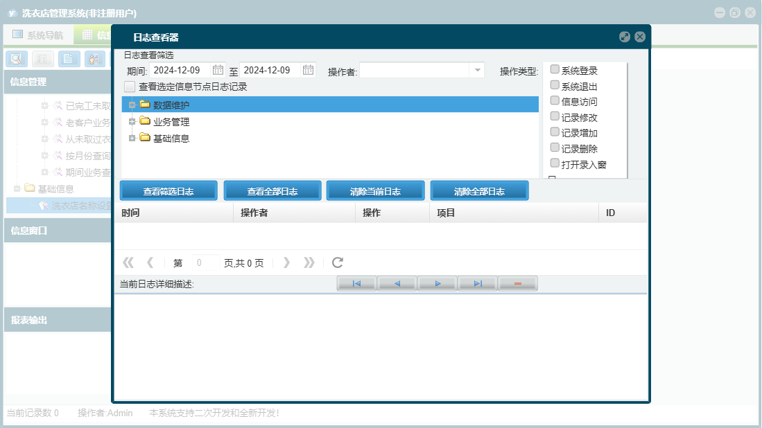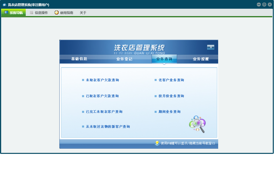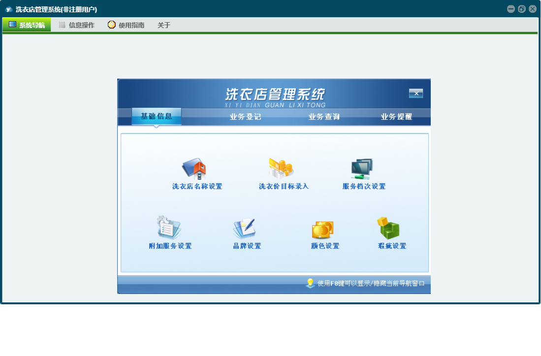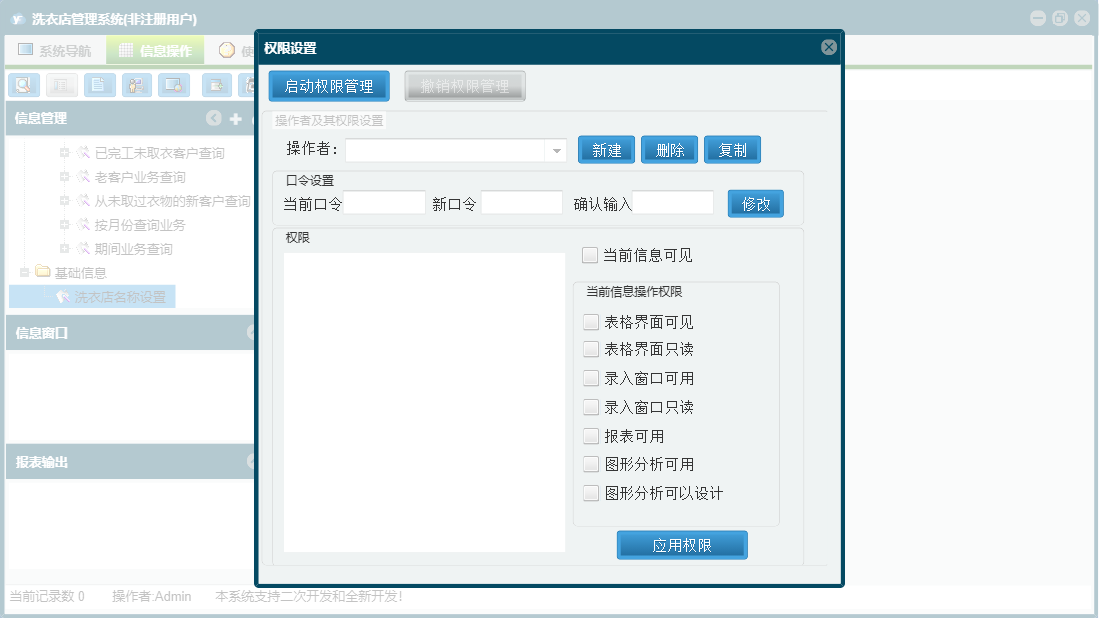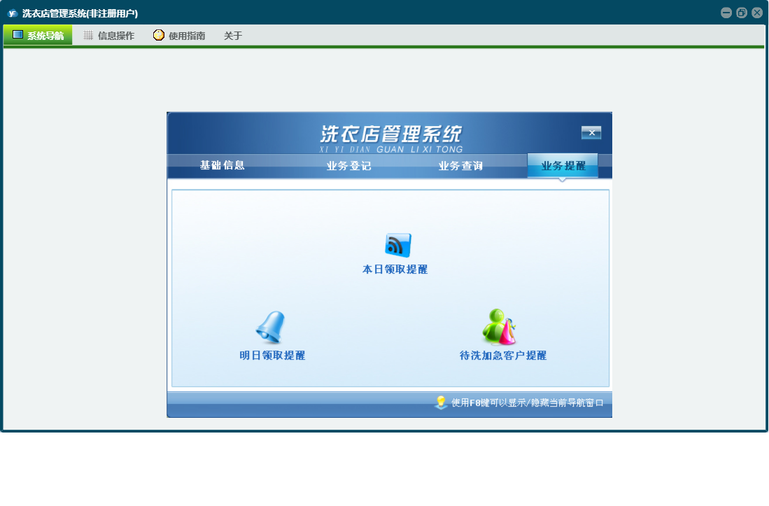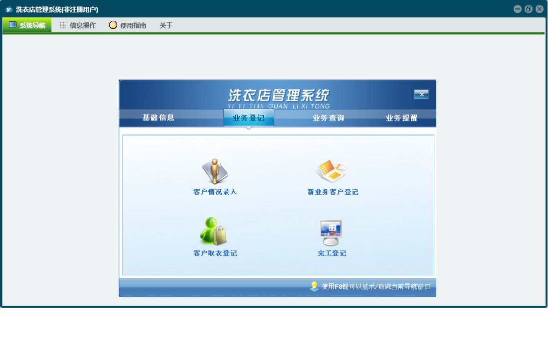 洗衣店管理系统包含以下功能:客户取衣登记、客户情况表、新业务登记、基础信息、业务提醒、洗衣价目表、日志、业务登记、关于、权限设置、业务查询、完工登记等