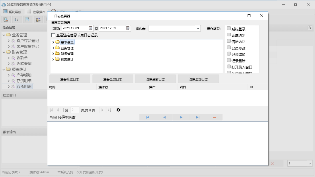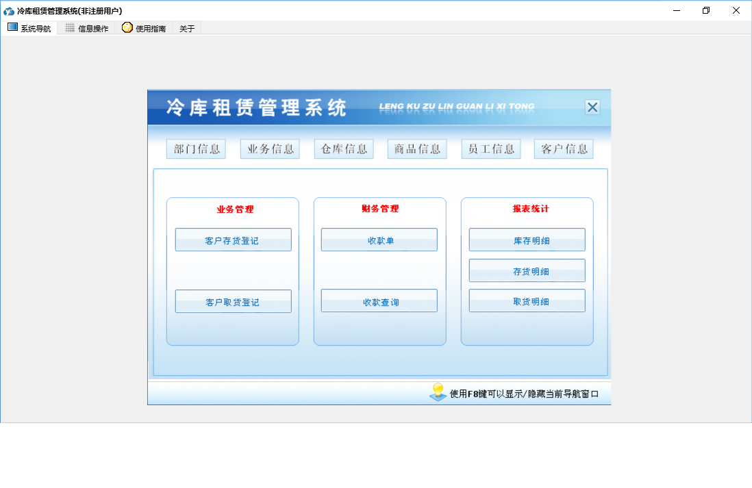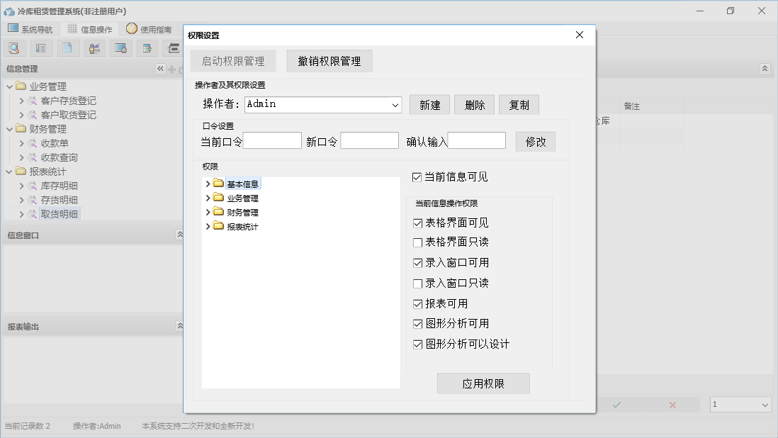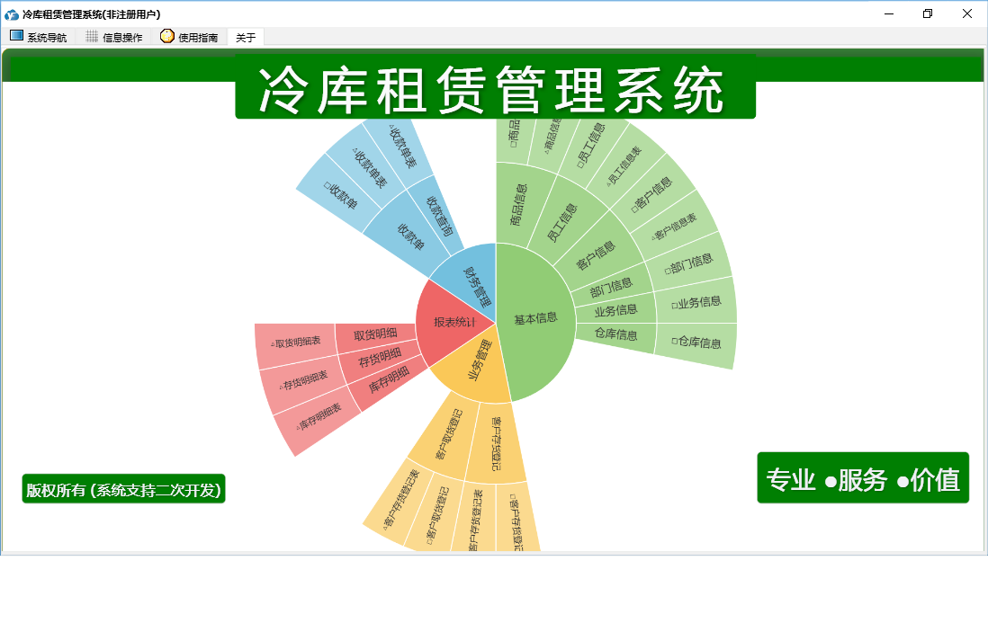 冷库租赁管理系统包含以下功能:商品信息、员工信息、客户取货登记、收款单、日志、关于、权限设置、业务信息、部门信息、客户信息、基本、仓库信息、客户存货登记等