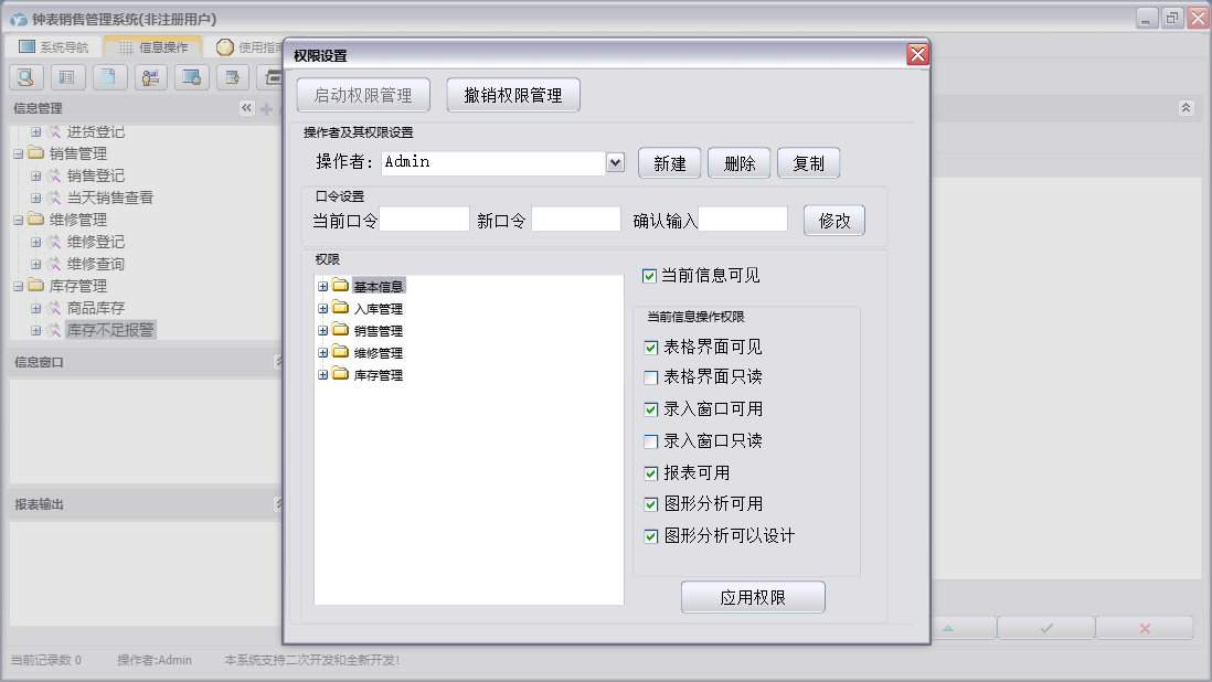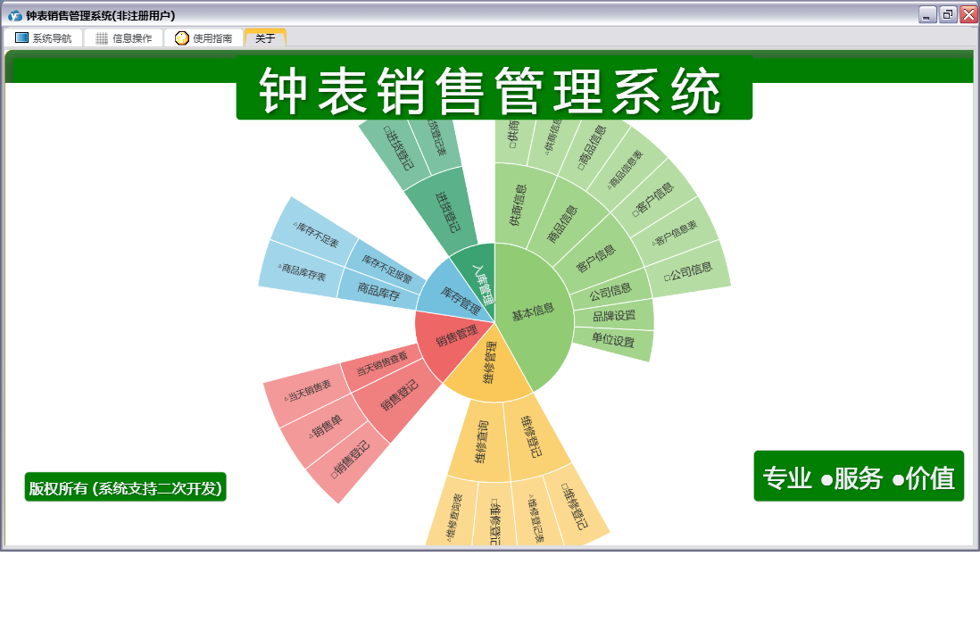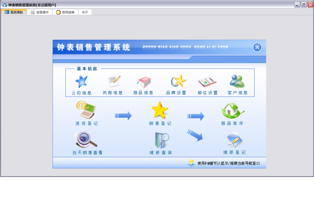 钟表销售管理系统包含以下功能:维修查询、供商信息、维修登记、公司信息、商品信息、日志、关于、销售登记、权限设置、客户信息、主面板、进货登记等