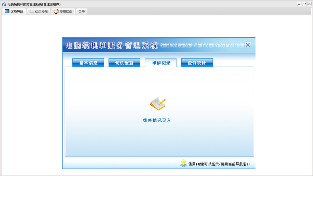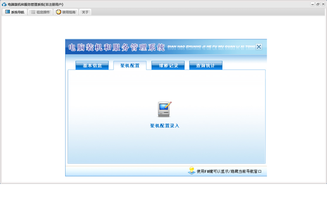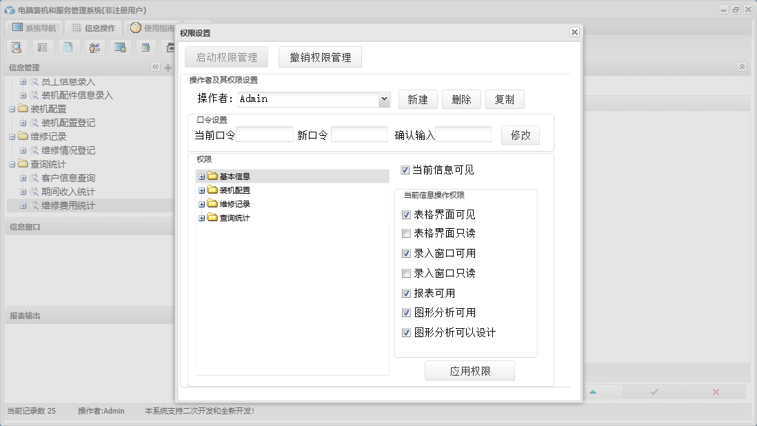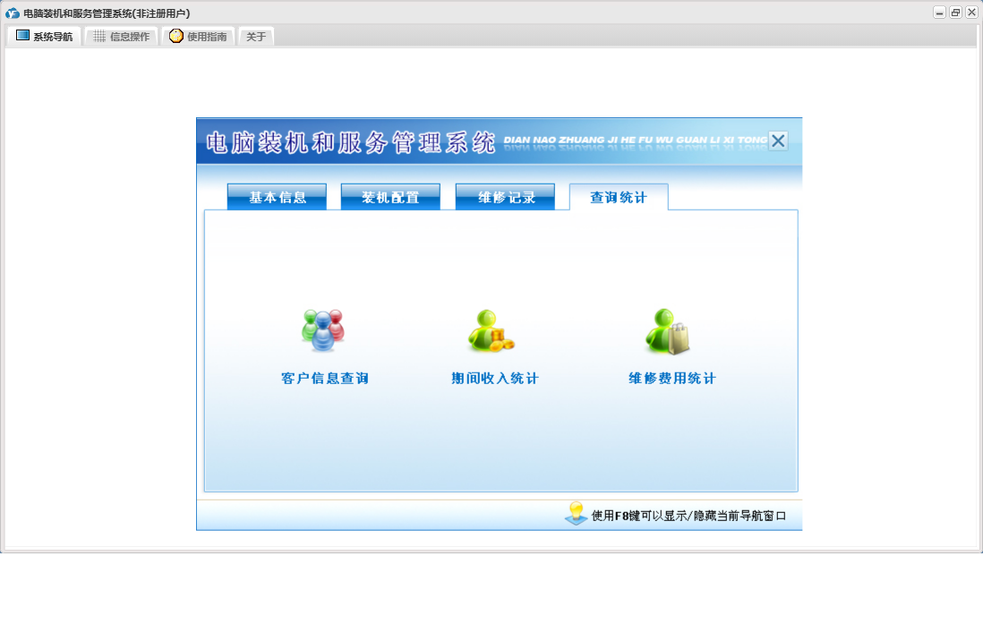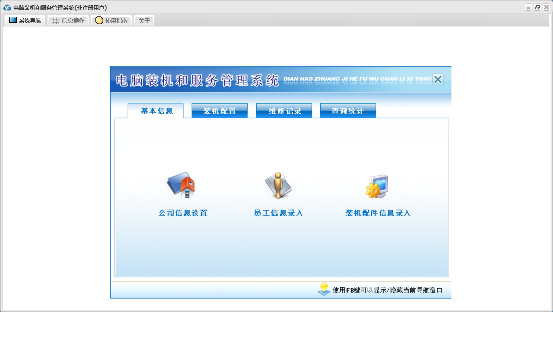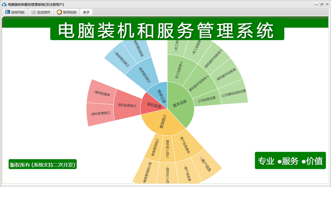 电脑装机和服务管理系统包含以下功能:装机配置、维修情况登记、查询统计、员工信息录入、日志、装机配件信息录入、关于、装机配置登记、权限设置、基本信息、公司信息设置、维修记录、客户信息查询等