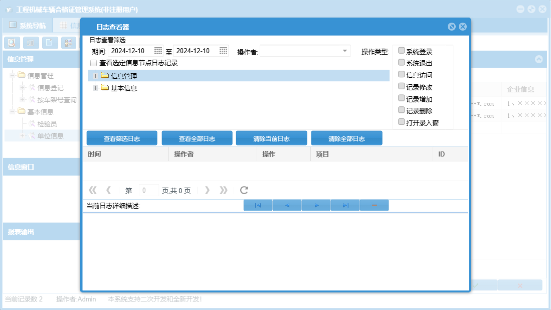 工程机械车辆合格证管理系统包含以下功能:信息登记、1、单位信息、日志、关于、权限设置等