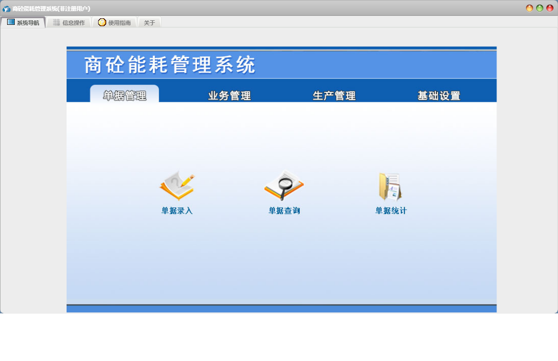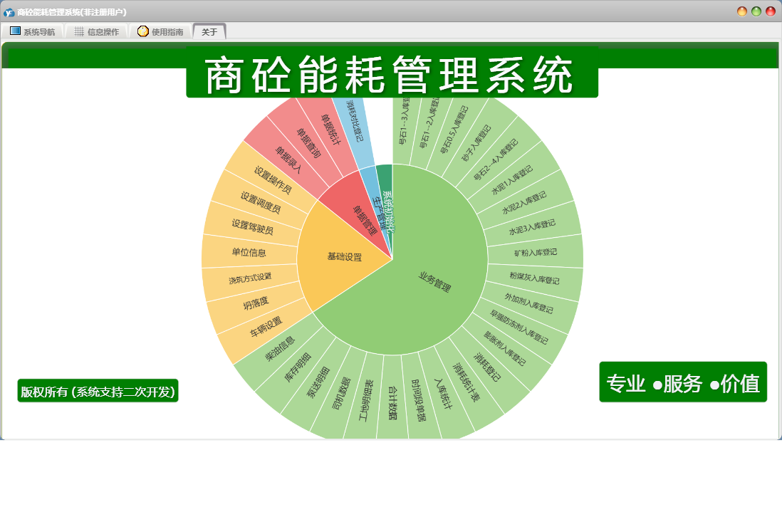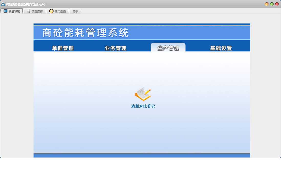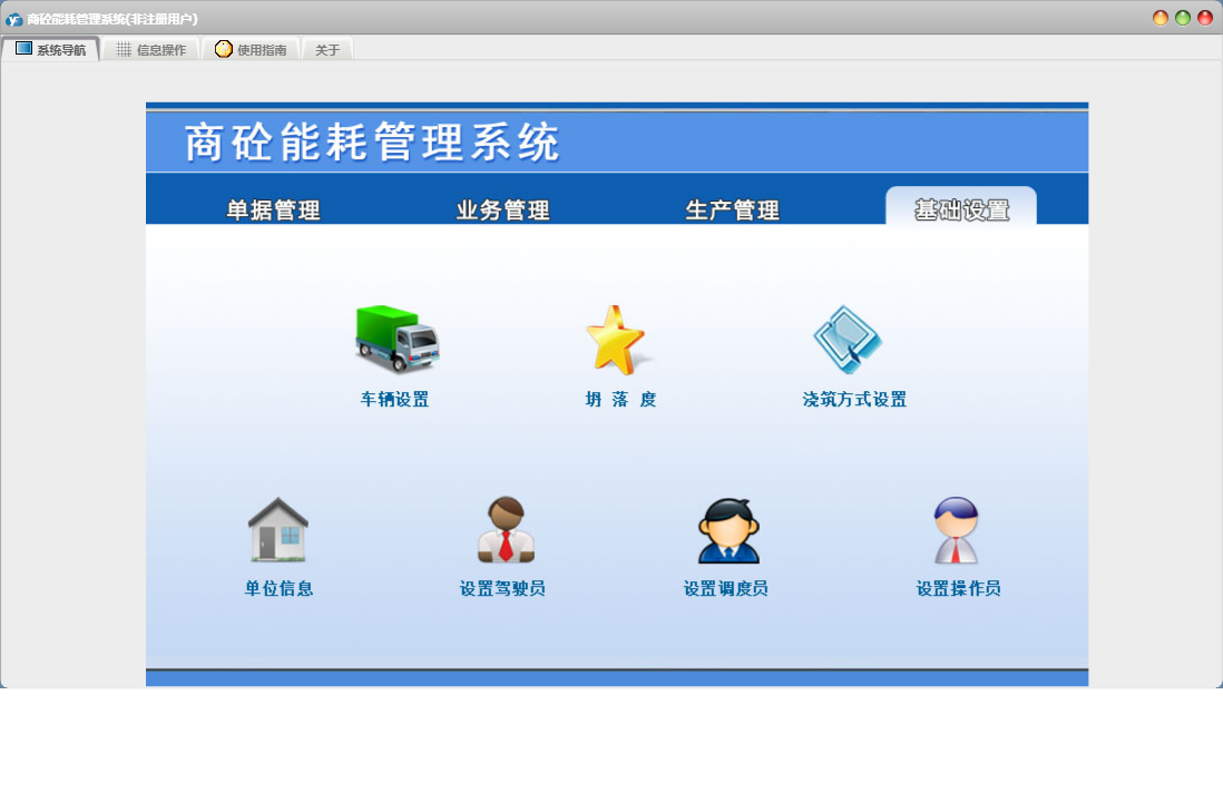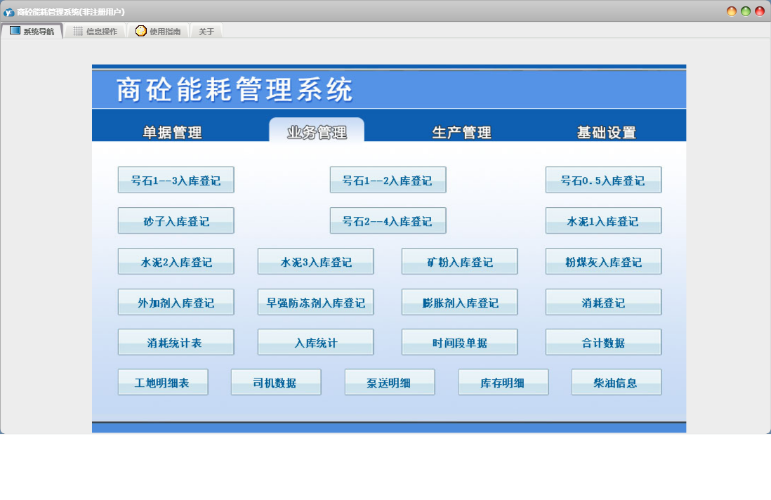 商砼能耗管理系统包含以下功能:基础设置、早强防冻剂入库登记、膨胀剂入库登记、外加剂入库登记、矿粉入库登记、号石1--3入库登记、单据管理、号石0.5入库登记、消耗登记、消耗对比登记、号石2--4入库登记、权限设置、粉煤灰入库登记、水泥2入库登记、车辆设置、坍落度、单位信息、单据录入、水泥1入库登记、关于、业务管理、砂子入库登记、号石1--2入库登记、浇筑方式设置、日志、生产管理、水泥3入库登记、柴油信息等