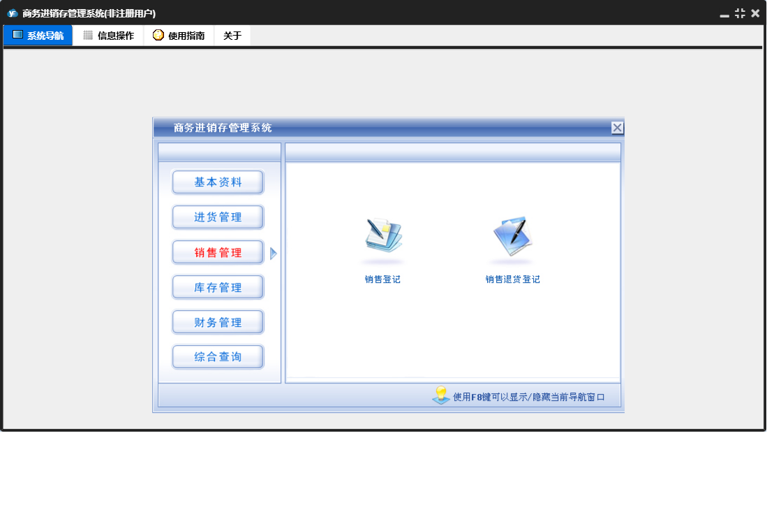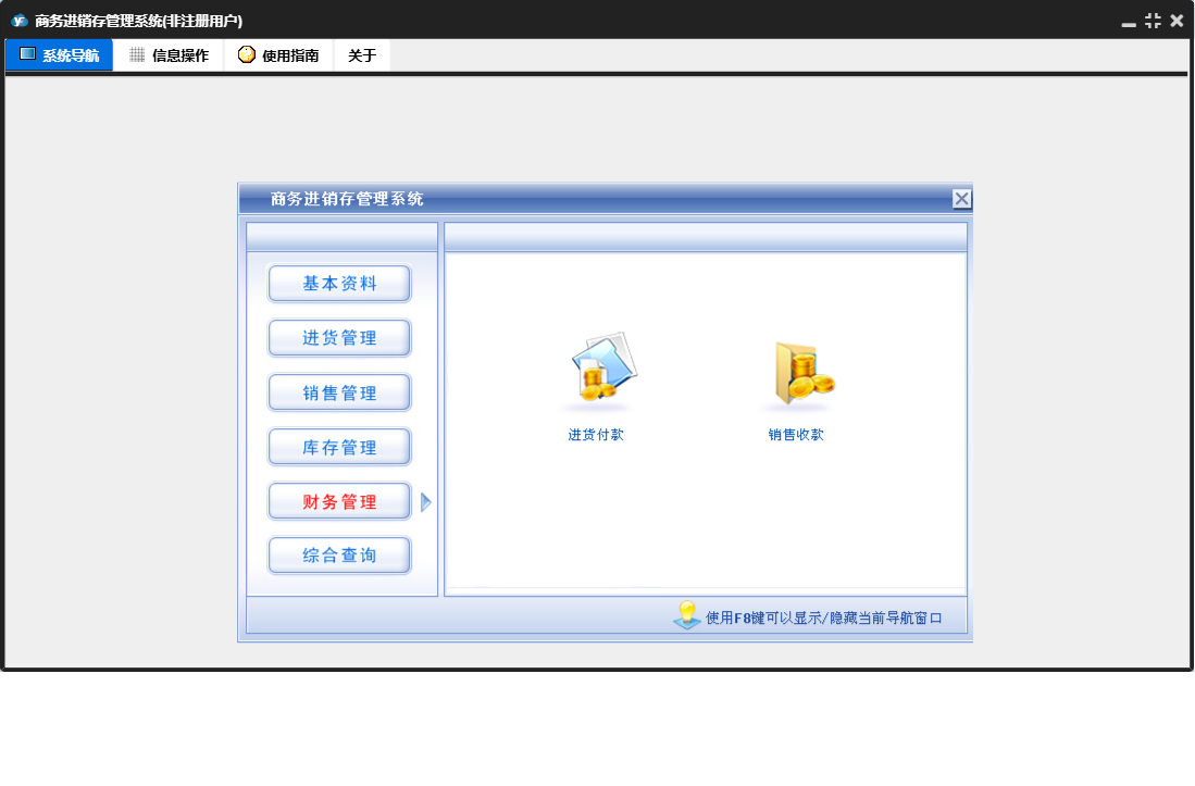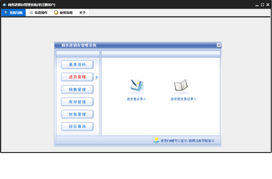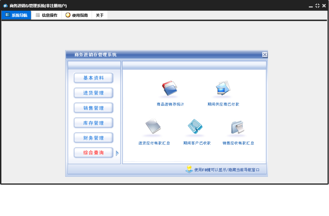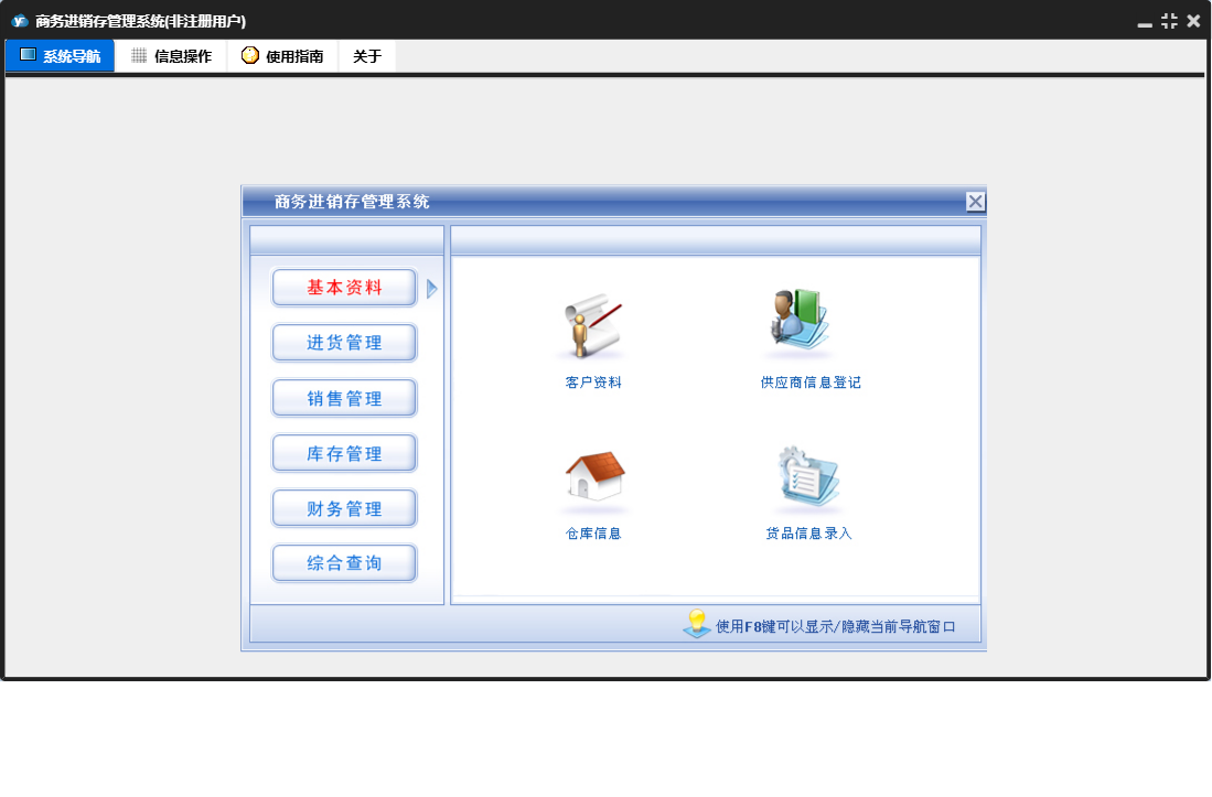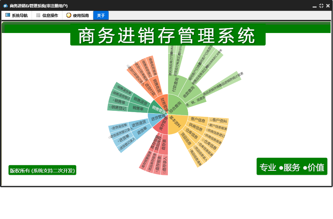 商务进销存管理系统包含以下功能:进货退货、销售管理、货品信息、进货单、综合查询、财务管理、销售单、销售退货、权限设置、仓库信息、基本资料、盘存表、库存管理、销售收款、关于、客户信息、进货付款、进货管理、日志、供商信息等