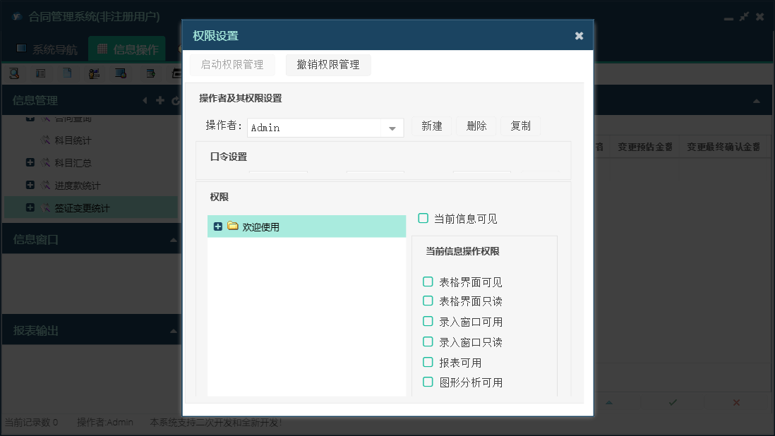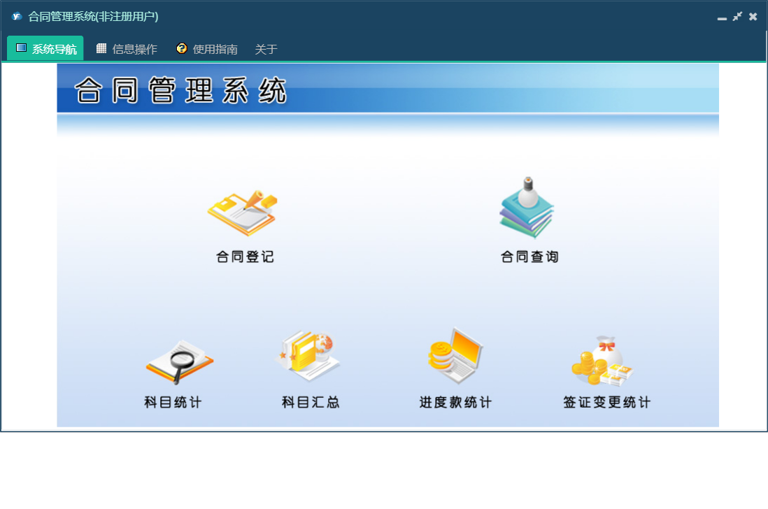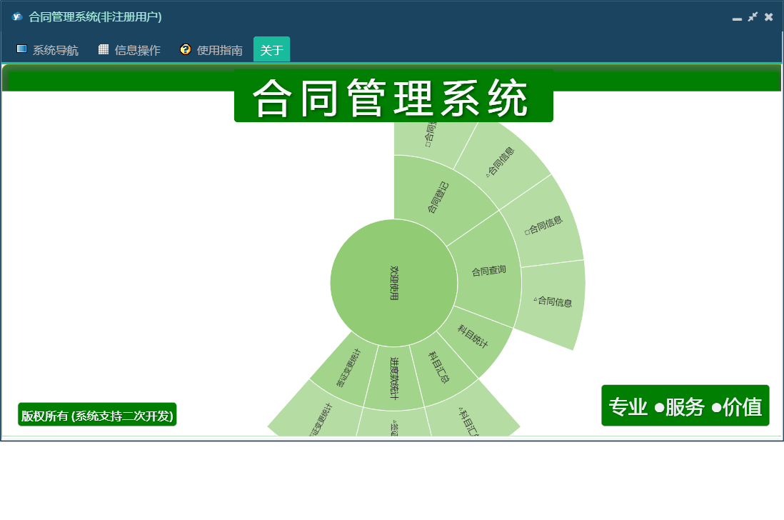 合同管理系统包含以下功能:面板、日志、关于、合同登记、权限设置、合同查询等