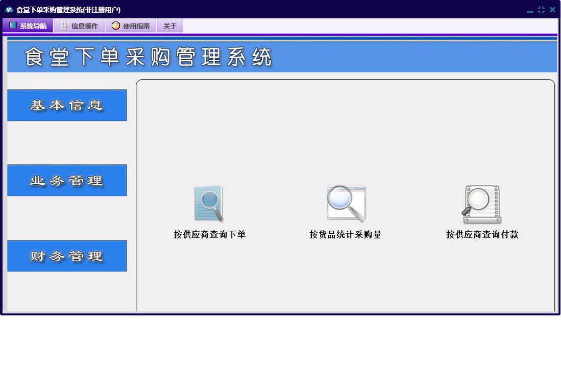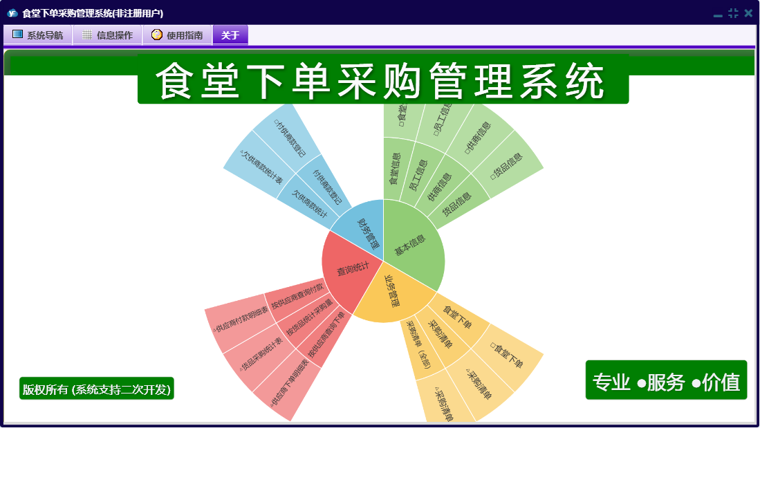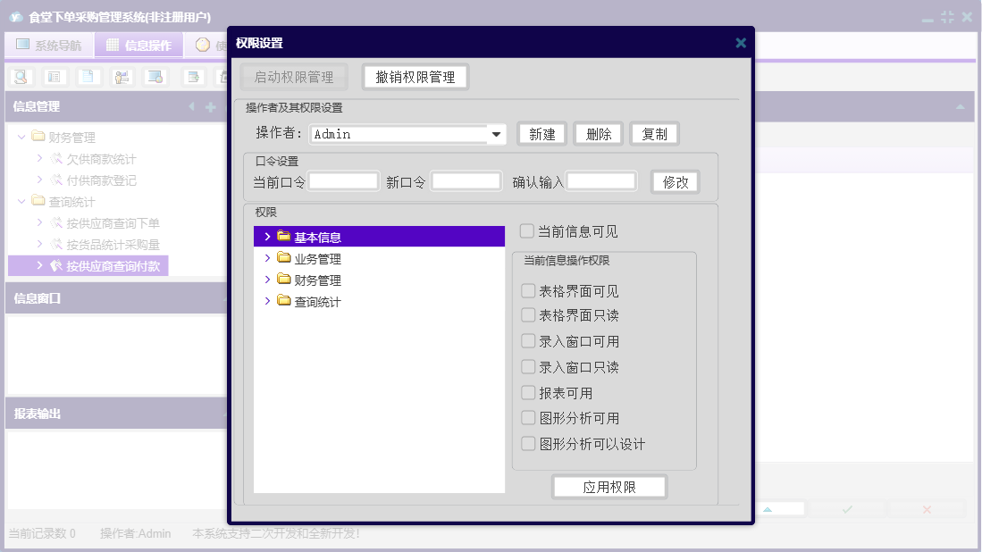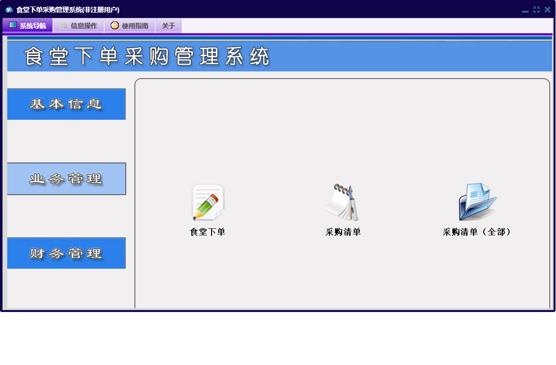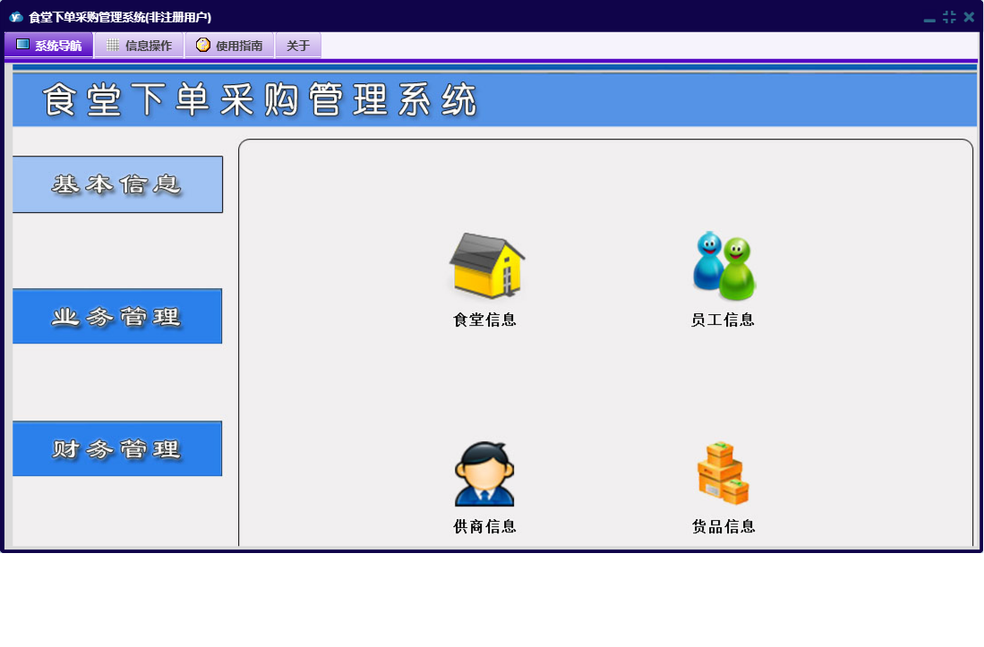 食堂下单采购管理系统包含以下功能:货品信息、查询统计、员工信息、日志、付供商款登记、食堂信息、关于、基本信息、权限设置、业务管理、财务管理、供商信息等