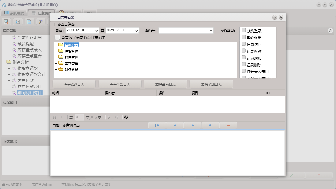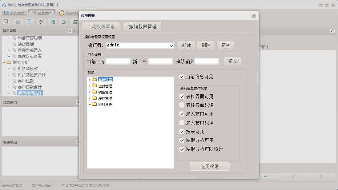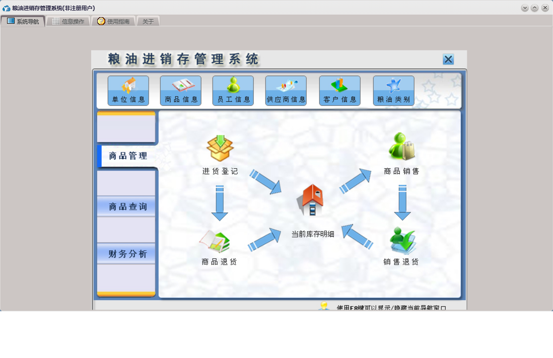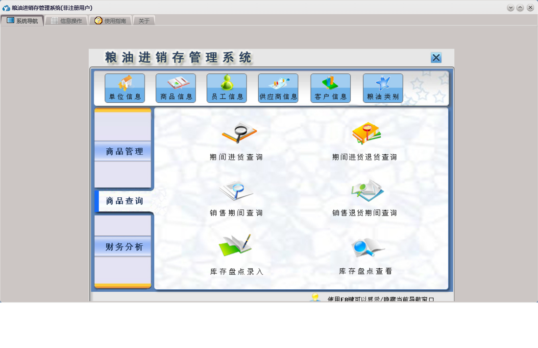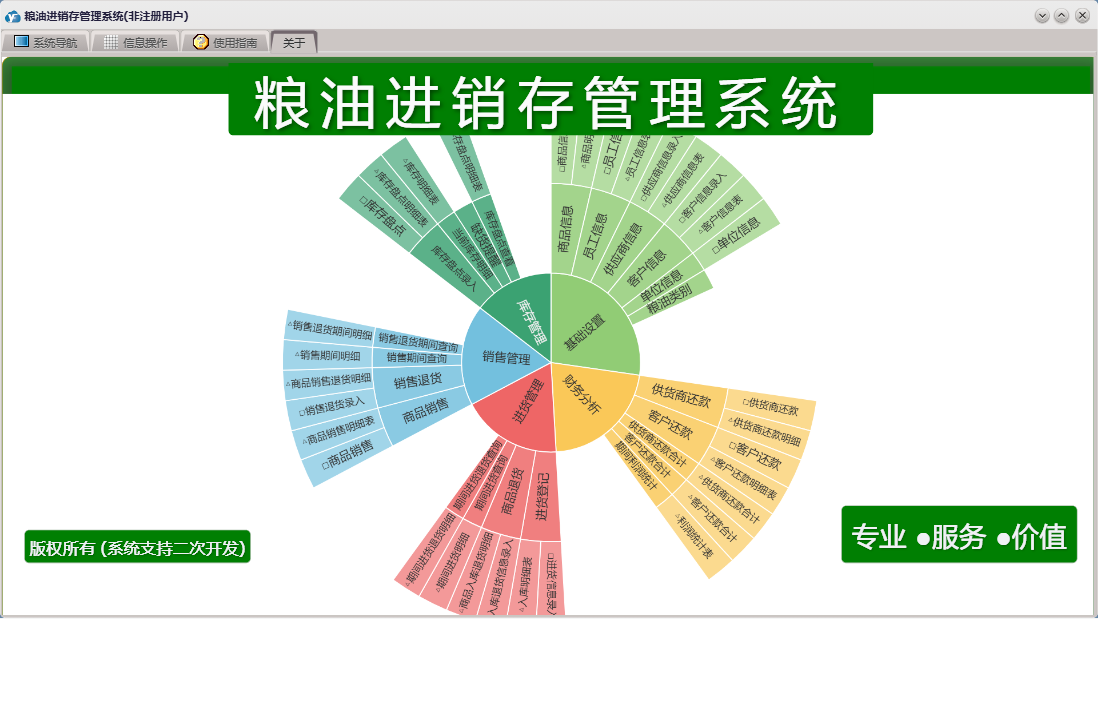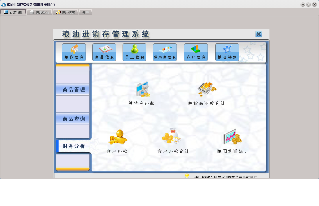 粮油进销存管理系统包含以下功能:供应商信息、单位信息、商品销售、商品管理、供货商还款、商品信息、员工信息、销售退货、商品退货、日志、财务分析、关于、商品查询、权限设置、客户信息、客户还款、库存盘点录入、进货登记等