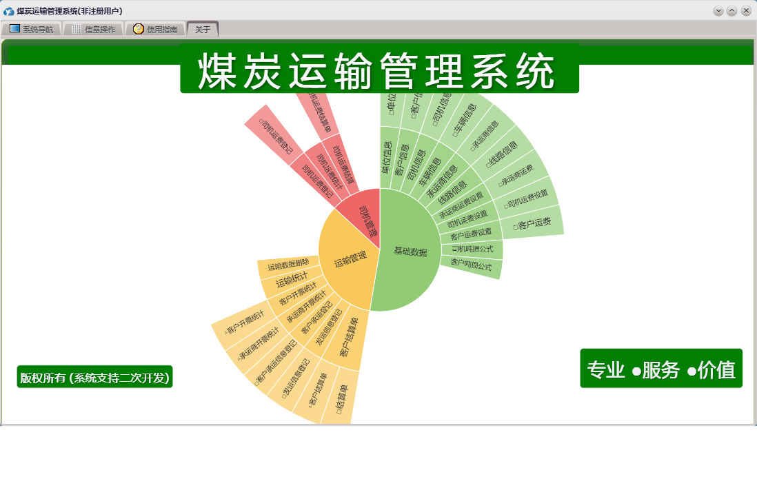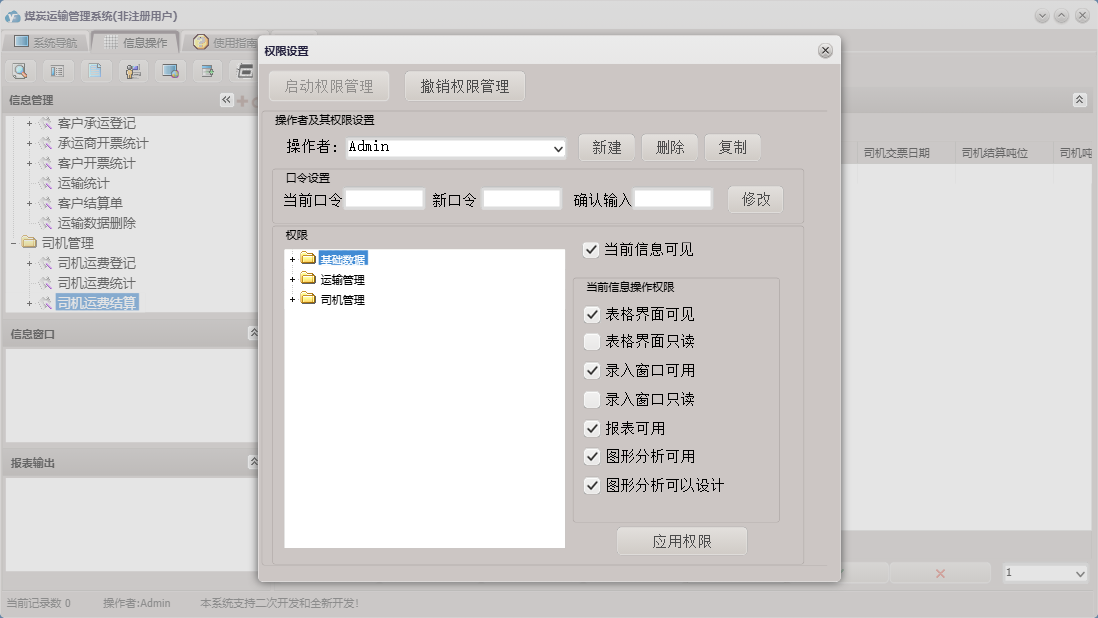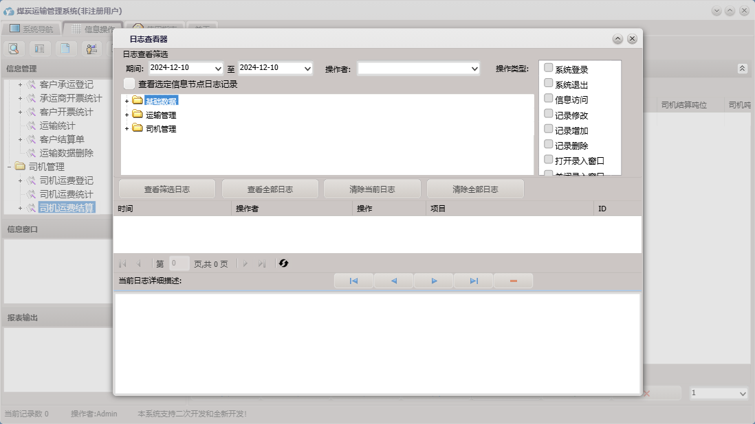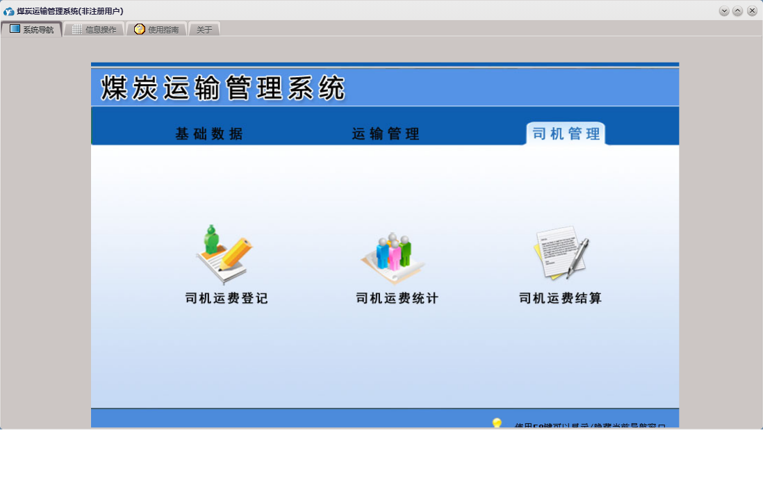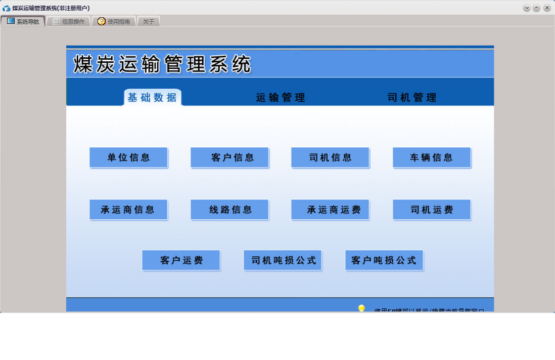 煤炭运输管理系统包含以下功能:基础数据、线路信息、运输管理、客户信息、承运商运费设置、承运商信息、发运信息登记、司机信息、客户承运登记、客户运费设置、日志、司机运费登记、关于、司机运费设置、权限设置、客户结算单、司机管理、车辆信息等