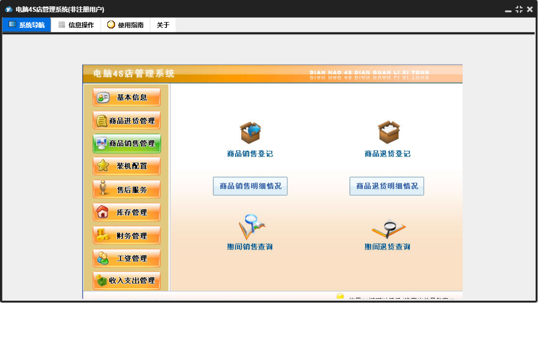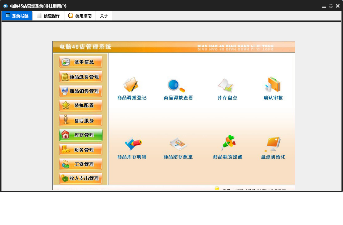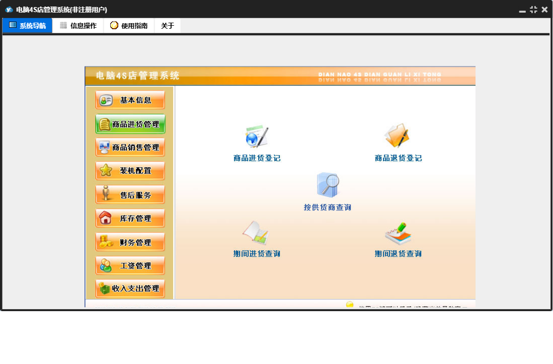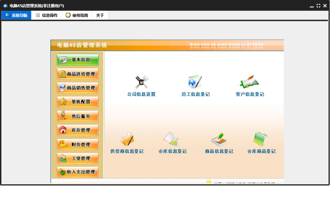 电脑4S店管理系统包含以下功能:供货商信息登记、仓库商品登记、收入支出管理、商品退货、售后服务、公司信息设置、财务管理、商品信息登记、工资管理、商品进货管理、仓库信息登记、库存管理、客户信息登记、关于、基本信息、商品进货、商品销售、员工信息登记、商品销售管理、装机配置等