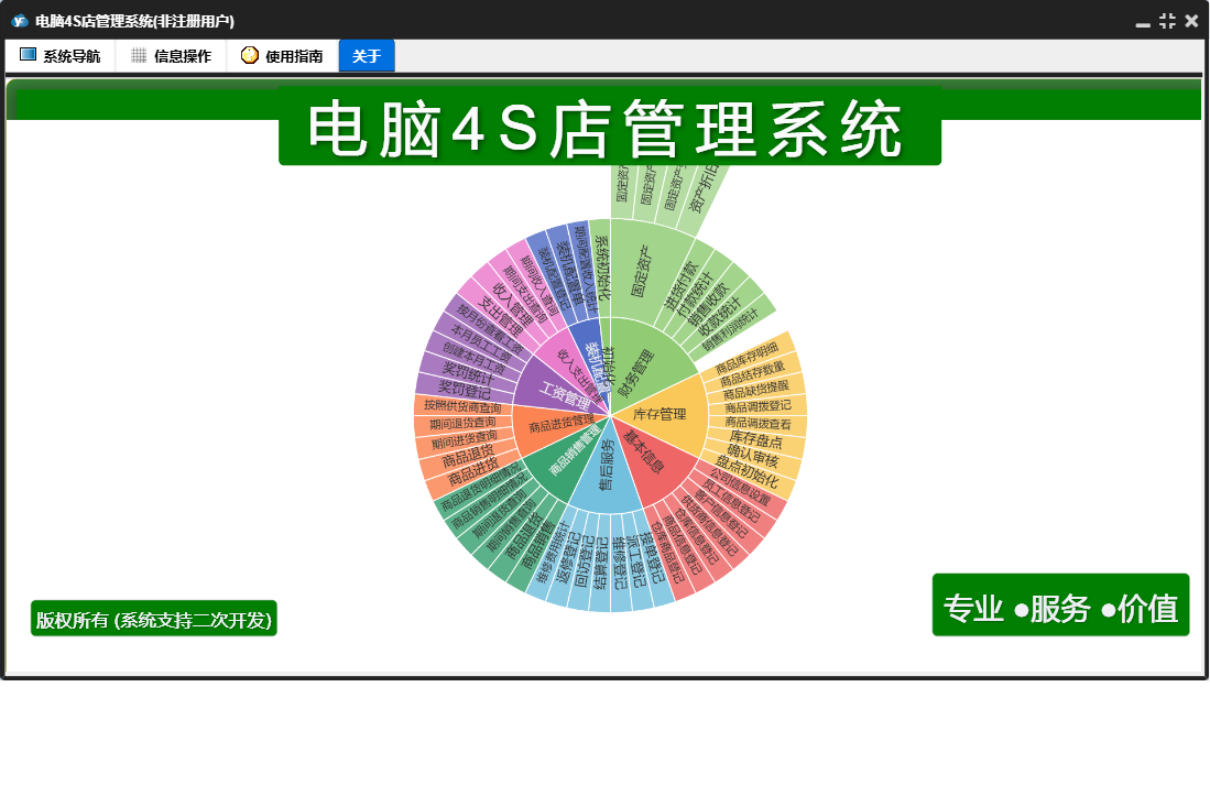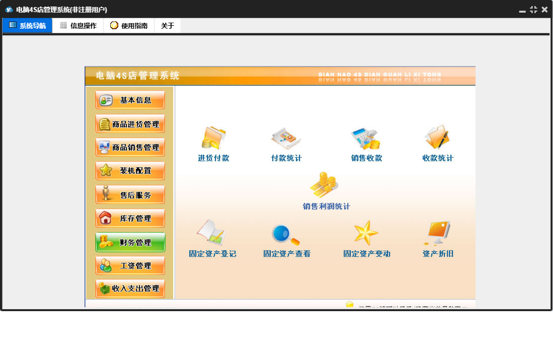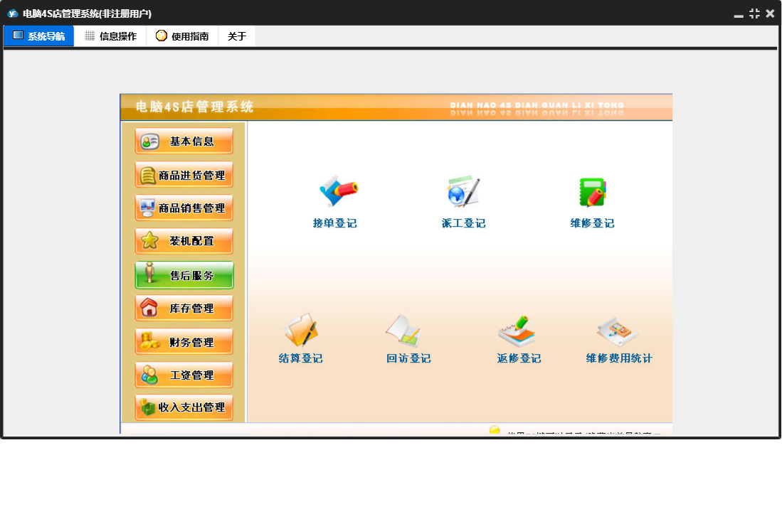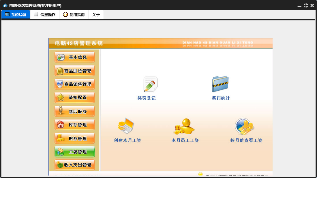 电脑4S店管理系统包含以下功能:供货商信息登记、仓库商品登记、收入支出管理、商品退货、售后服务、公司信息设置、财务管理、商品信息登记、工资管理、商品进货管理、仓库信息登记、库存管理、客户信息登记、关于、基本信息、商品进货、商品销售、员工信息登记、商品销售管理、装机配置等