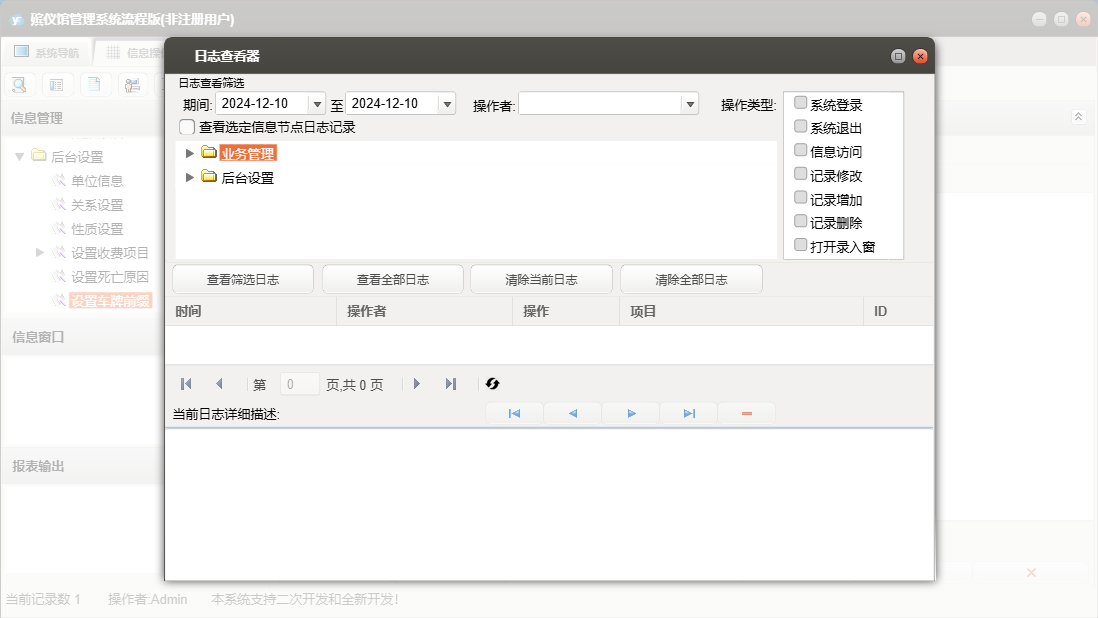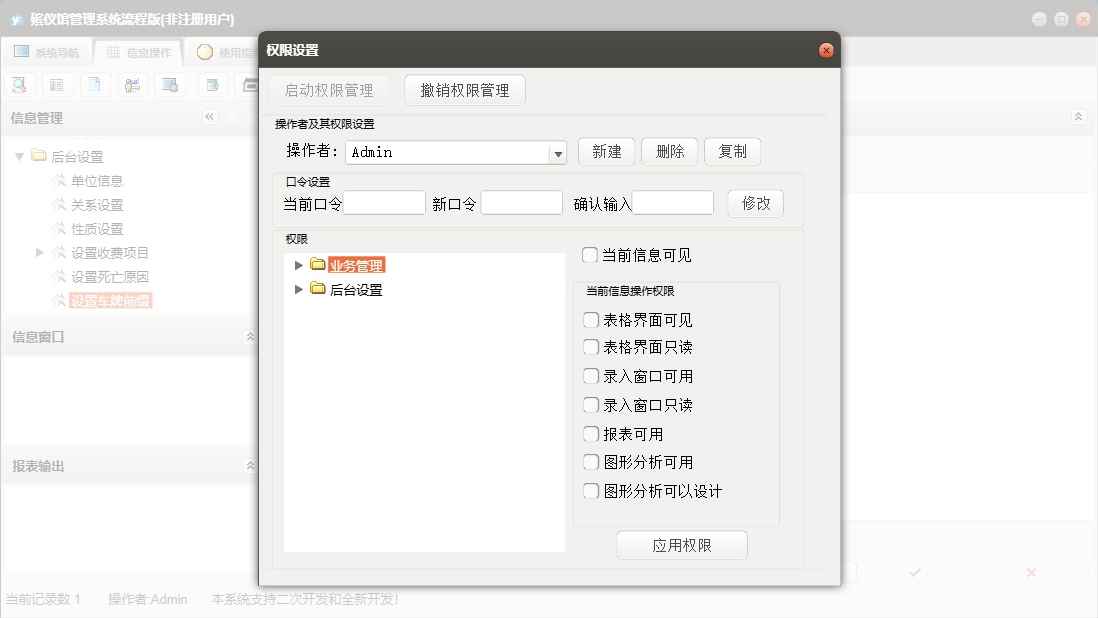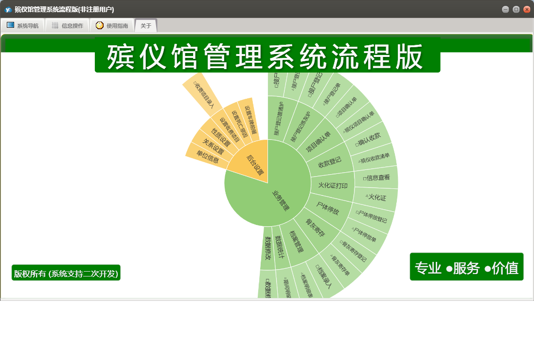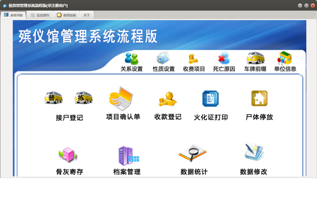 殡仪馆管理系统流程版包含以下功能:数据修改、火化证打印、面板、接尸登记拣灰炉、日志、项目确认单、骨灰寄存、关于、尸体停放、设置收费项目、权限设置、收款登记、接尸登记普通炉、档案管理等