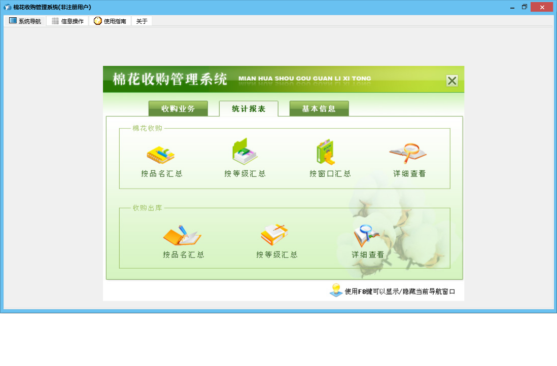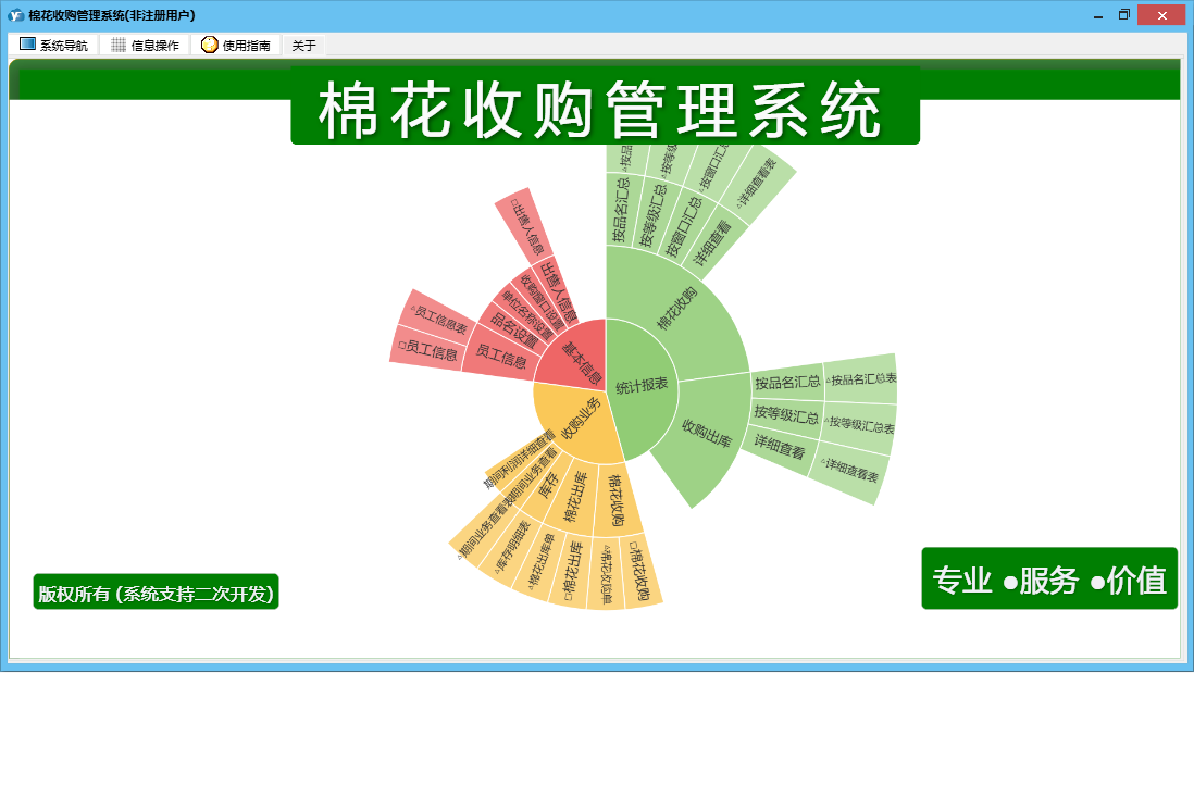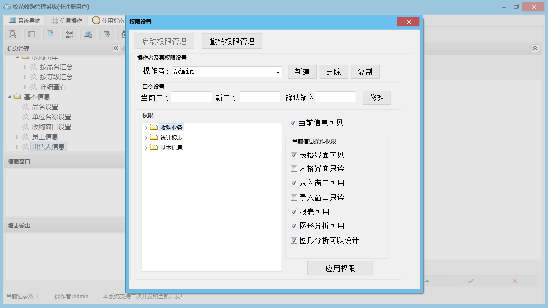 棉花收购管理系统包含以下功能:出售人信息、收购业务、员工信息、日志、关于、权限设置、统计、棉花出库、棉花收购、参数设置等
