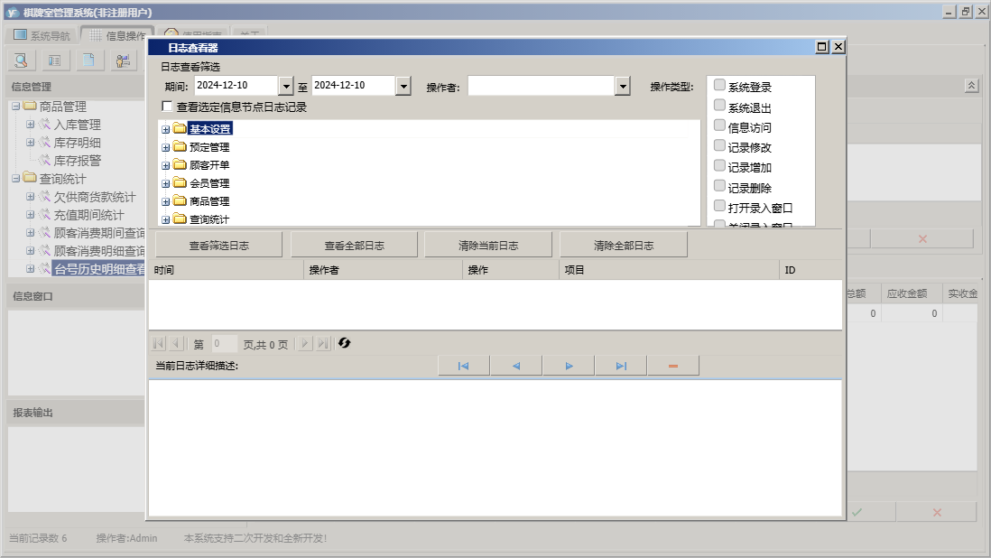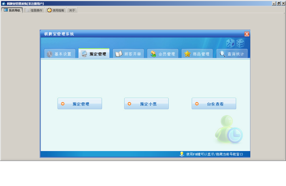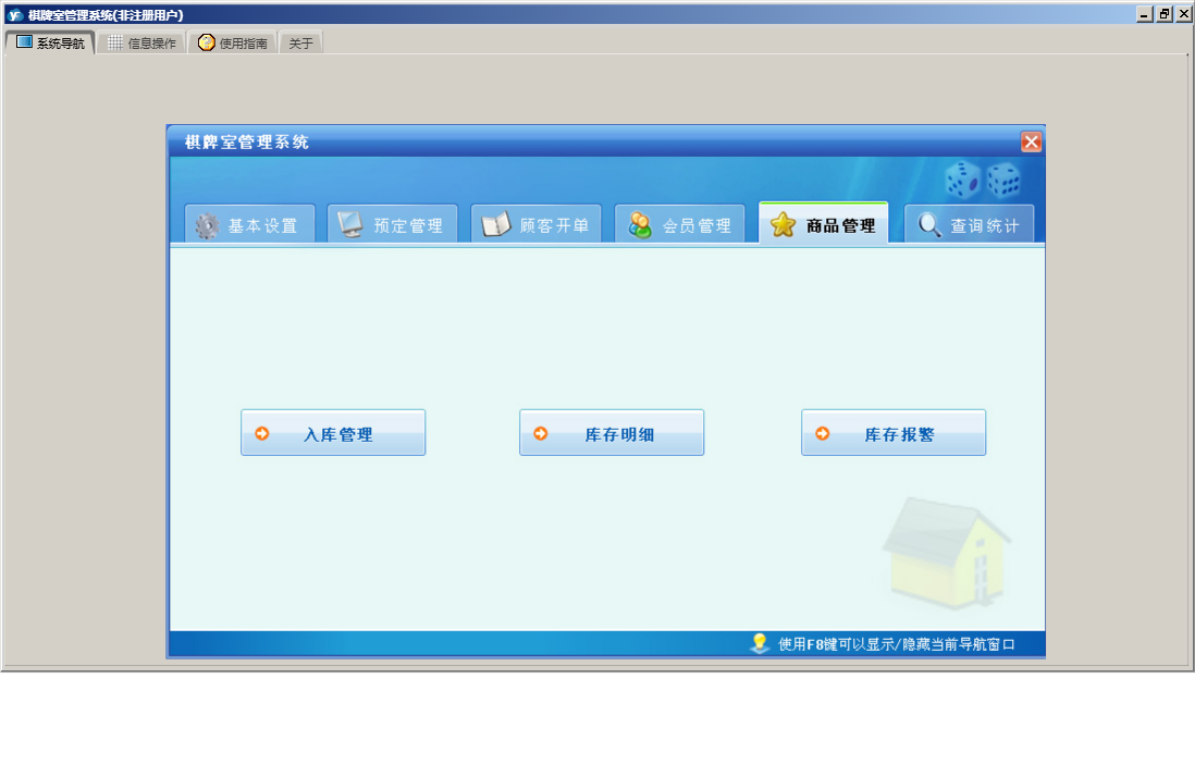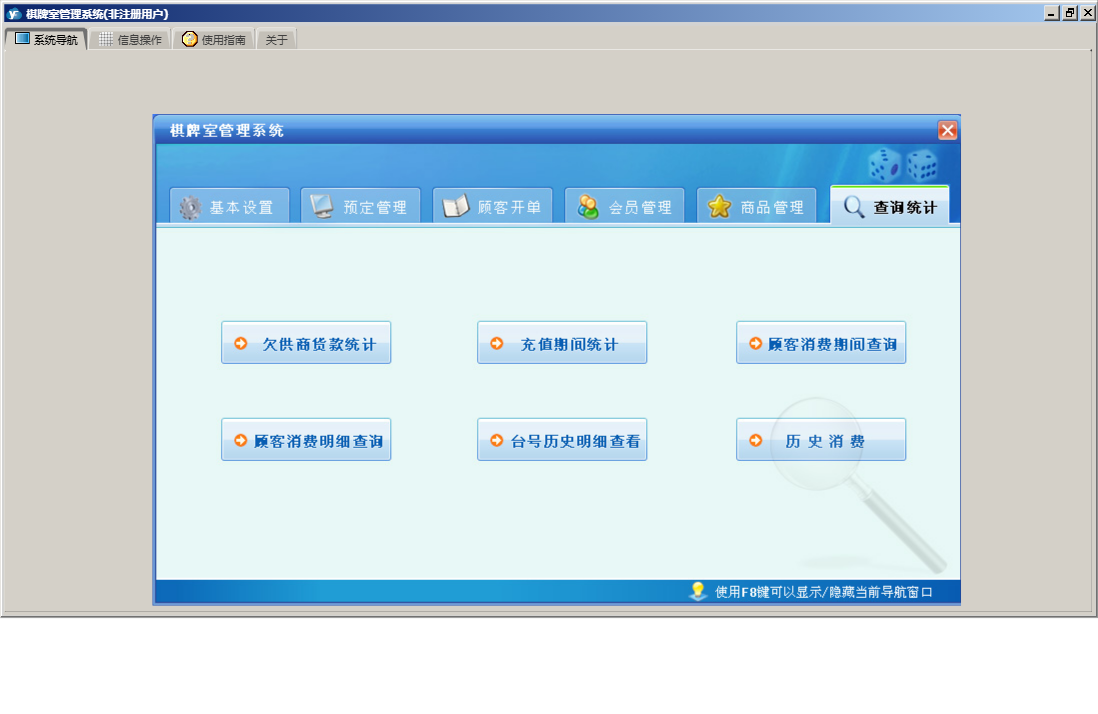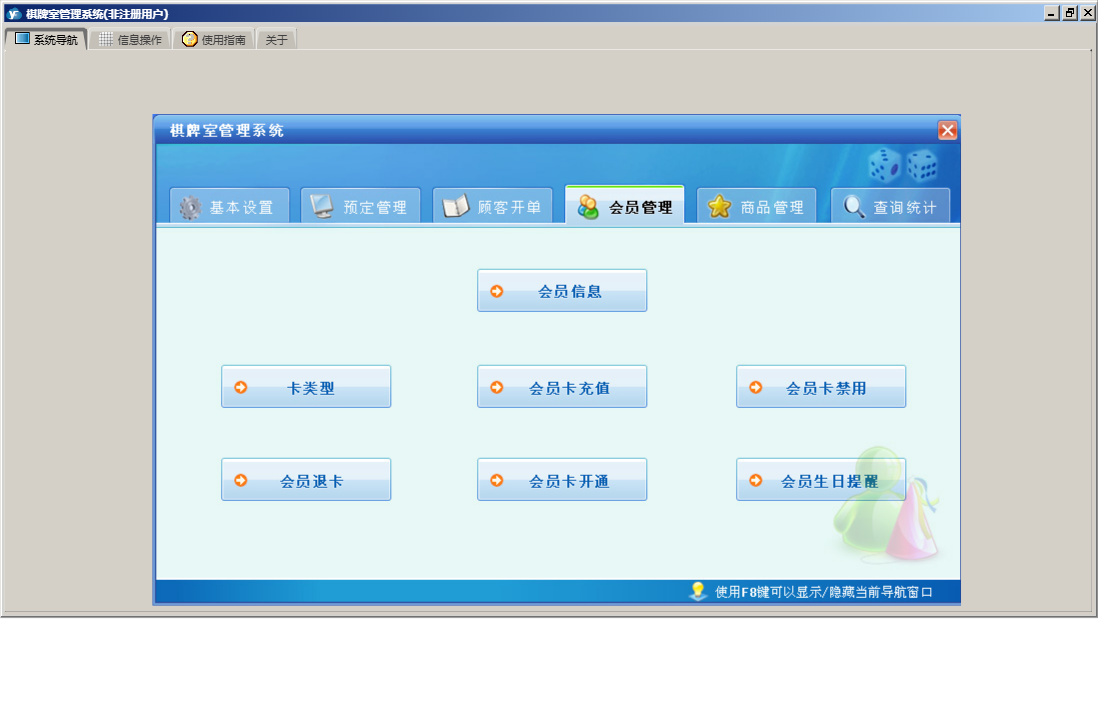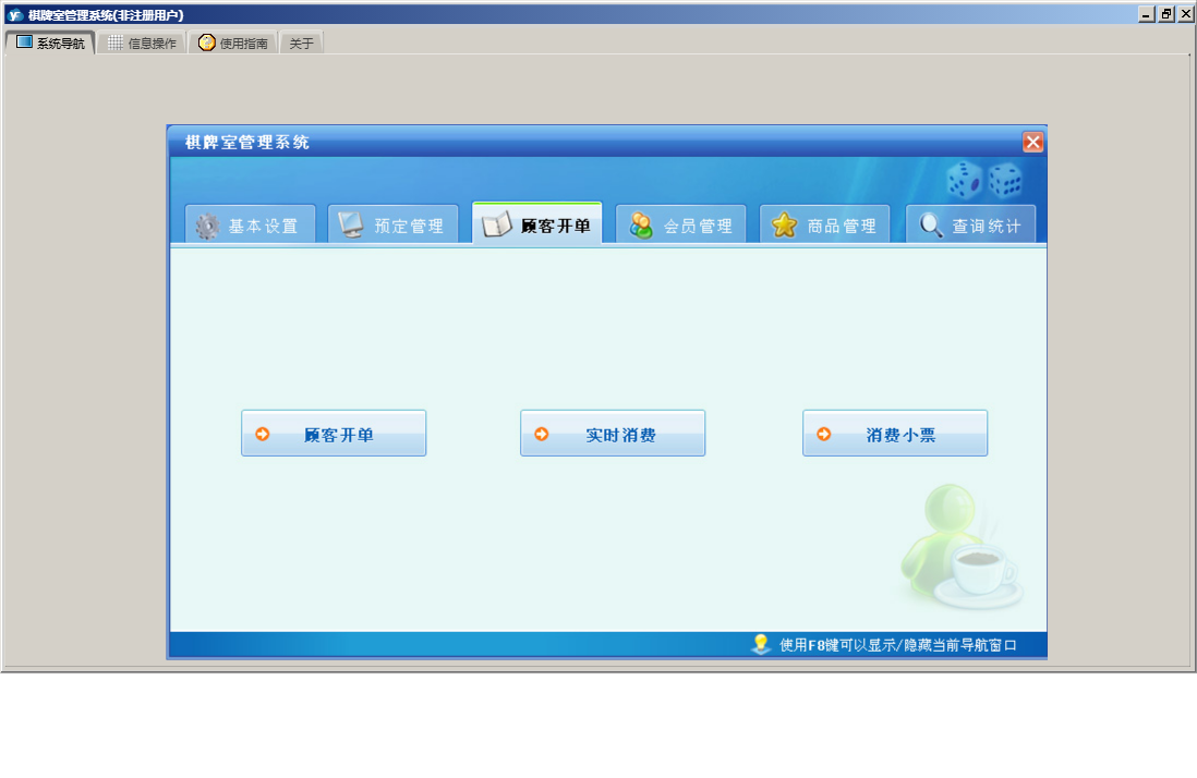 棋牌室管理系统包含以下功能:顾客开单、会员信息、查询统计、基本设置、卡类型、状态图示、来宾登记、会员卡开通、商品信息、会员卡禁用、权限设置、预定管理、台位查看、关于、会员卡充值、入库管理、商品管理、会员管理、员工信息、日志、台位设置、实时消费、会员退卡、台号历史明细查看、供商信息等