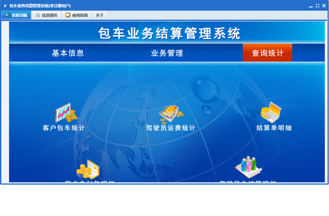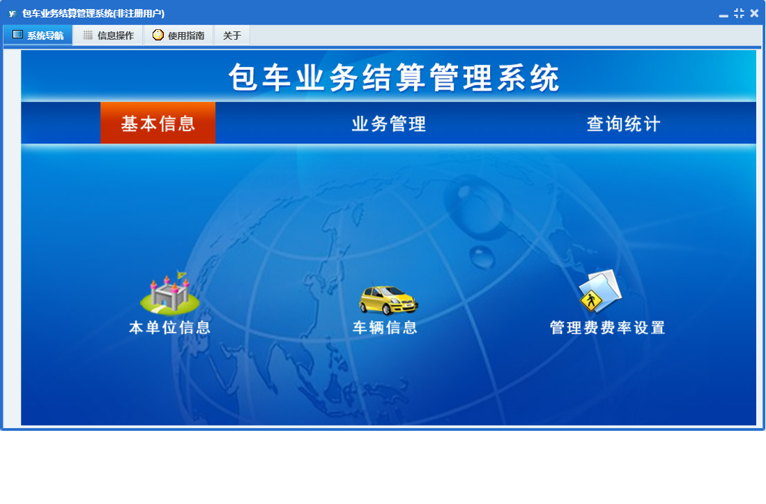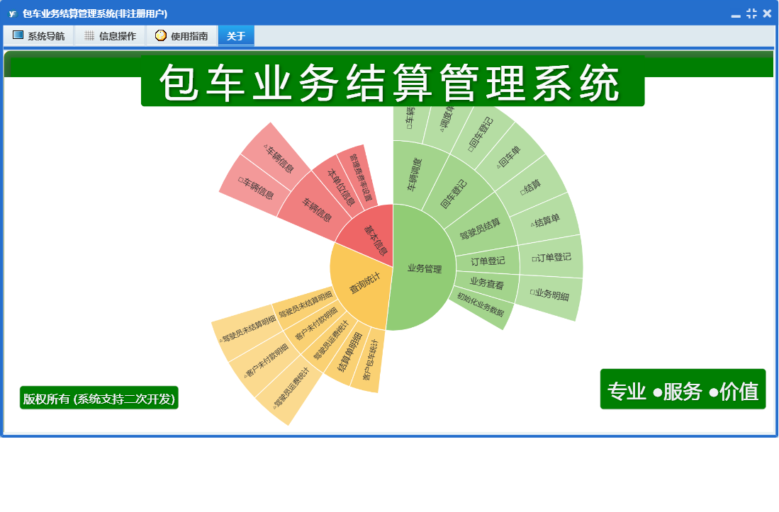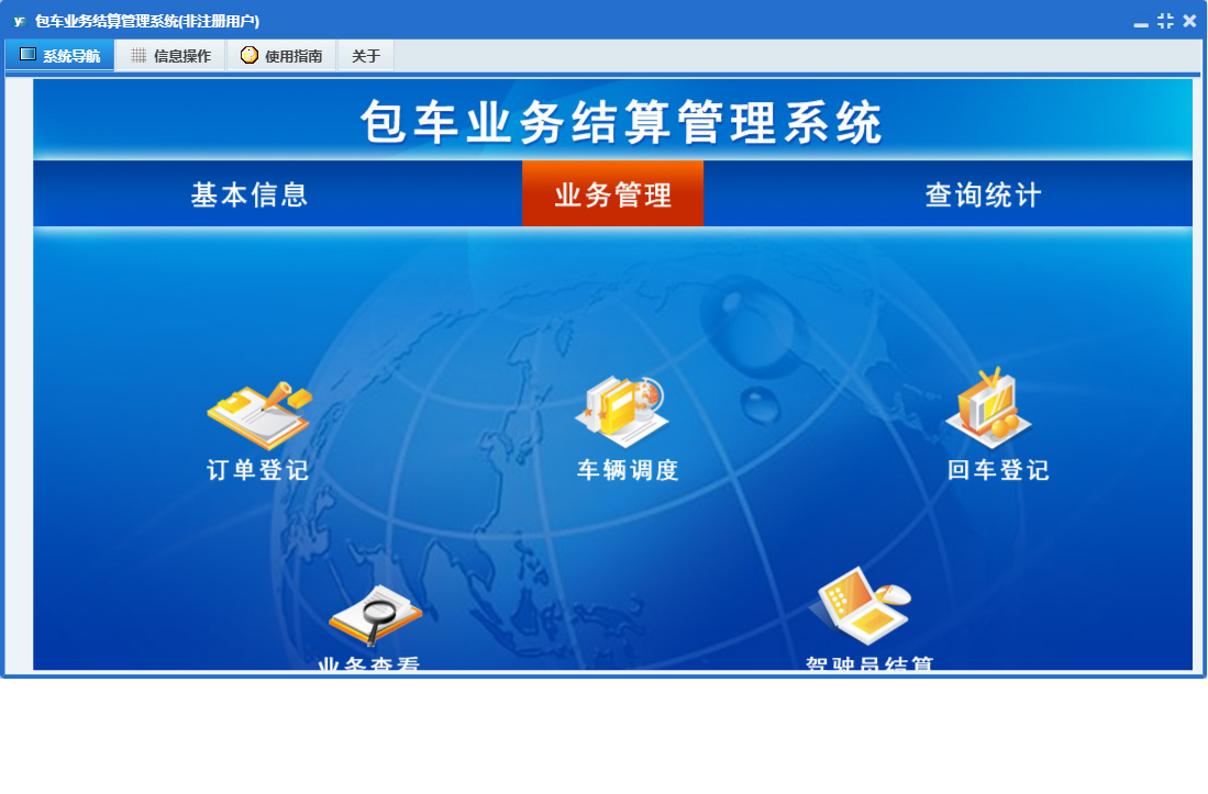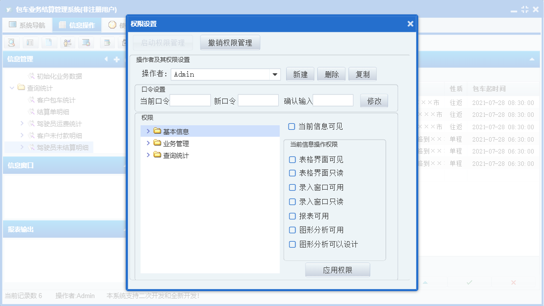 包车业务结算管理系统包含以下功能:日志、关于、权限设置、驾驶员结算、业务查看、基本信息、统计查询、业务管理等