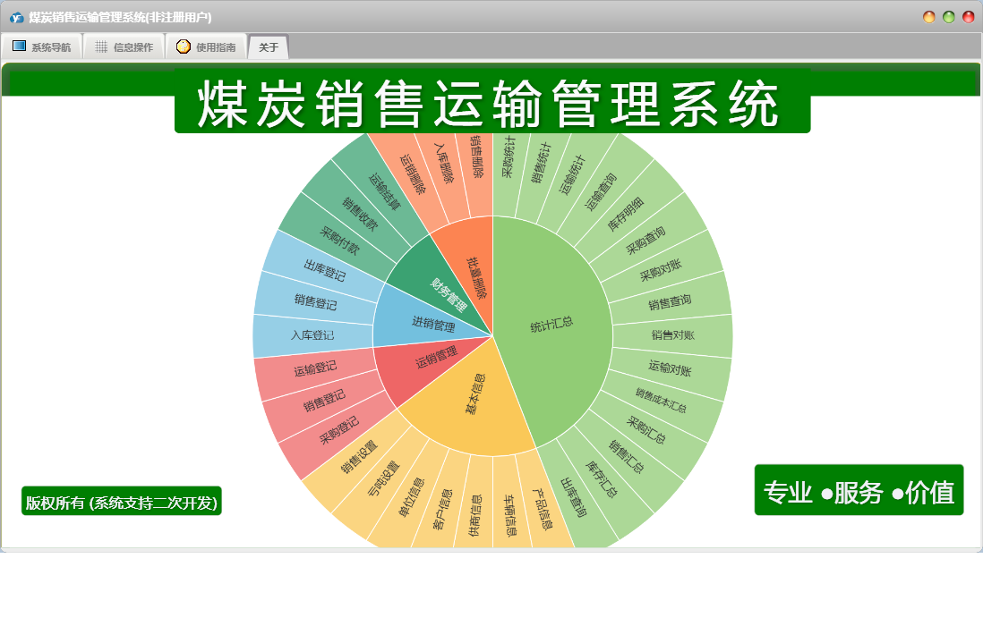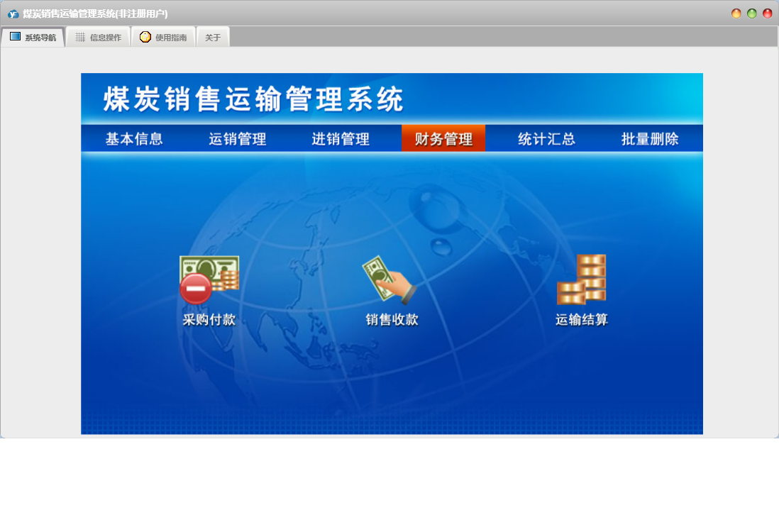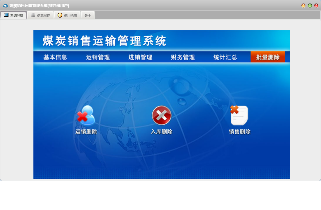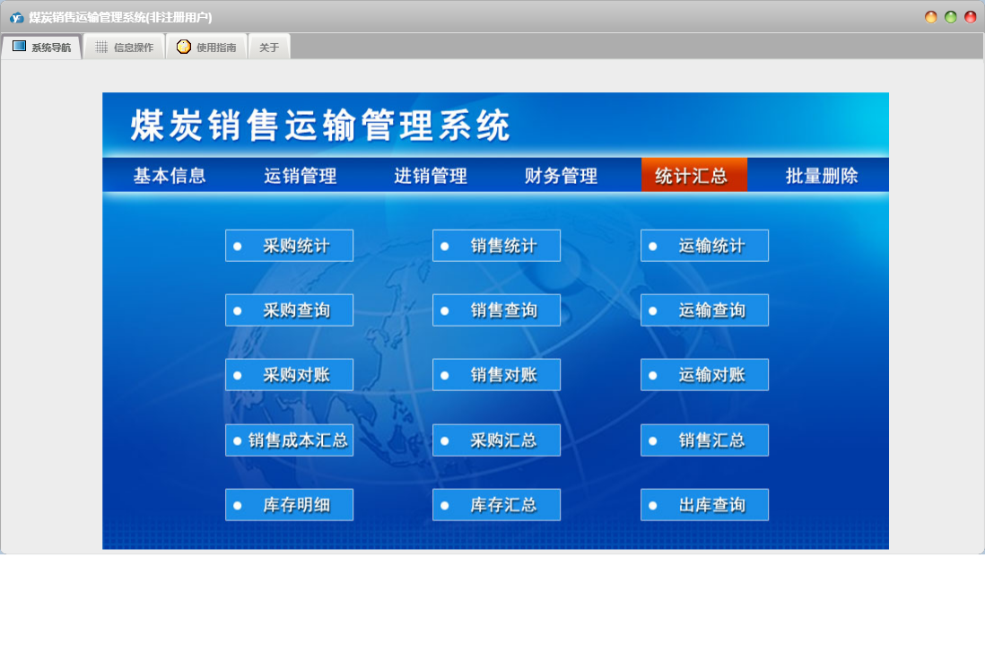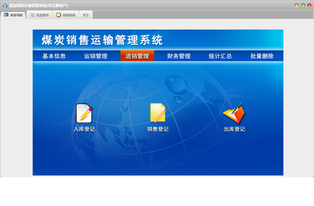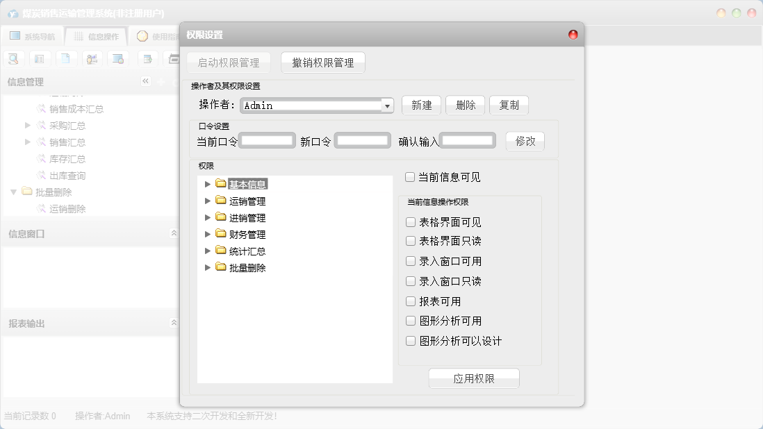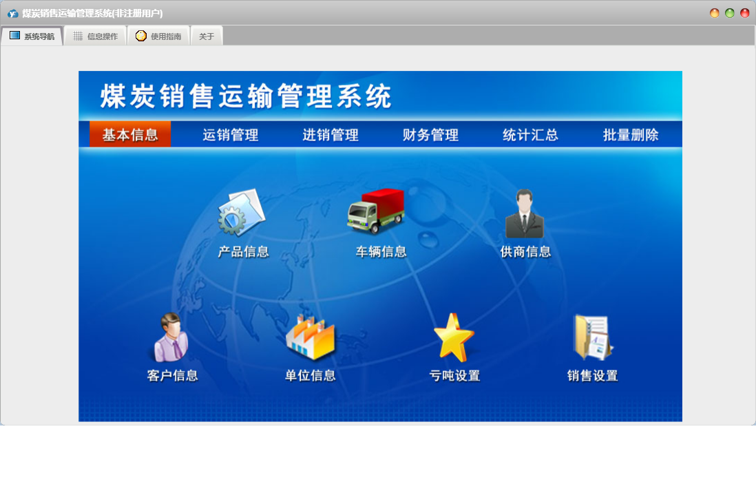 煤炭销售运输管理系统包含以下功能:出库登记、采购付款、运输结算、产品信息、统计汇总、进销管理、财务管理、入库登记、采购登记、权限设置、运销管理、运输登记、销售收款、关于、销售登记、基本信息、客户信息、车辆信息、批量删除、日志、供商信息等