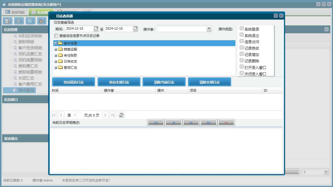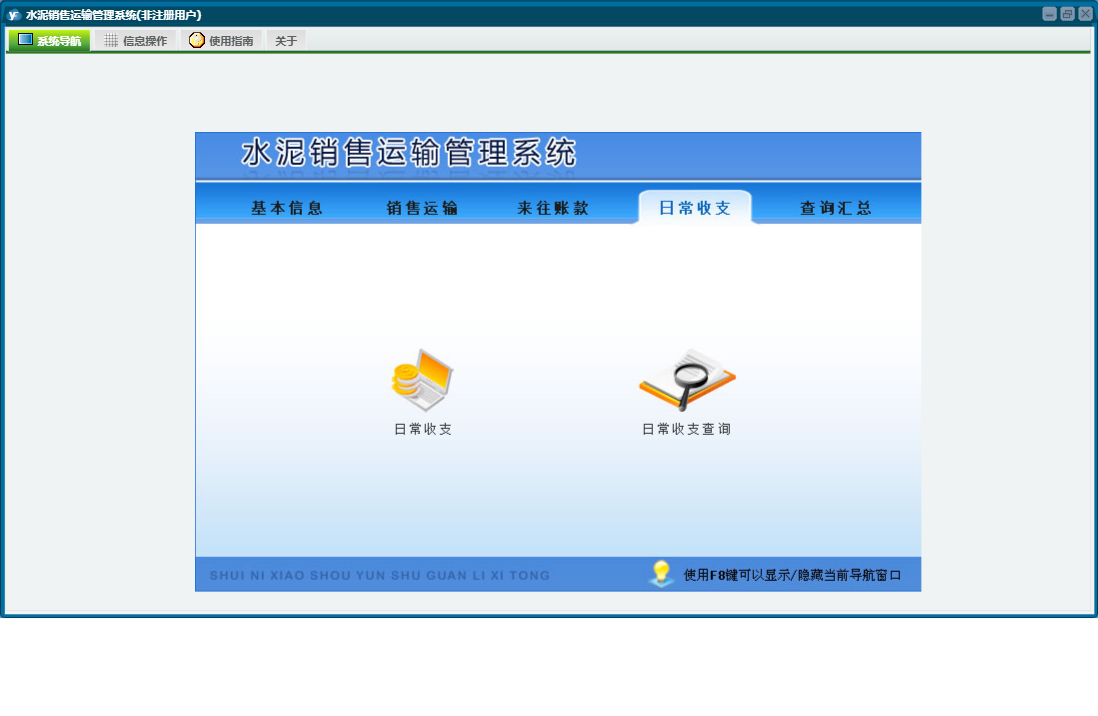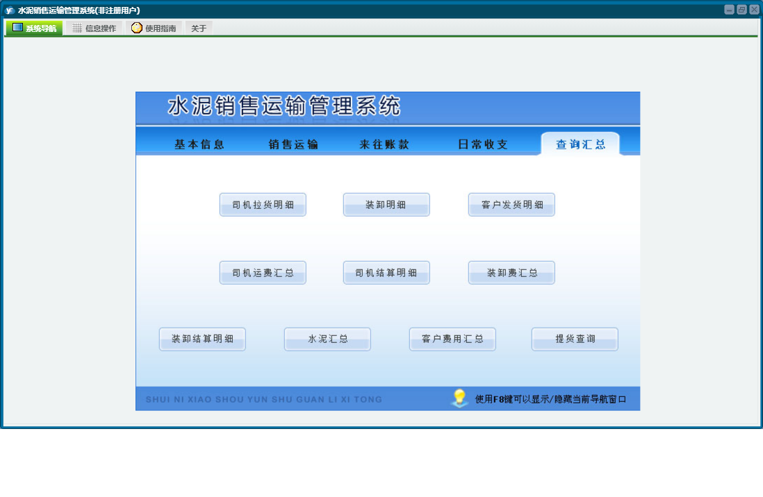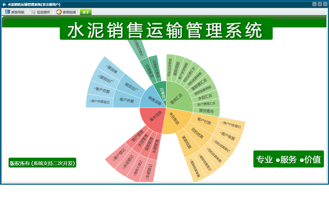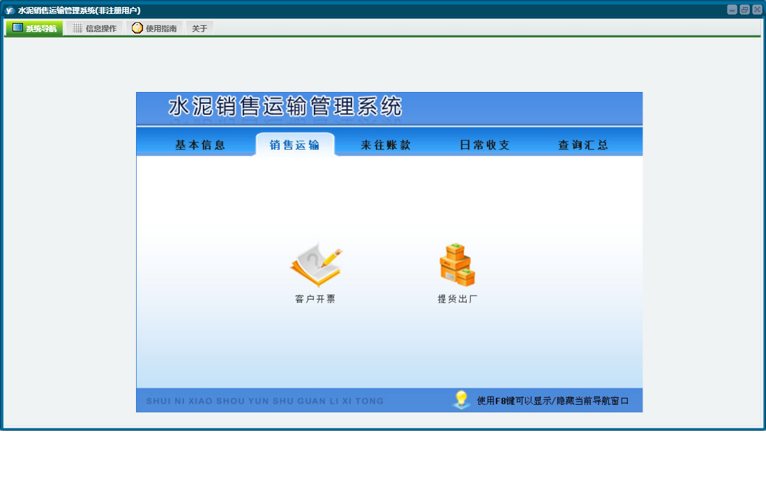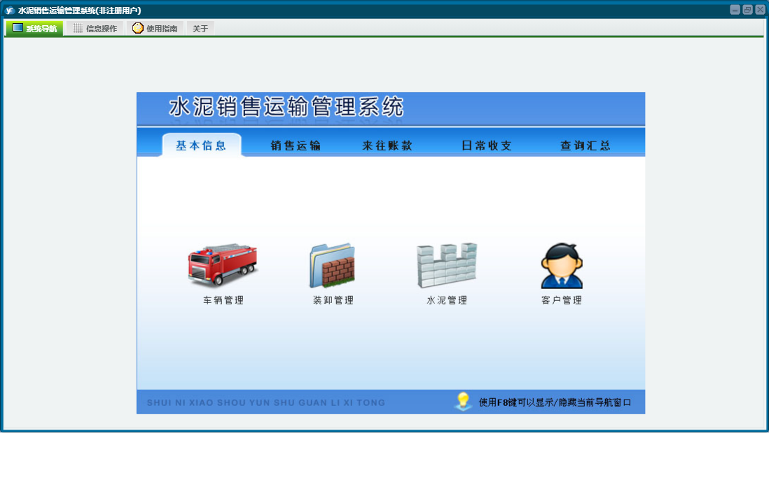 水泥销售运输管理系统包含以下功能:销售运输、客户付款、日常收支、客户开票、水泥管理、司机结算、客户管理、关于、基本信息、权限设置、日志、装卸结算、来往账款、查询汇总、装卸管理、提货出厂、车辆管理等