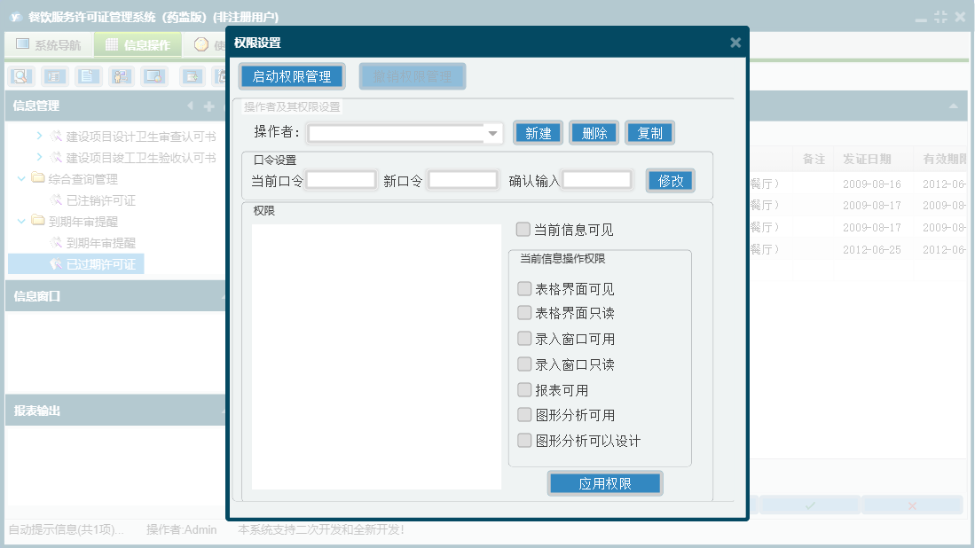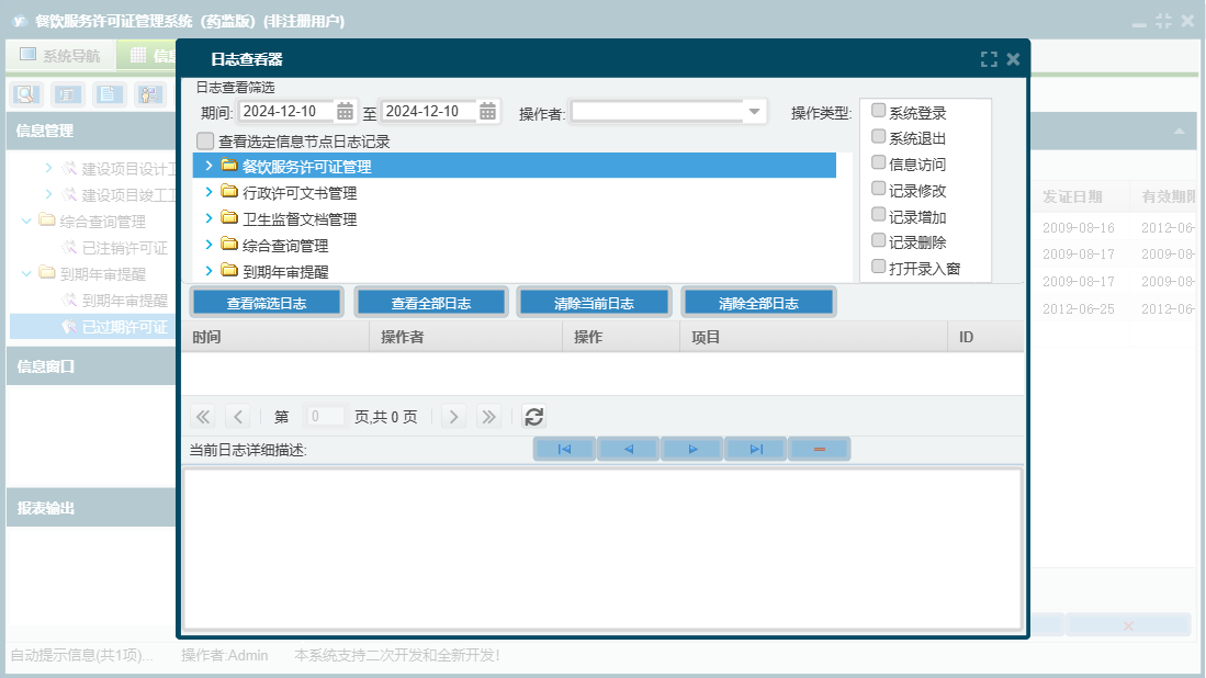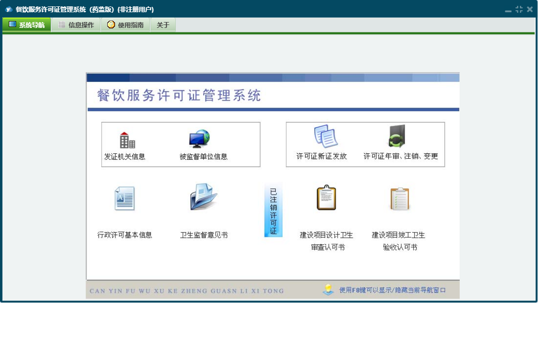 餐饮服务许可证管理系统(药监版)包含以下功能:被监督单位信息、1、行政许可基本信息、建设项目竣工卫生验收认可书、日志、关于、建设项目设计卫生审查认可书、许可证年审、注销、变更、权限设置、许可证新证发放、卫生监督意见书等