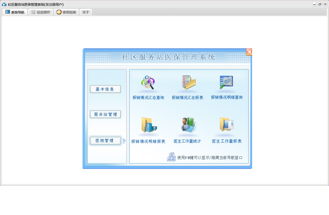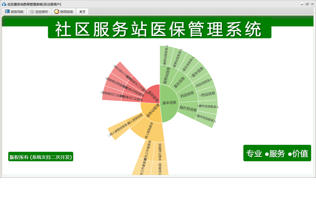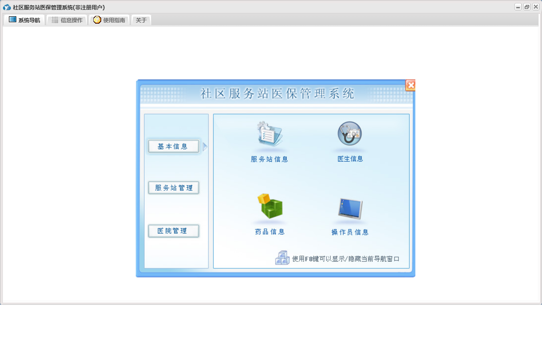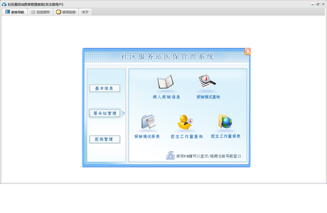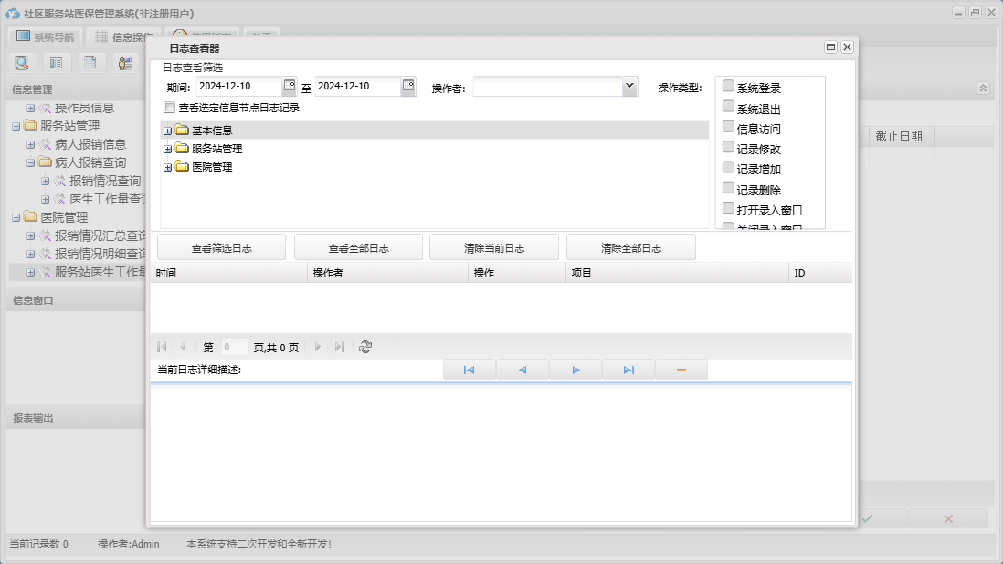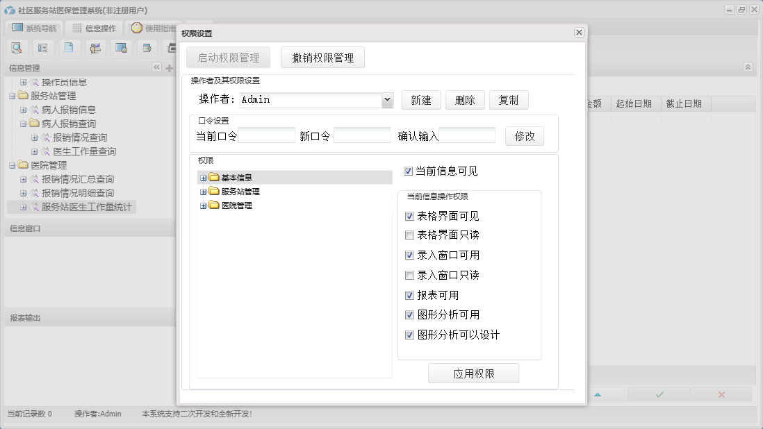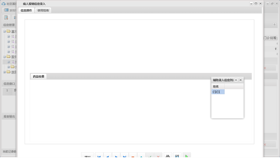 社区服务站医保管理系统包含以下功能:药品信息、医院管理、日志、关于、权限设置、操作员信息、基本信息、病人报销信息、医生信息、服务站管理、服务站信息等
