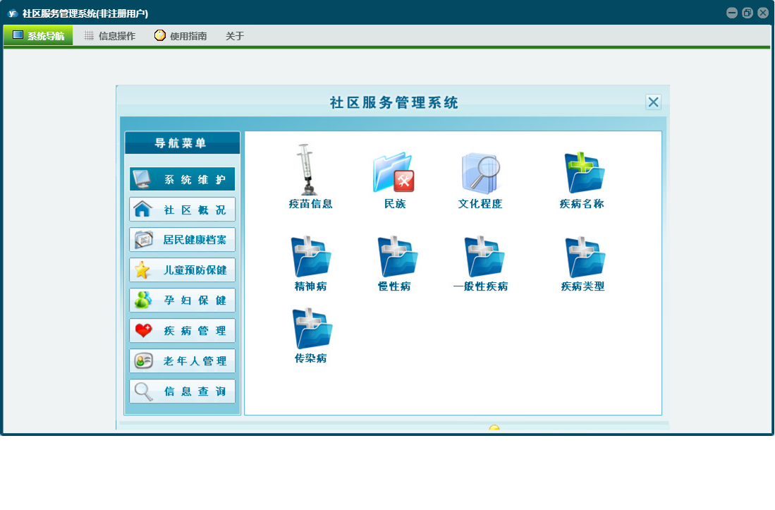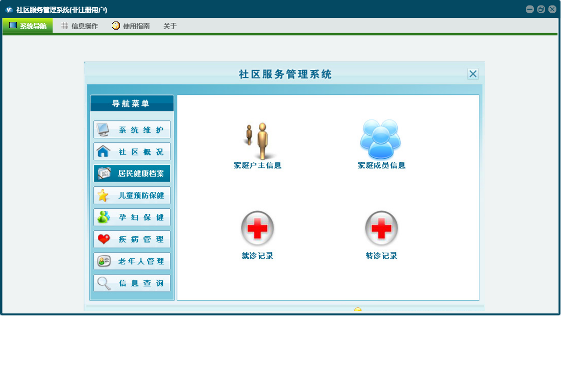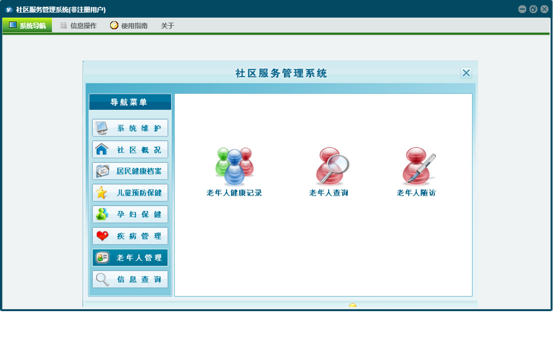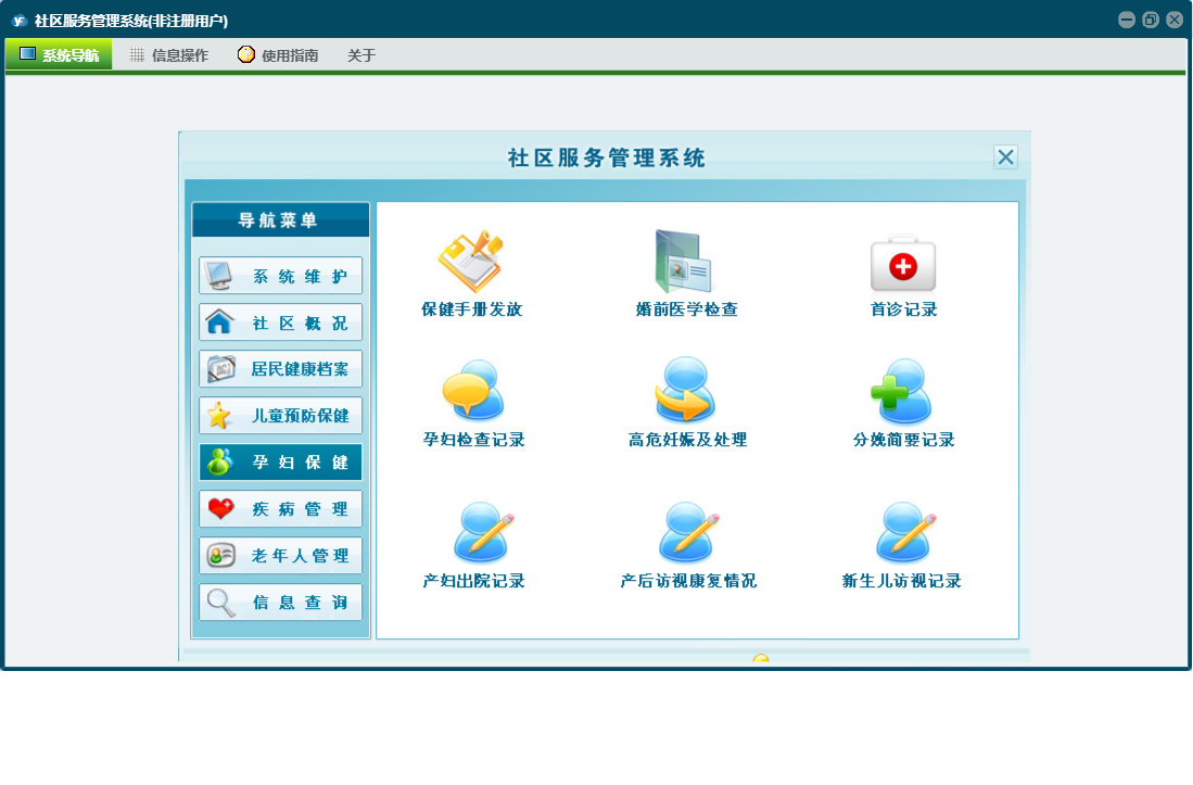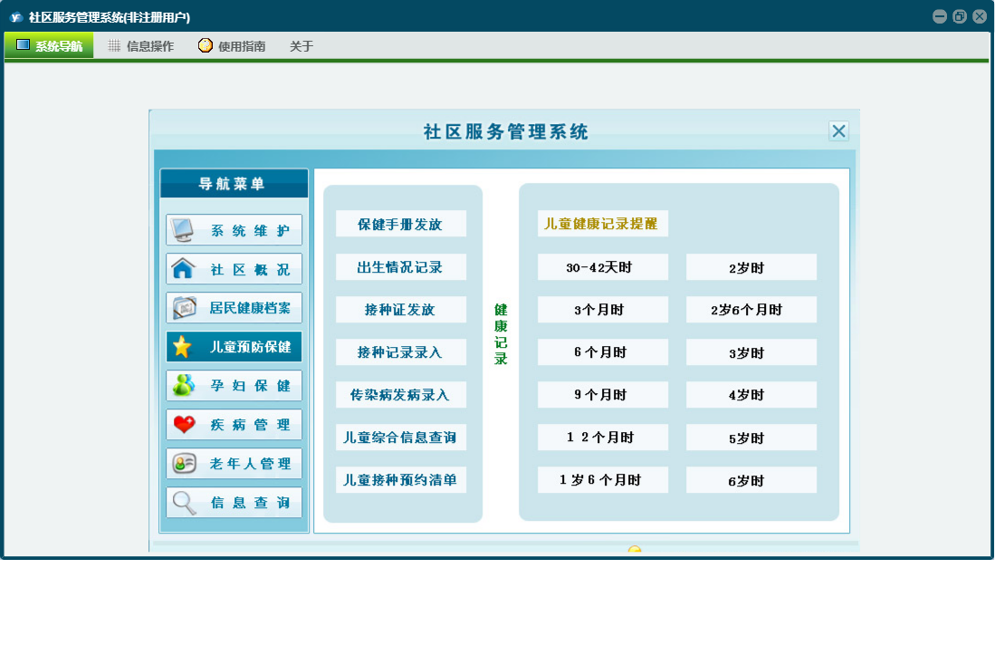 社区服务管理系统包含以下功能:12个月时健康情况记录、9个月时健康情况记录、2岁时健康情况记录、分娩简要记录、产妇出院记录、新生儿访视记录、3岁时健康情况记录、4岁时健康情况记录、传染病人随访、老年人健康记录、儿童预防保健、老年人随访、保健手册发放、2岁6个月时健康情况记录、传染病报告卡、3个月时健康情况记录、6岁时健康情况记录、孕妇检查记录、孕妇保健、6个月时健康情况记录、权限设置、老年人管理、信息查询、转诊记录、1岁6个月时健康情况记录、高危妊娠及处理、就诊记录、家庭户主信息、婚前医学检查、慢性病随访、居民健康档案、社区概况、残疾人随访、精神病随访、关于、疫苗信息、疾病管理、社区服务人员信息、传染病发病录入、家庭成员信息、接种证发放、产后访视康复情况、接种记录录入、日志、首诊记录、疾病名称、出生情况记录、30-42天健康情况记录、5岁时健康情况记录、系统维护、社区信息等
