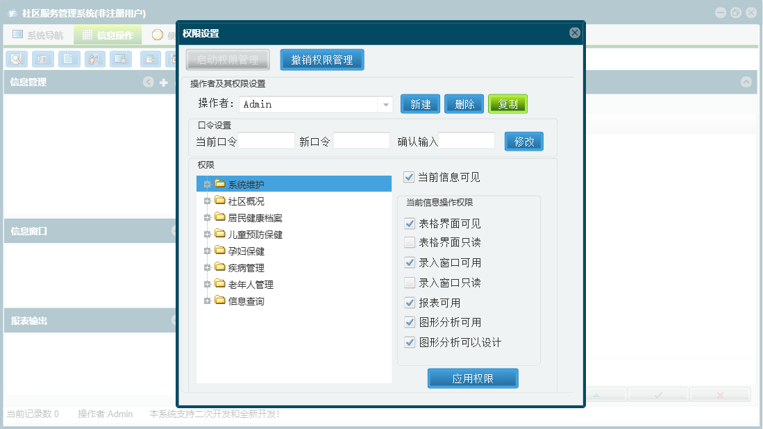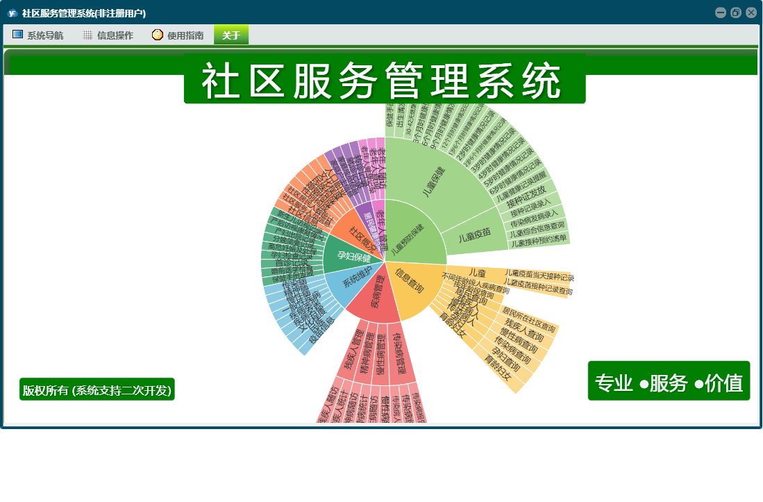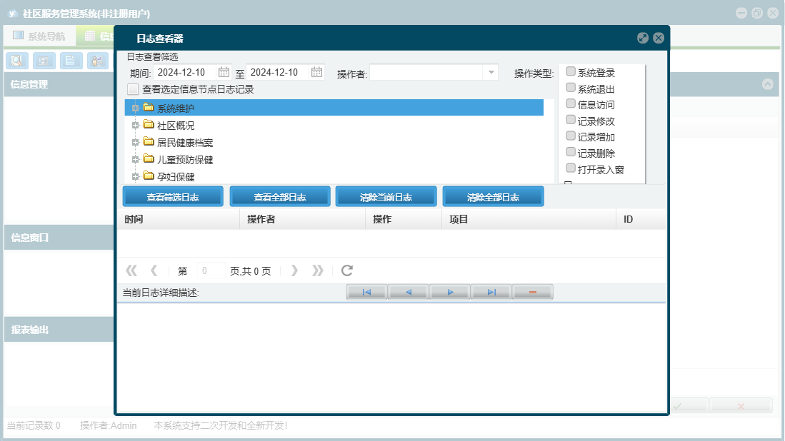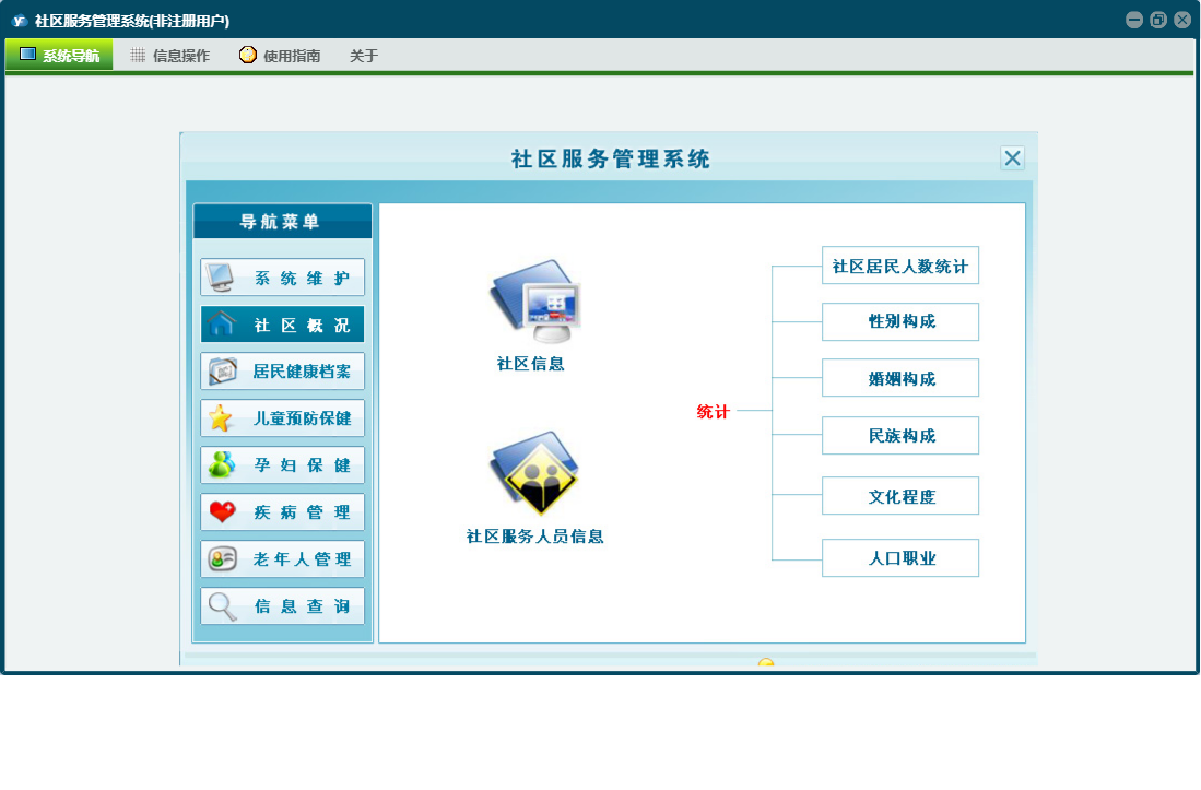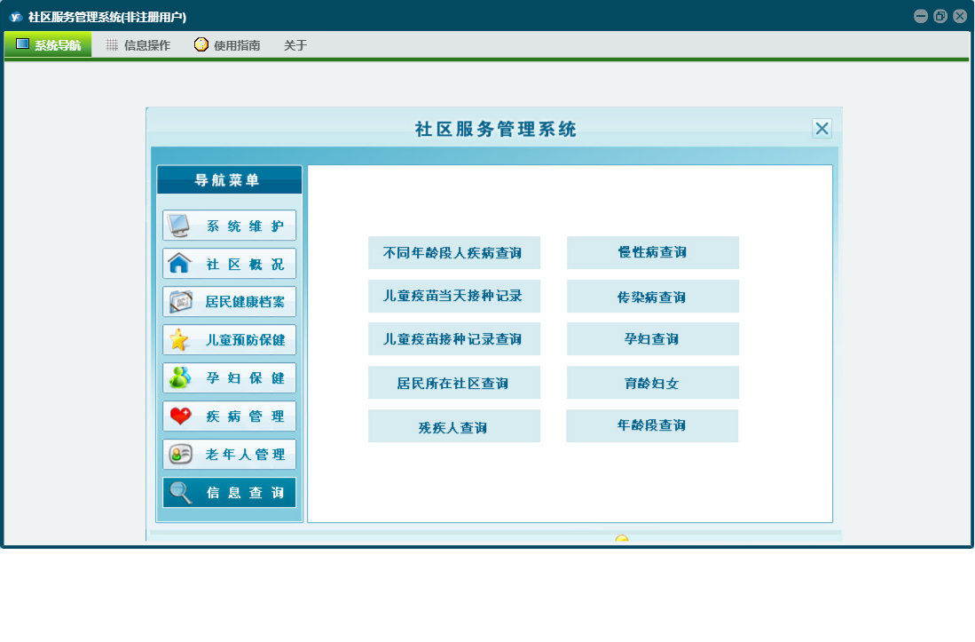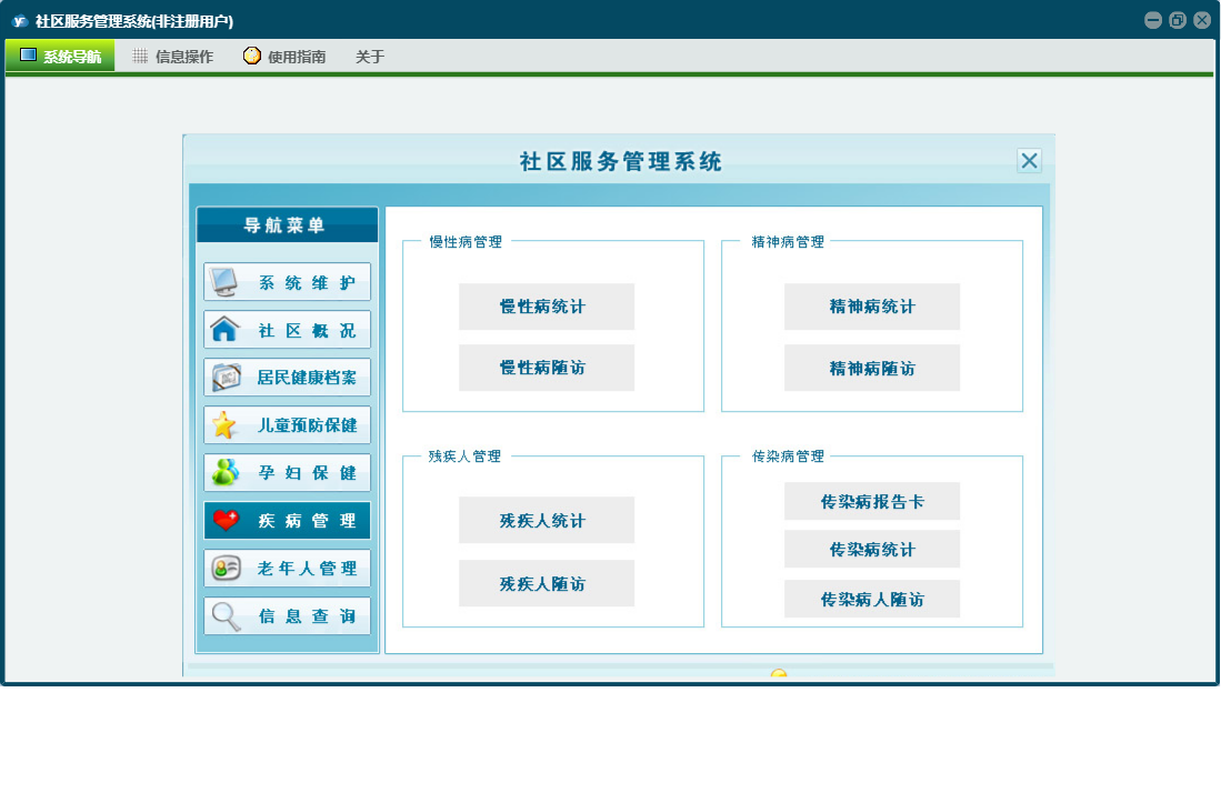 社区服务管理系统包含以下功能:12个月时健康情况记录、9个月时健康情况记录、2岁时健康情况记录、分娩简要记录、产妇出院记录、新生儿访视记录、3岁时健康情况记录、4岁时健康情况记录、传染病人随访、老年人健康记录、儿童预防保健、老年人随访、保健手册发放、2岁6个月时健康情况记录、传染病报告卡、3个月时健康情况记录、6岁时健康情况记录、孕妇检查记录、孕妇保健、6个月时健康情况记录、权限设置、老年人管理、信息查询、转诊记录、1岁6个月时健康情况记录、高危妊娠及处理、就诊记录、家庭户主信息、婚前医学检查、慢性病随访、居民健康档案、社区概况、残疾人随访、精神病随访、关于、疫苗信息、疾病管理、社区服务人员信息、传染病发病录入、家庭成员信息、接种证发放、产后访视康复情况、接种记录录入、日志、首诊记录、疾病名称、出生情况记录、30-42天健康情况记录、5岁时健康情况记录、系统维护、社区信息等