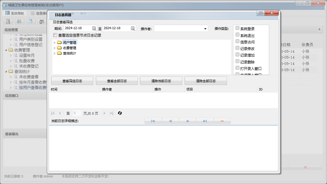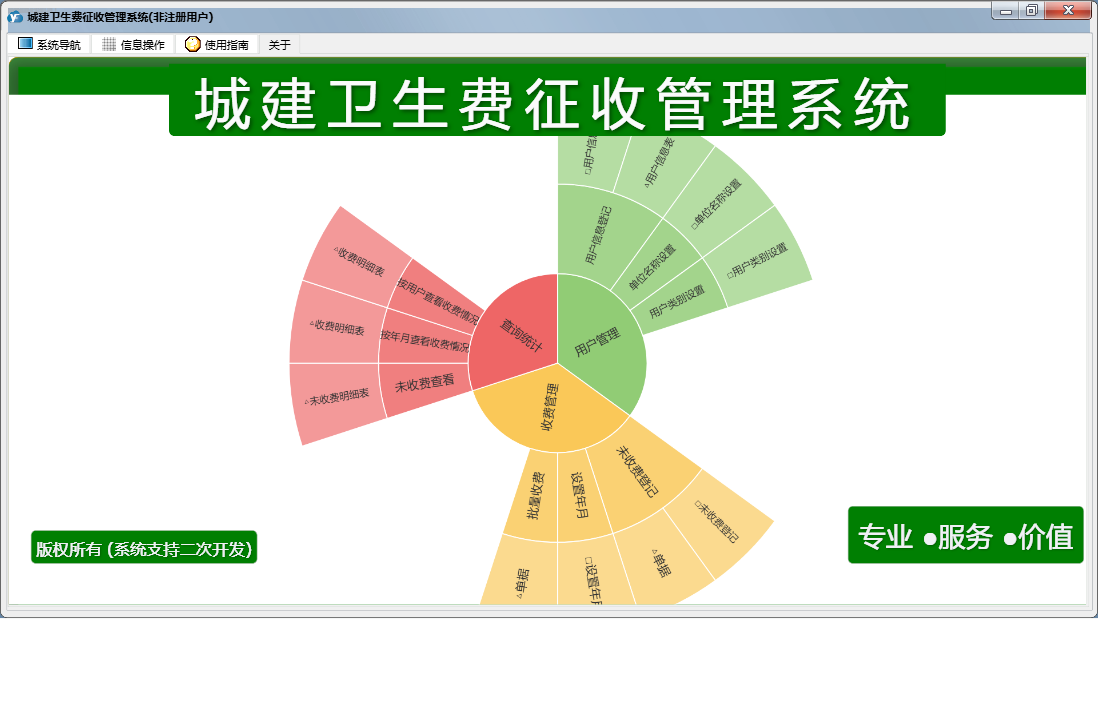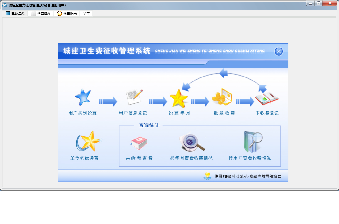 城建卫生费征收管理系统包含以下功能:用户类别设置、面板、设置年月、日志、用户信息登记、单位名称设置、关于、权限设置、未收费登记等