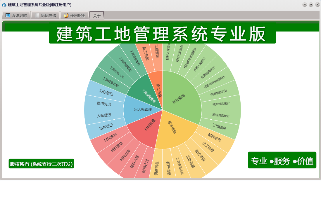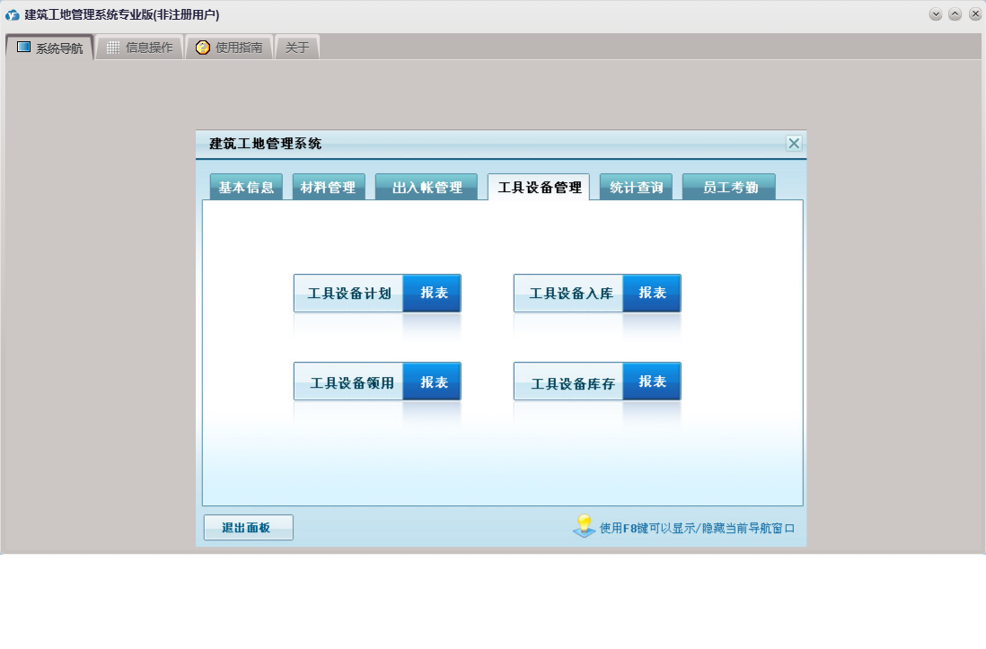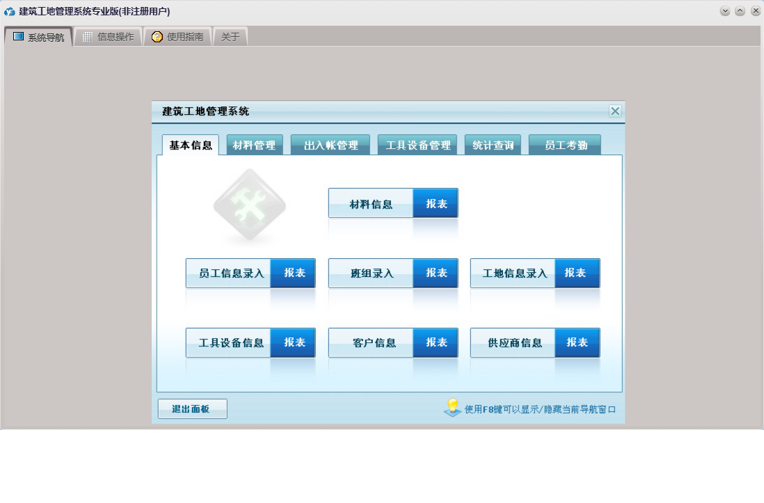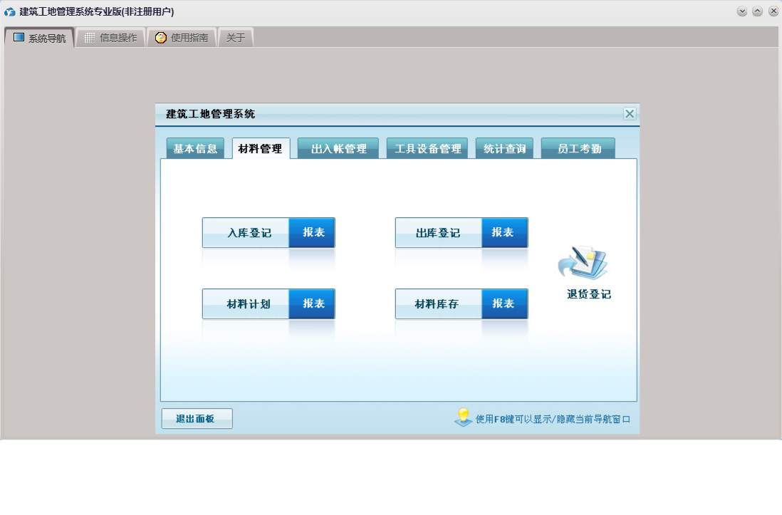 建筑工地管理系统专业版包含以下功能:工具设备计划、员工考勤、材料退货、入帐登记、工具设备管理、归还登记、出帐登记、材料信息、权限设置、统计查询、出入帐管理、费用支出、工具设备领用、材料出库、工地信息、关于、基本信息、材料管理、客户信息、材料入库、材料计划、员工信息、日志、班组考核、工具设备入库、工具设备信息、供商信息等