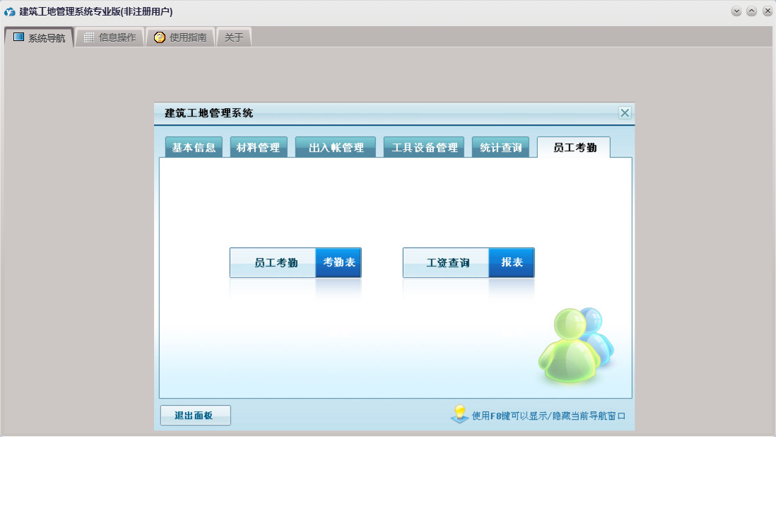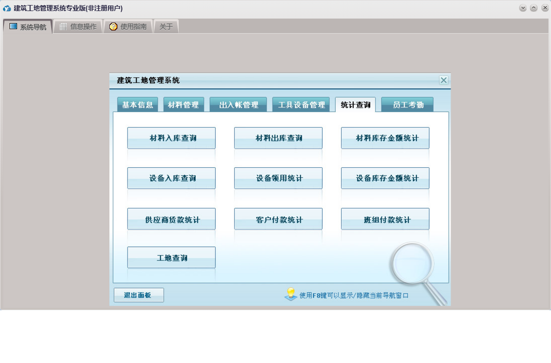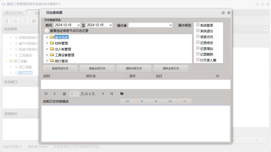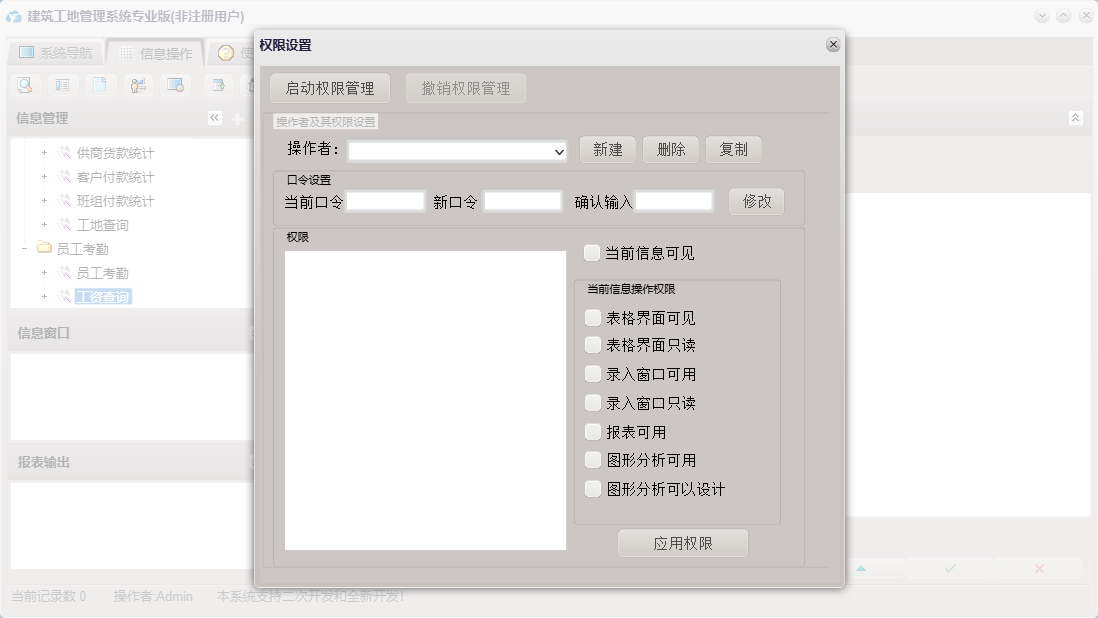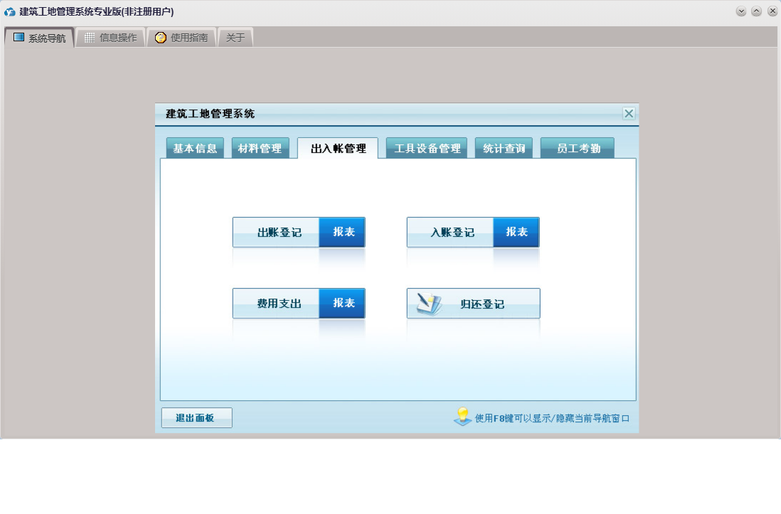 建筑工地管理系统专业版包含以下功能:工具设备计划、员工考勤、材料退货、入帐登记、工具设备管理、归还登记、出帐登记、材料信息、权限设置、统计查询、出入帐管理、费用支出、工具设备领用、材料出库、工地信息、关于、基本信息、材料管理、客户信息、材料入库、材料计划、员工信息、日志、班组考核、工具设备入库、工具设备信息、供商信息等