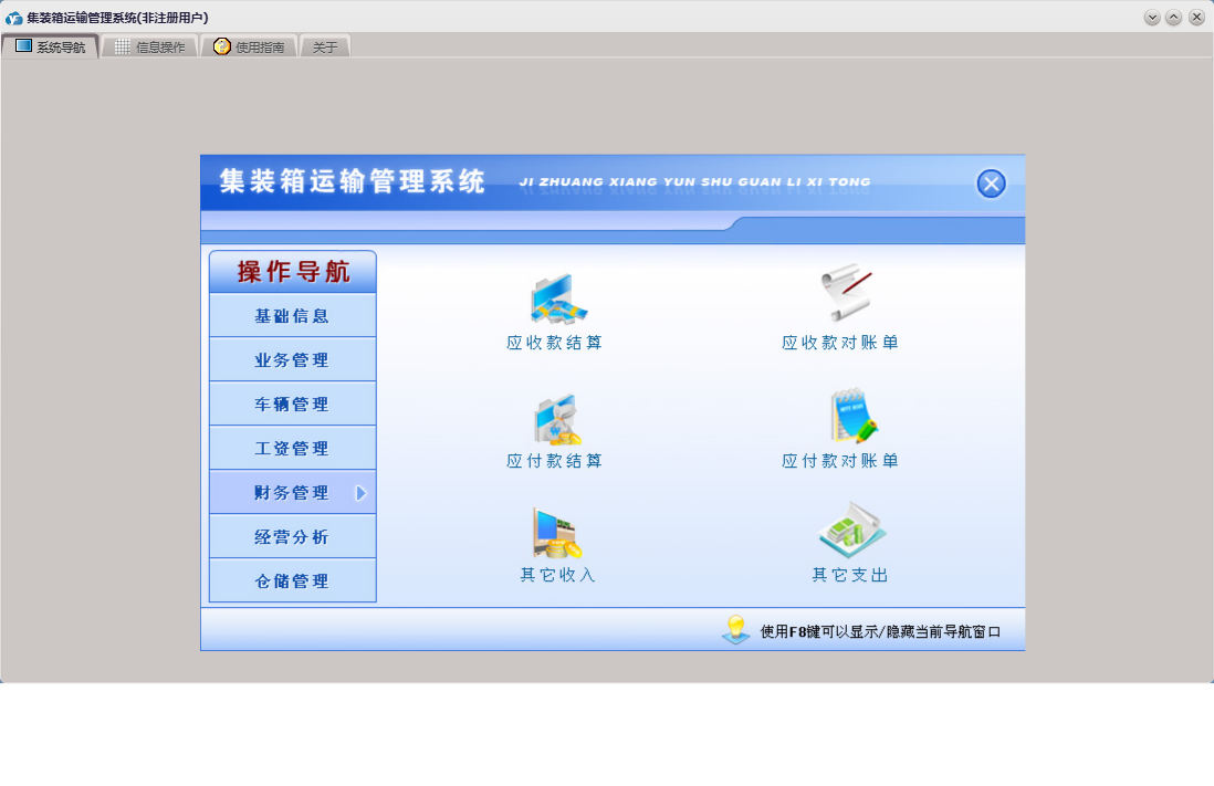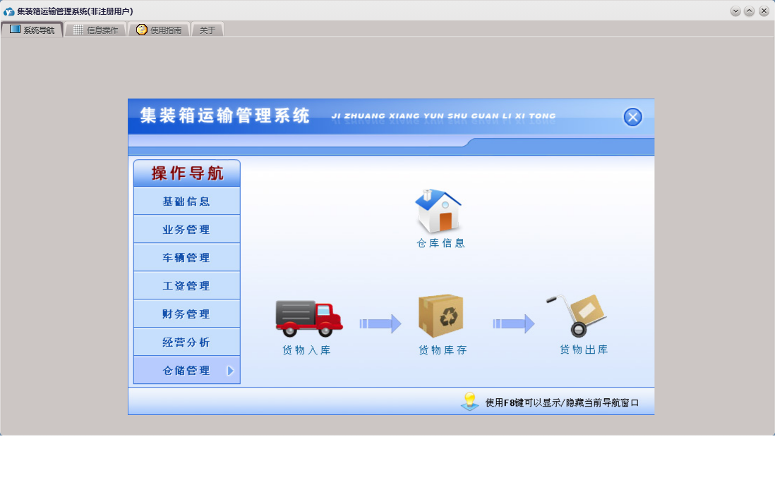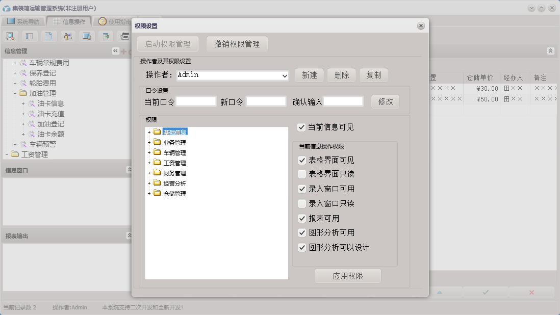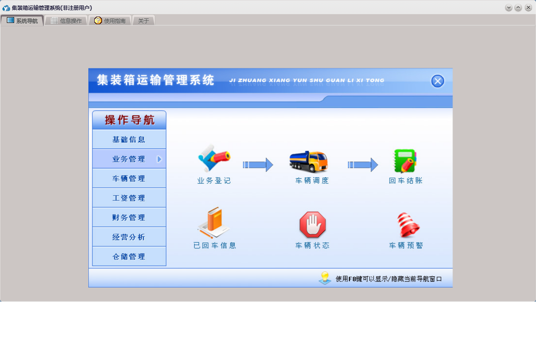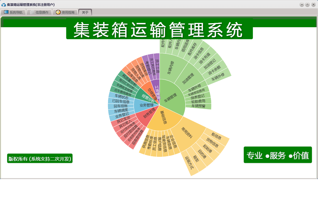 集装箱运输管理系统包含以下功能:轮胎费用、考勤标准、货物入库、配件入库、车辆管理、财务管理、加油登记、油卡充值、起始港、目的港、其它支出、企业信息、保养登记、员工其它费用、权限设置、运输方式、仓库信息、配件信息、工资管理、车辆调度、考勤登记、关于、船信息、应付款结算、回车结帐、客户信息、经营分析、其它收入、货物出库、业务管理、箱型、车辆信息、基础信息、货物信息、员工信息、车辆外修、日志、业务登记、领用退库、车辆常规费用、应收款结算、驾驶员信息、车辆内修、油卡信息、供商信息、仓储管理等